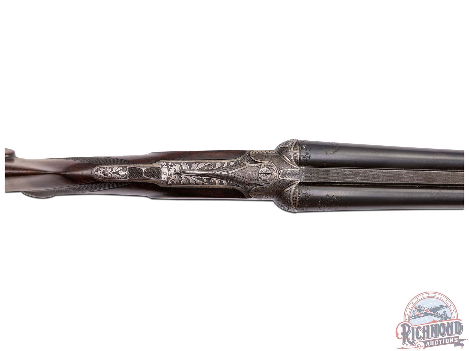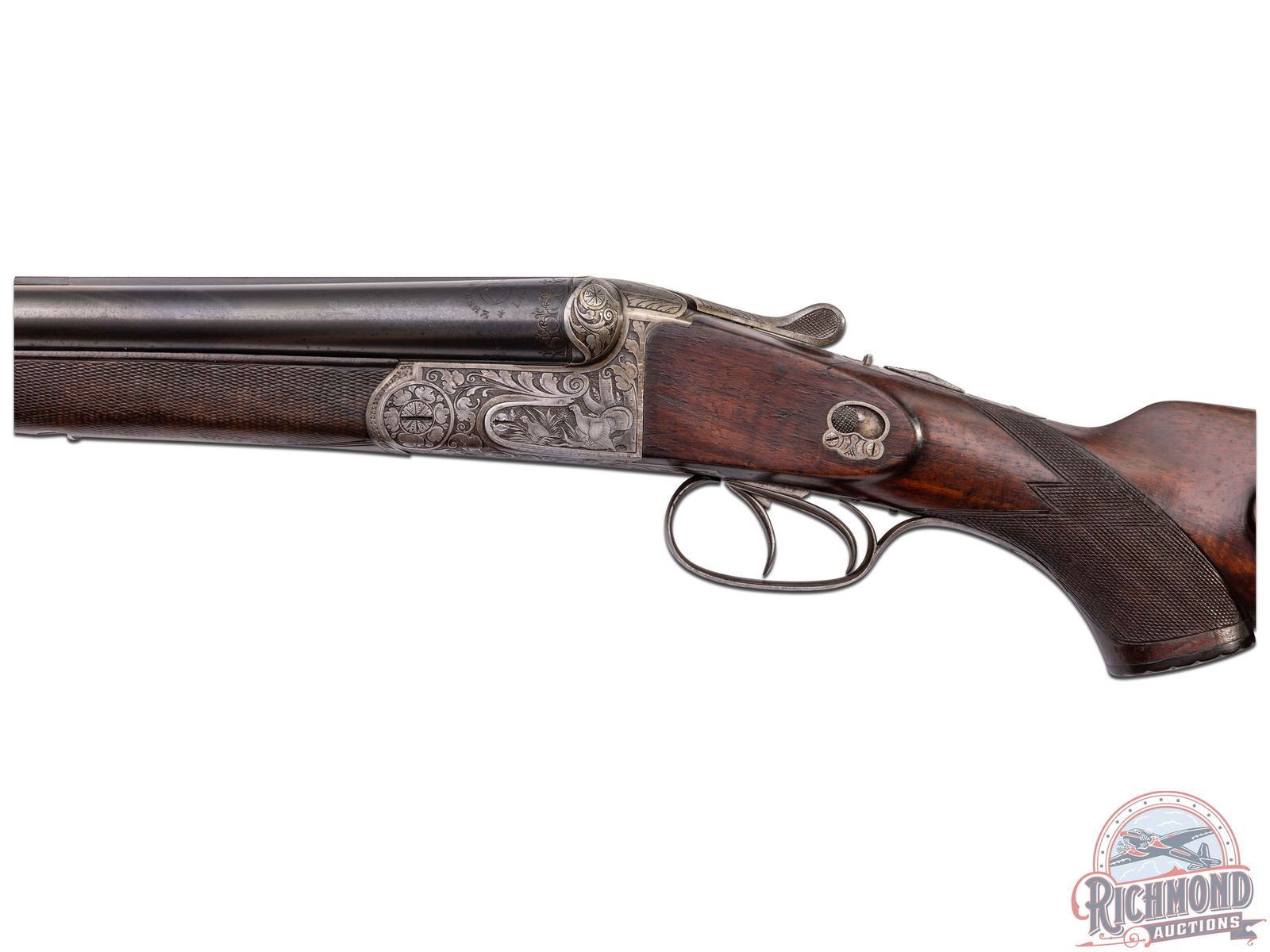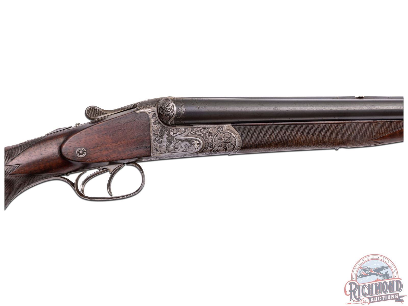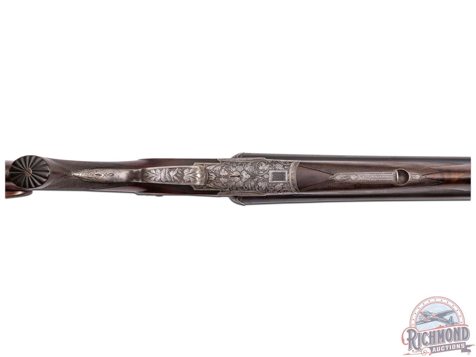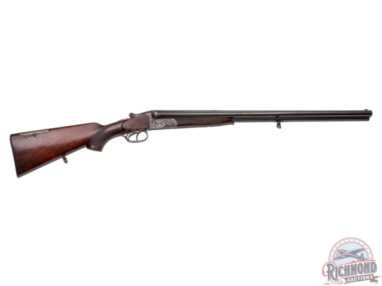 Made in Germany, prior to World War II, circa 1920, by an unknown gunsmith. 26-7/8" blued "Erhhardt Lauf" steel barrels with matted rib, rifle sights, extractors, and sling swivels in 16 gauge SxS shotgun over 9.3x72R caliber rifle barrel. Game scene engraved Blitz action with bird, rabbit, and floral designs with double triggers (front being a set), sideclips, Greener crossbolt and side safety, cocking indicators, and top tang barrel selector. Walnut checkered pistol grip stock with right hand cheekpiece, engraved bullet trap, and horn butt plate and grip cap. Matching walnut checkered splinter forearm with latch release. LOP: 14". DAC: 1-1/2". DAH: 2". CALIBER: 16x16/9.3x72R. S/N: 46360. FFL STATUS: Curio & Relic.