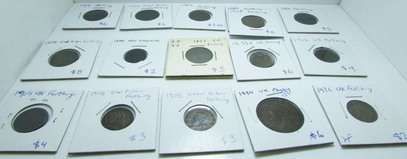 UK - Great Britain - Farthing Coin Collection - 16 Coins - Years Include: 1847, 1936, 1875, 1834, 1918, 1754, 1904, 1908, 1799, 1902, 1844, 1934, 1822, 2 x 1825, 1830 -- Book Value - Over $72