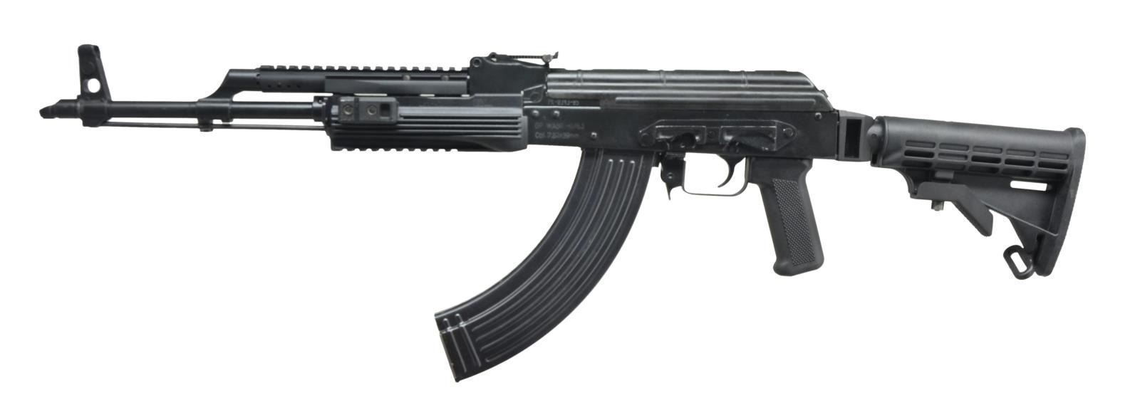 Cal. 7.62x39. S# PK-0343-85. Bbl. 16". Accessorized Romanian AK47 variant as imported through CAI in Georgia, VT. Slant muzzle brake in front of protected post front sight, on board cleaning rod supported w/ bayonet lug. Rear sight adj. from 200-1000m. Black matte finish on all exposed metal surfaces. Left side original style scope mt. Black plastic furniture front & back. 6 Position collapsible rear stock. Numerous picatinny rail elements integrated into handguard assembly. Tapco USA trigger system. MAGS: 1-40 rd. metal; made in China. UNATTACHED ACCESSORIES: spare stock, rear trunnion adaptor, spare top op rod cover w/ handguard, original operators manual in cardboard shipping box. CONDITION: metal finish is correct & complete, thinning only in areas of mechanical intervention. Plastic furniture appears as new. Shiny bbl. w/ strong rifling. Fire control mechanism appears to function correctly when cycled by hand. (21-548/JZ). MODERN. $400-600.