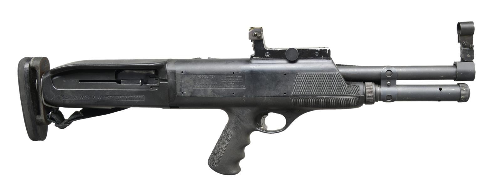 SHOTGUN. Cal 12 Ga. S# A03509. Bbl. 18 1/8". Overall length: 27 1/4". Bullpup design w/ raked pistol grip, Pachmayr solid black Decelerator pad on metal mt. attached to back of receiver. Folding carry handle is removed. Folding covered blade front sight w/ protected square notch rear sight. Full length 4 rd. tubular mag. Left side of receiver has duct tape w/ shot size markings used by previous owner. Black web sling. Introduced in 1967, approx. 18,000 mfg. UNATTACHED ACCESSORIES: green canvas Kolpin zippered gun case of appropriate length. CONDITION: visible metal parts retain 70% finish showing wear & handling marks. Synthetic stock shows scuffs & light wear. Rear sight base shows edge wear & handling marks. Right rear sight guard is bent inwards. Good bright bore. (21-692/DS). MODERN. $700-1,000.
