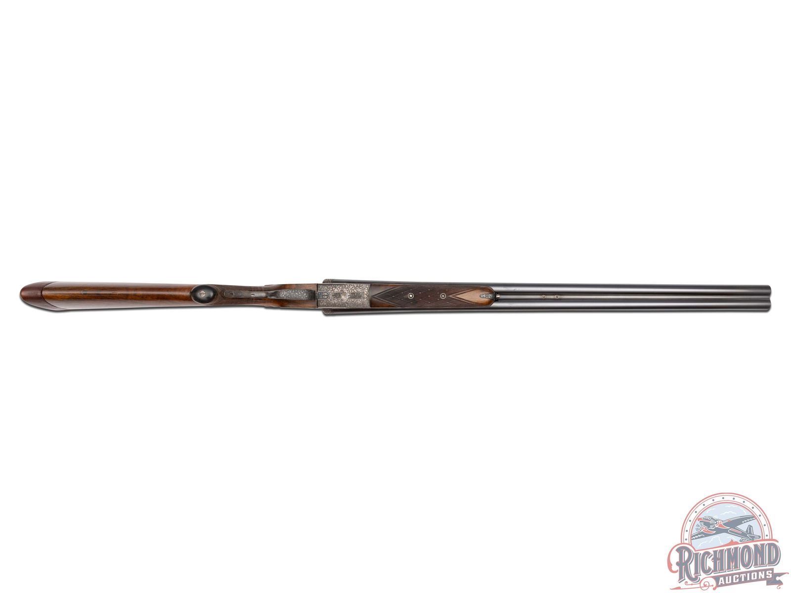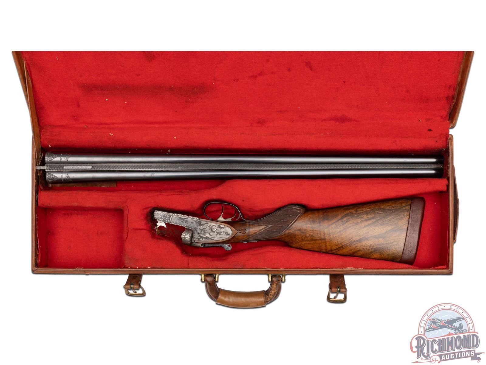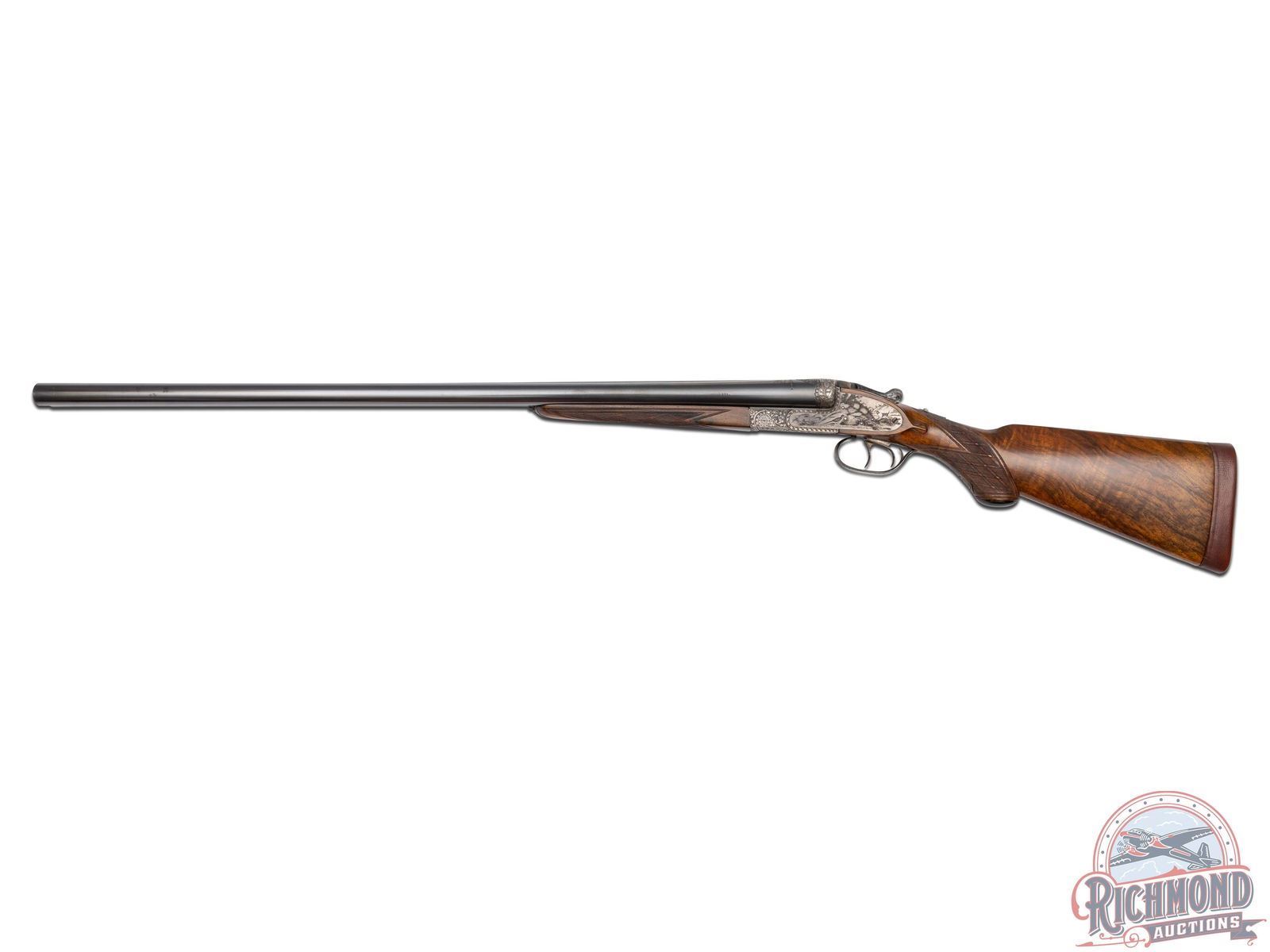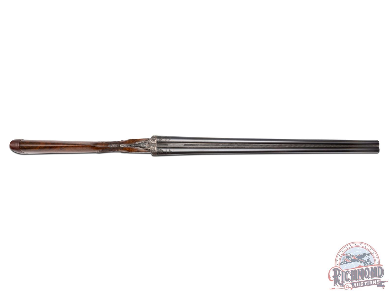 Made in Herstal, Belgium, circa 1920 by Bayard. 27-1/2" Demi-Bloc blued Bayard steel barrels with ejectors, bead front sight, and matted rib marked "Tested for Smokeless Powder". Barrels are 12 gauge with full and modified chokes and 2-3/4" chambers. Barrel breeches are chisel engraved with sideclips. Case-hardened full sidelock with full coverage engraved action with pheasant and dog scene on left and flying pheasant scene on right. Action is marked on left "ANC. ETABL. PIEPER HERSTAL BELCIQUE". Action has Greener style crossbolt with automatic safety, pierced opening lever, and double triggers. Circassian walnut pistol grip stock with skip-line checkering and leather covered recoil pad. Gun has matching walnut skip-line checkered splinter forearm with push button release. Comes with Bayard information and trunk case. Highest grade available at the time. LOP: 14". DAC: 1-1/2". DAH: 2". CALIBER: 12 GA. S/N: 35219. FFL STATUS: Curio & Relic.