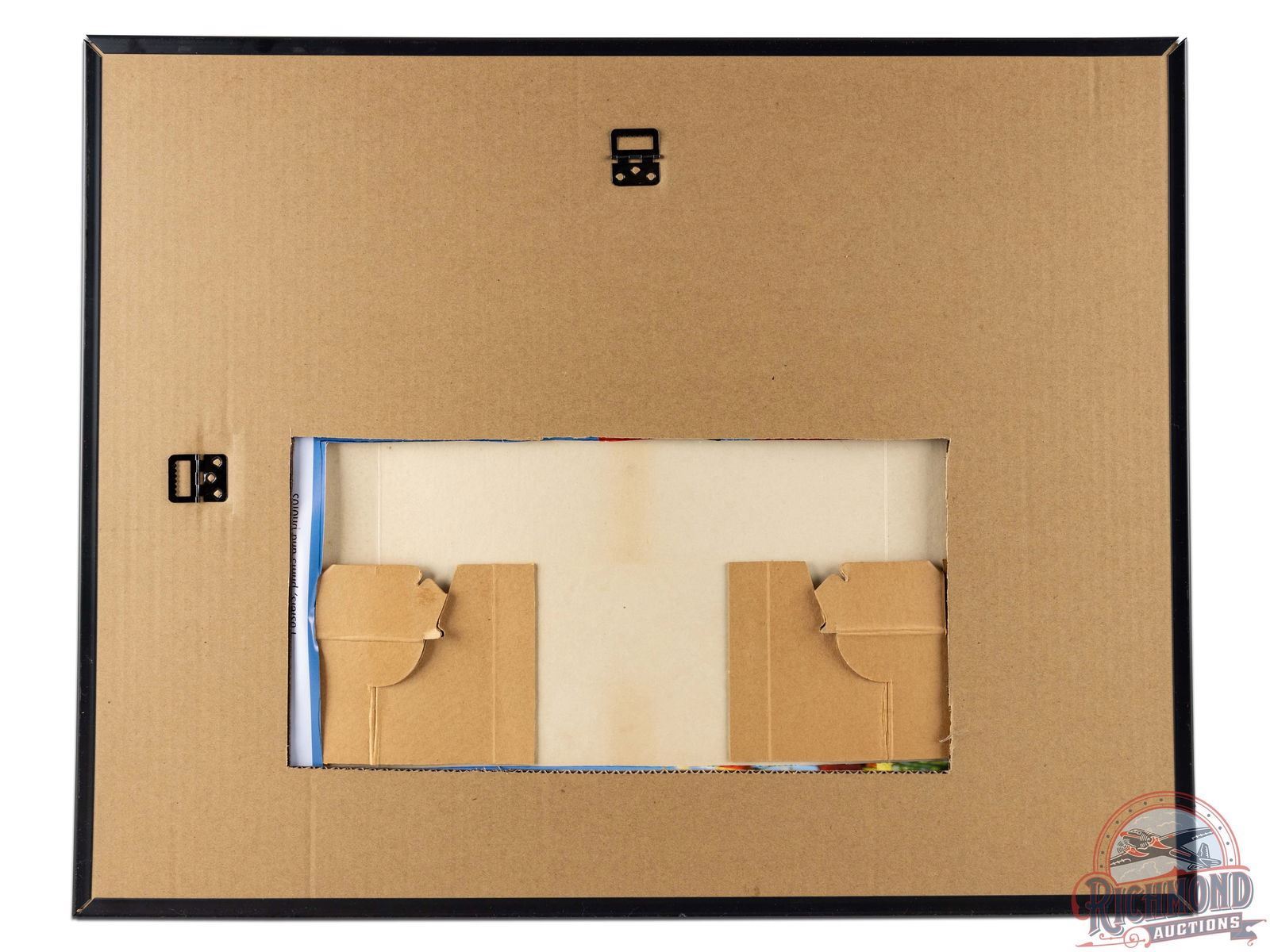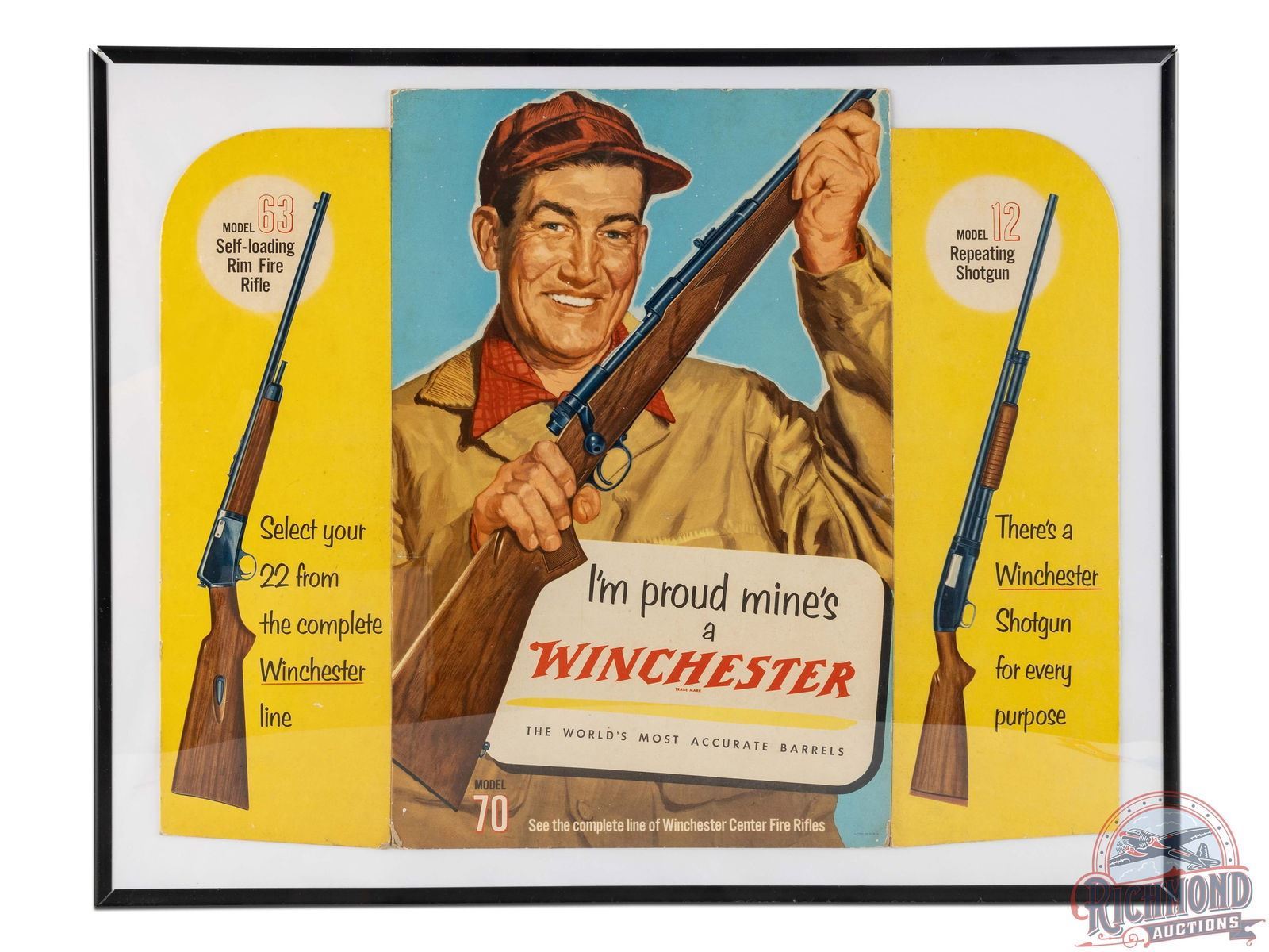 Nice easel back folding cardboard counter sign advertising the Model 63, Model 70 and Model 12. Presents with excellent color, mild corner/edge wear, general surface wear and one slight crease in the top left corner of the center panel. Secured in a new frame with acrylic cover. Marked Litho in USA. 19.75" H x 25" W.