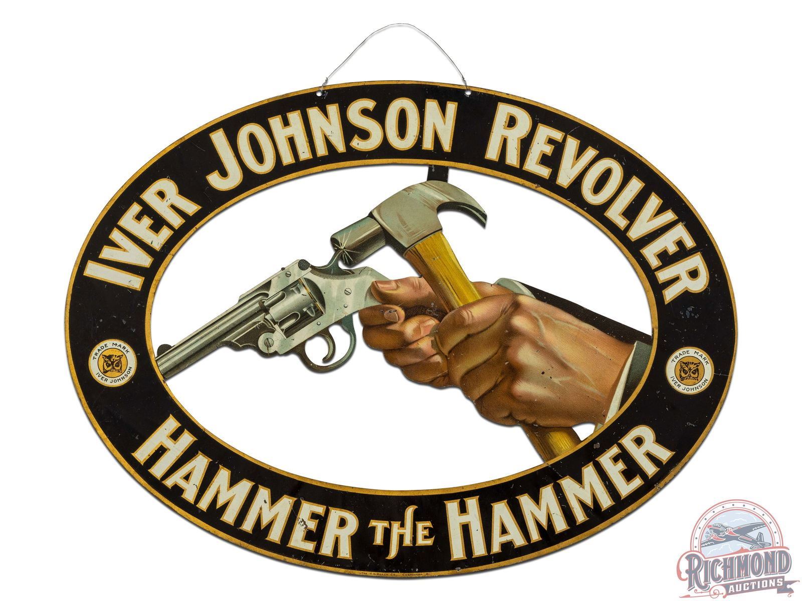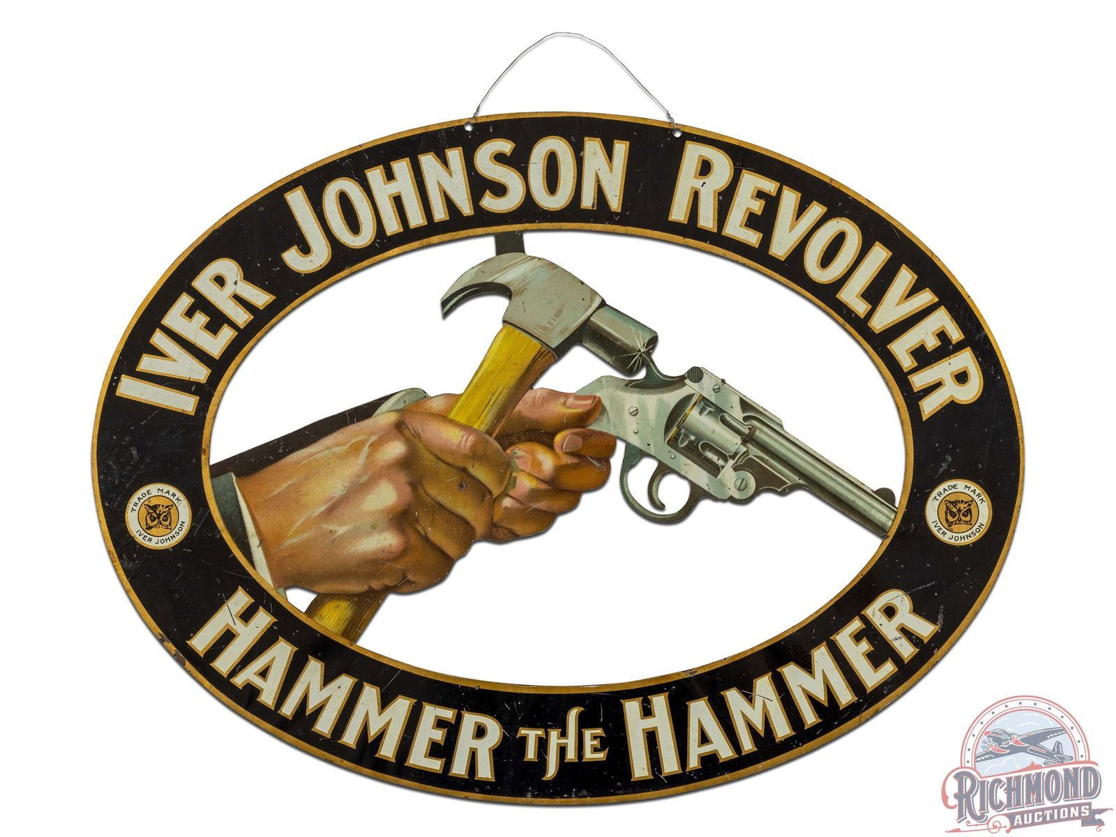 Double sided die cut tin sign has very good color and shine. Features exceptional graphics of a hand holding a revolver and another hand hitting the revolver with a hammer. Both sides are in similar condition and present with faint bends, surface wear and tiny spots of chipping. The sign is intact and appears strong at the weak connecting points. Includes the Iver Johnson owl logo and trademark. One of the most eye appealing firearm signs we have encountered to date. 11.75" H x 15.75" W.