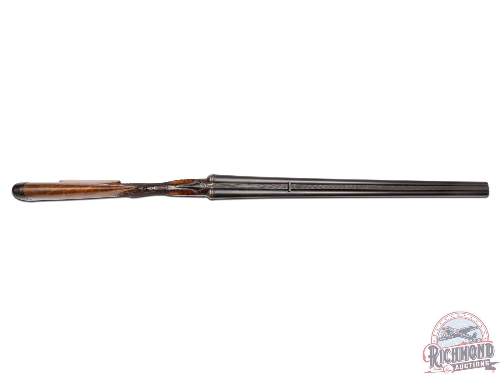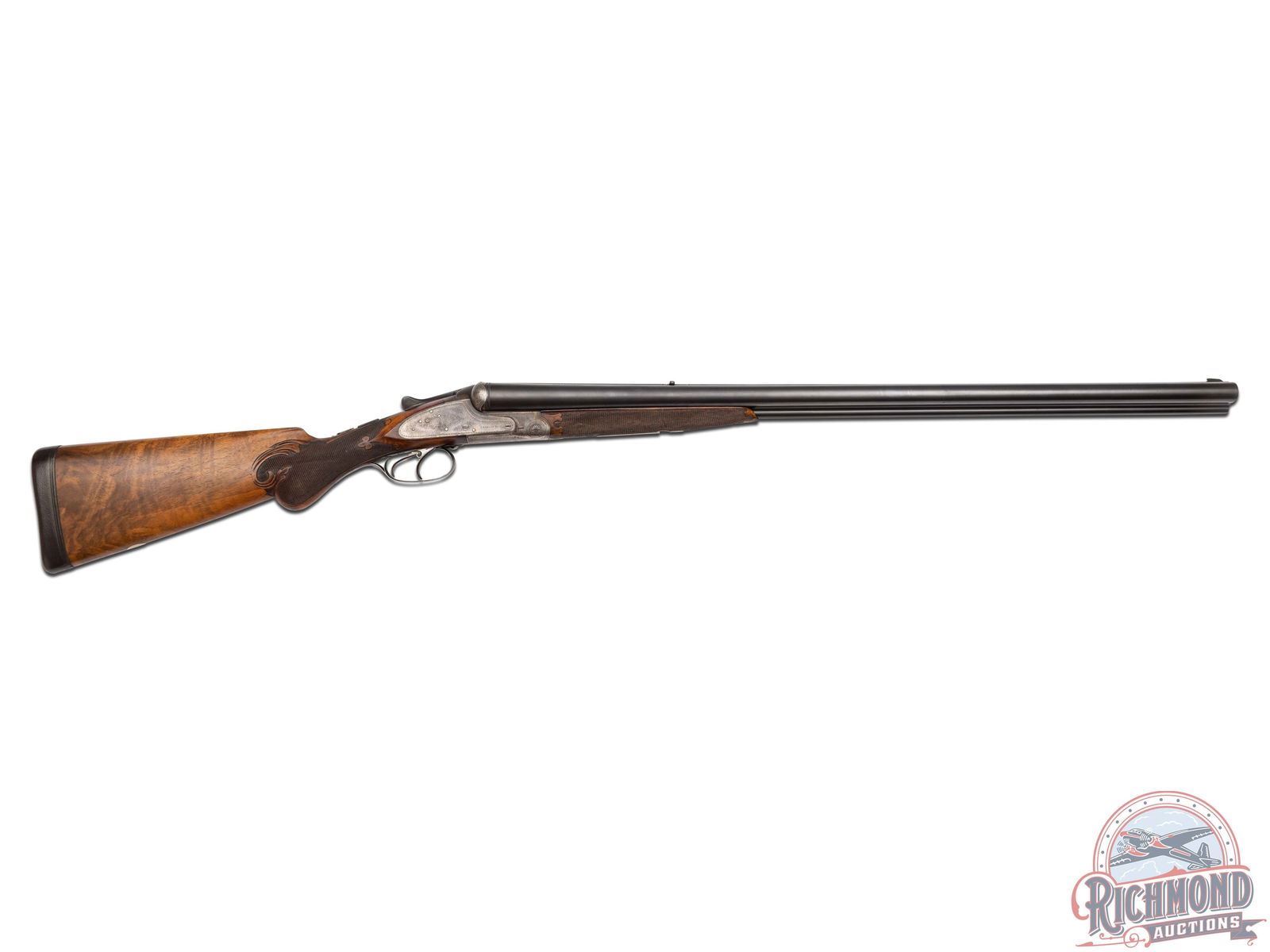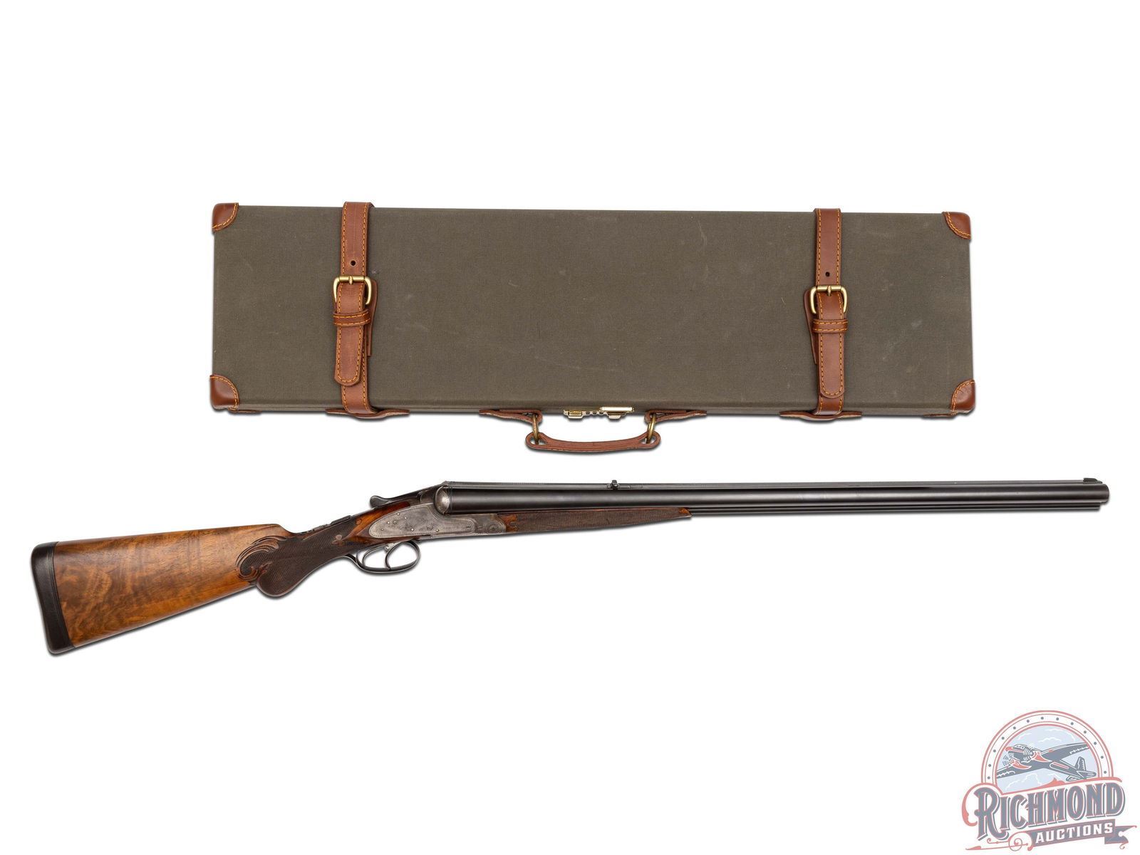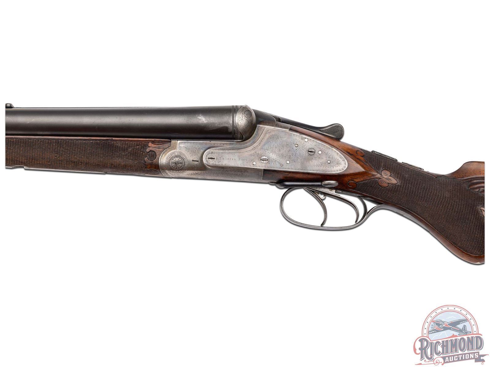 Manufactured for Charles Daly of New York, New York by J.P. Sauer and Son in Prussia in 1908. Features a special order with very rare carved checkering borders. Fitted with 28" Krupp steel barrels with 12 gauge side by side over .30-30 WIN caliber rifle. Barrels have matted rib with steel marking, rifle sights, extractors and "J.P. Sauer and Son" barrel stampings at breech. Case-hardened Diamond Quality sidelock action with scroll engraving, cocking indicators, side clips and Greener crossbolt. Action is marked on each side "Charles Daly" and has blued rifle side cocking lever, tang safety, hidden tang peep sight and pierced double triggers. Select walnut rare checkered round knob pistol grip stock with floral carved border, diamond ebony grip inlay, gold oval vanity plaque, right hand cheekpiece and leather cover recoil pad. Matching checkered splinter forearm with carved borders, ebony inlay and latch release. Comes in a green canvas trunk case with leather straps. Nice quality drilling with special order carved wood feature not often seen. LOP: 14-1/4". DAC: 1-1/2". DAH: 2". CALIBER: 12x12 / 30-30 WIN. S/N: 143180. FFL STATUS: Curio & Relic.