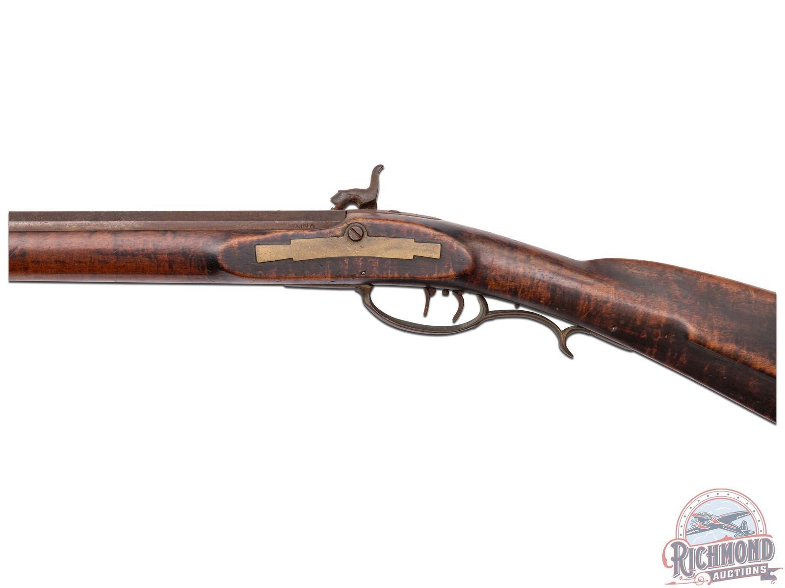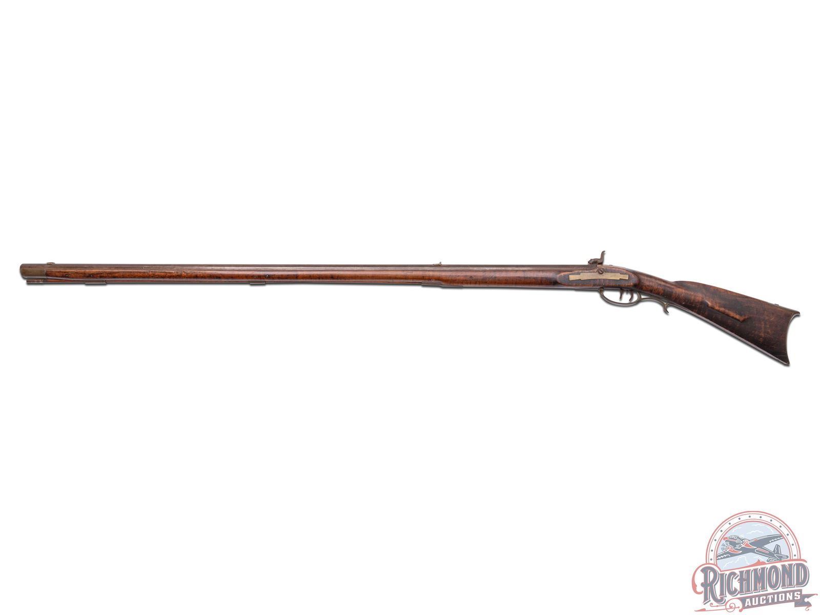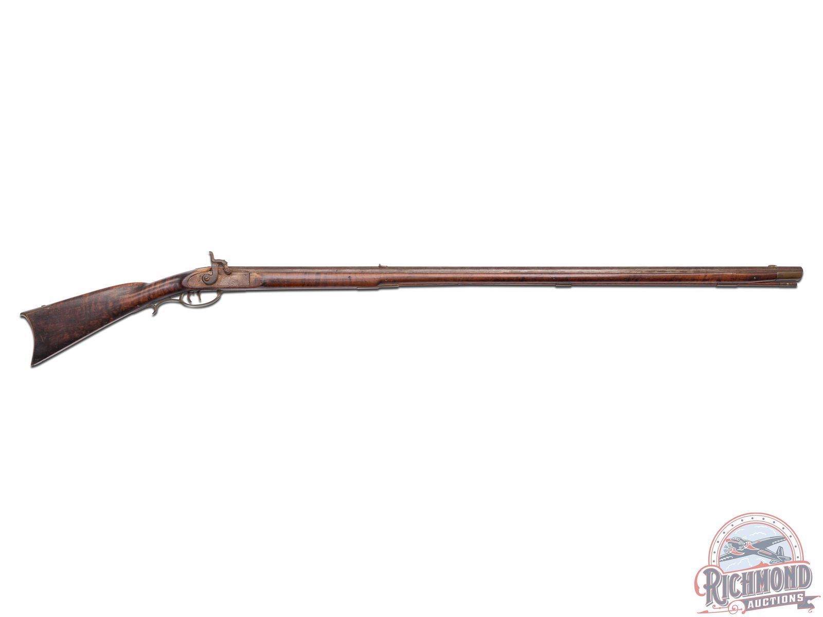 Percussion Kentucky rifle built by John Shell of Dauphin County, PA . Rifle measures 59" overall with a 44" rifled octagon barrel in 45 caliber with rifle sights and stamped "J. Shell" behind rear sight. Unique hand forged percussion lock designed to protect wood from percussion cap burnout. Lock is controlled with double set trigger and has full brass sideplate. Full curly maple stock with "Roman Nose" architecture with cheekpiece and brass hardware. Comes with original threaded metal tip hardwood ramrod. CALIBER: 45. FFL STATUS: Antique.