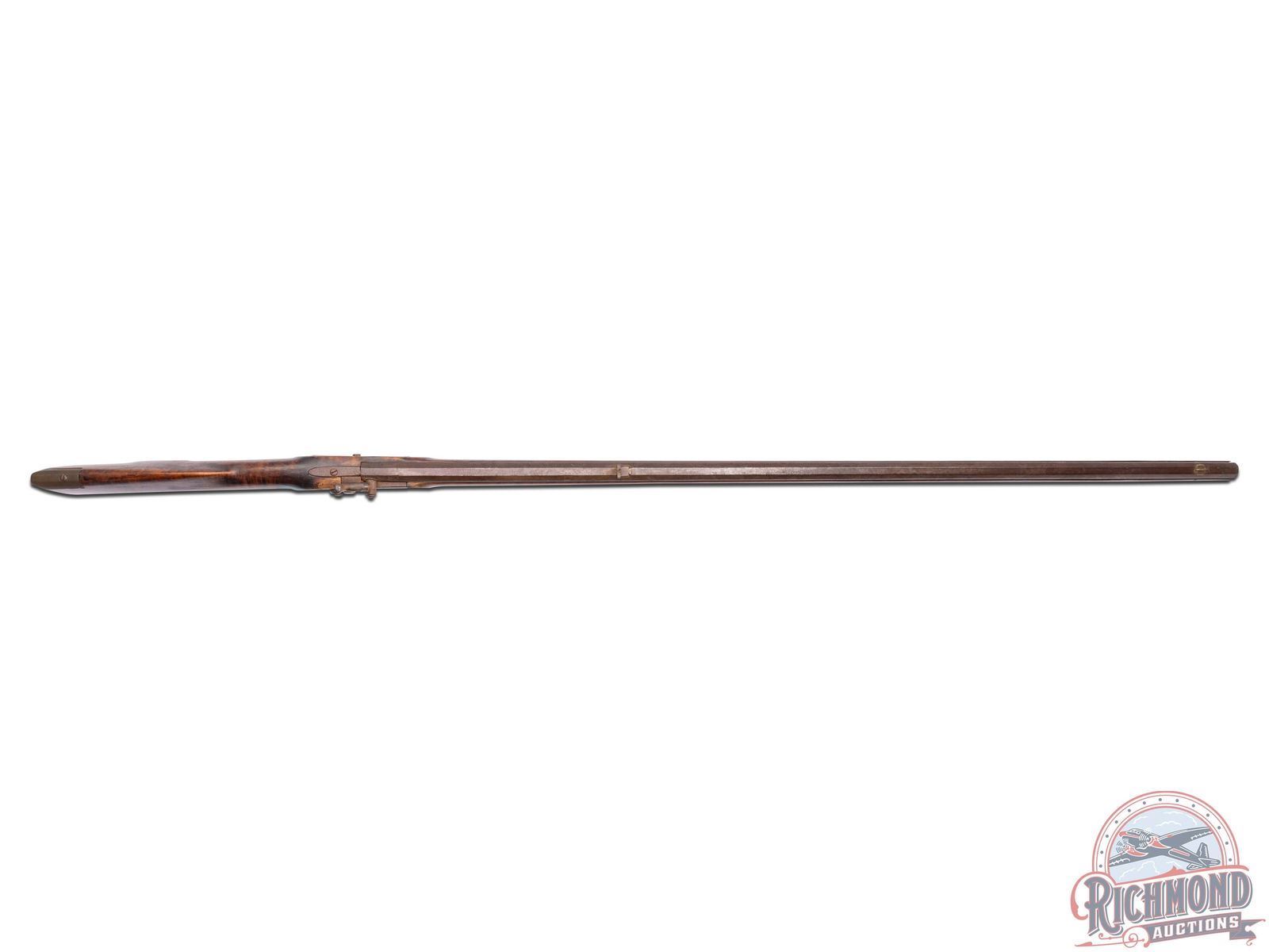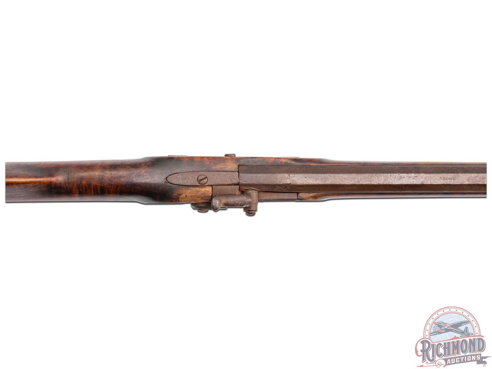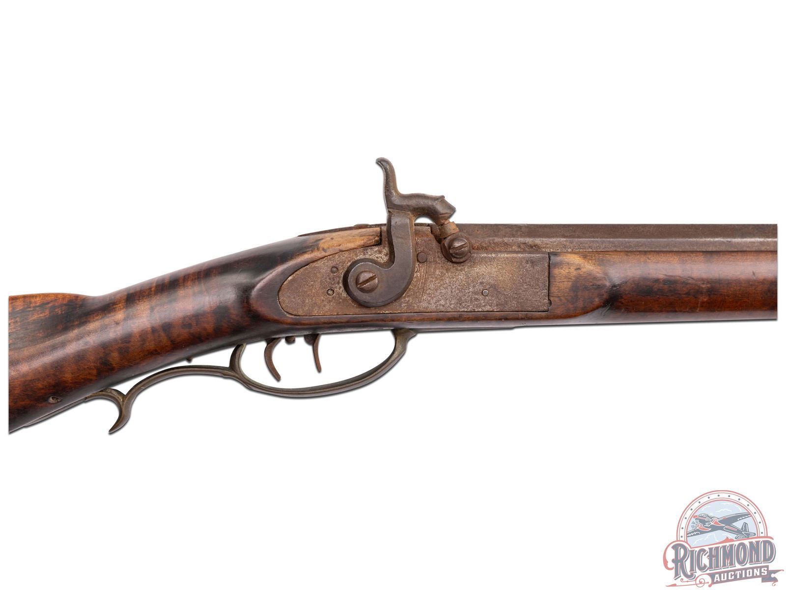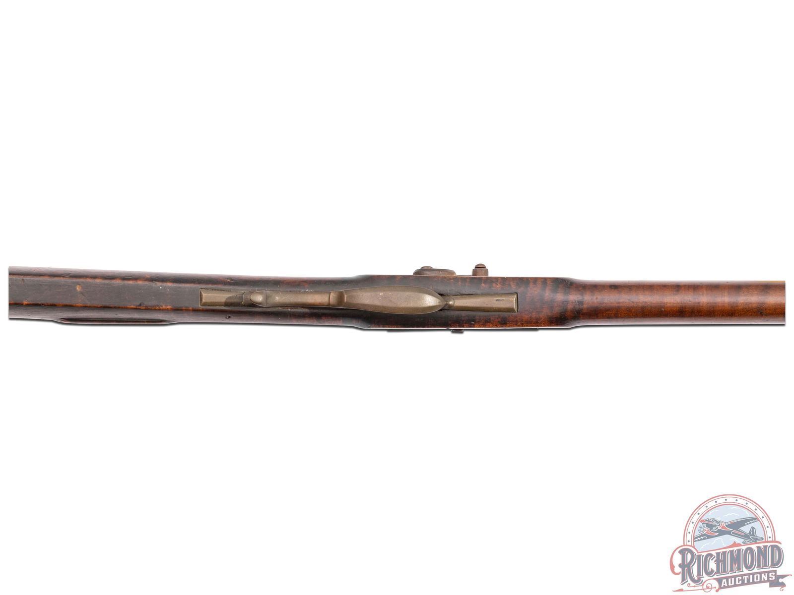 Percussion Kentucky rifle built by John Shell of Dauphin County, PA . Rifle measures 59" overall with a 44" rifled octagon barrel in 45 caliber with rifle sights and stamped "J. Shell" behind rear sight. Unique hand forged percussion lock designed to protect wood from percussion cap burnout. Lock is controlled with double set trigger and has full brass sideplate. Full curly maple stock with "Roman Nose" architecture with cheekpiece and brass hardware. Comes with original threaded metal tip hardwood ramrod. CALIBER: 45. FFL STATUS: Antique.