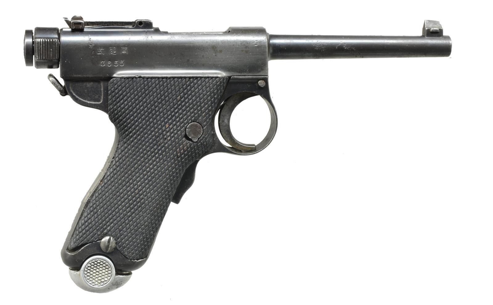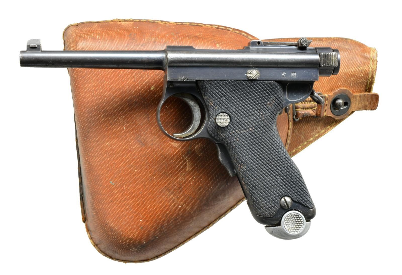 Cal. 8mm Nambu. S# 3655. Bbl. 4.7". Mfg. 1904-1925 & referred to as Model 1904. Larger scaled example of Baby Nambu w/ tangent rear sight, grip safety & checkered hardwood grips. MAGS: 1 fair 8 rd. w/ unmarked aluminum base; S# 4878. Plated w/ scattered pitting throughout body & light marks on base. UNATTACHED ACCESSORIES: formed canvas clamshell holster No. 76791 in ink under cover. Includes cleaning rod. Good solid condition w/ light scratches. CONDITION: good general appearance w/ arsenal like refinish over light pitting. Very good grips. Trigger guard assembly slightly loose when bolt is locked back by mag. Poor bore; worn & pitted. (20-2168/NW). CURIO. $1,000-1,500.