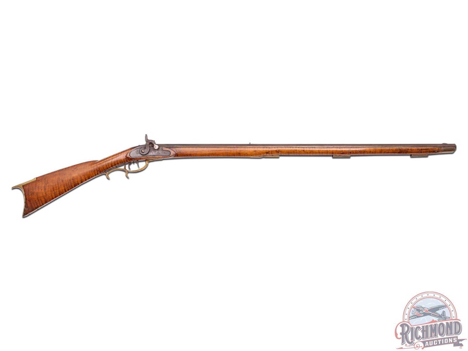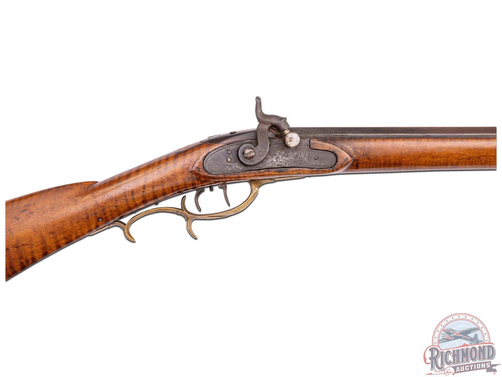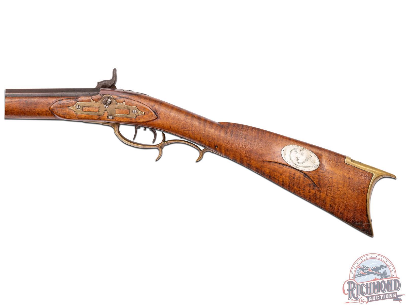 Percussion Kentucky rifle from unknown region and unknown maker, circa 1840, and was found in Somerset, Pennsylvania. Rifle measures 50" overall with 34-3/4" unmarked octagon 38 caliber rifled barrel with rifle sights. Commercial percussion lock held with pierced brass sideplate with double set trigger control. Full curly maple stock with brass hardware and a nicely engraved bird oval coin silver cheek inlay. Rifle is missing ramrod. CALIBER: 38. FFL STATUS: Antique.