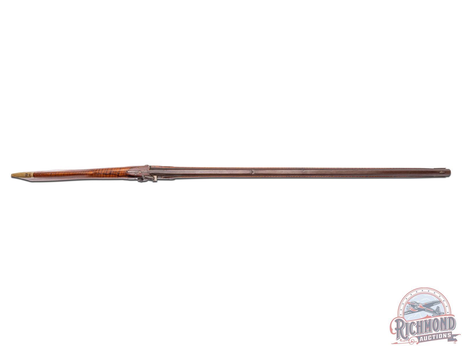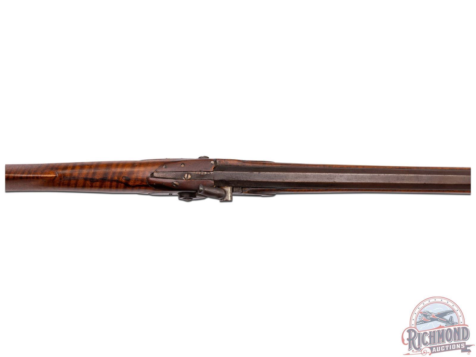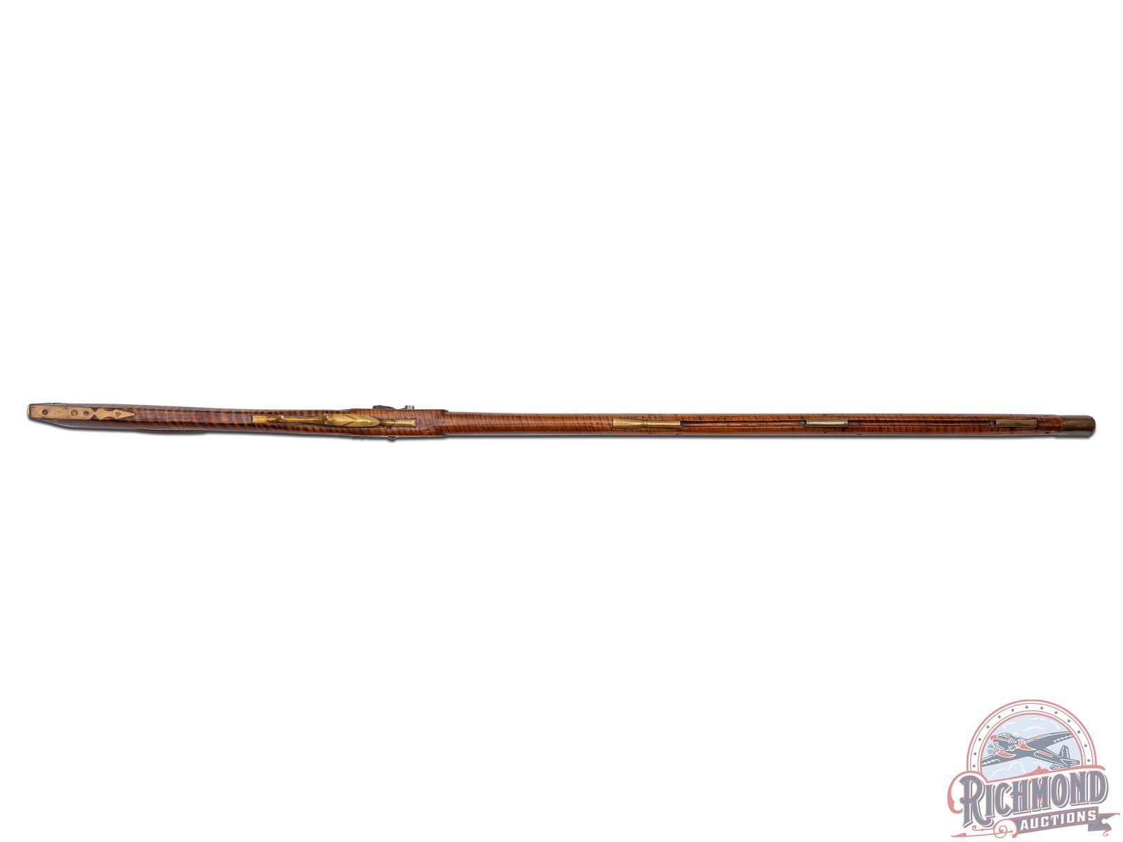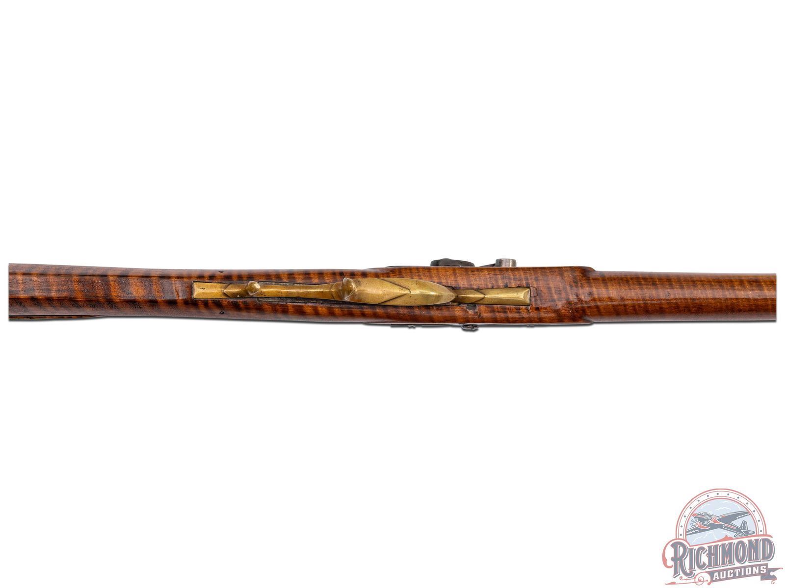 Percussion Kentucky rifle from unknown region and unknown maker, circa 1840, and was found in Somerset, Pennsylvania. Rifle measures 50" overall with 34-3/4" unmarked octagon 38 caliber rifled barrel with rifle sights. Commercial percussion lock held with pierced brass sideplate with double set trigger control. Full curly maple stock with brass hardware and a nicely engraved bird oval coin silver cheek inlay. Rifle is missing ramrod. CALIBER: 38. FFL STATUS: Antique.