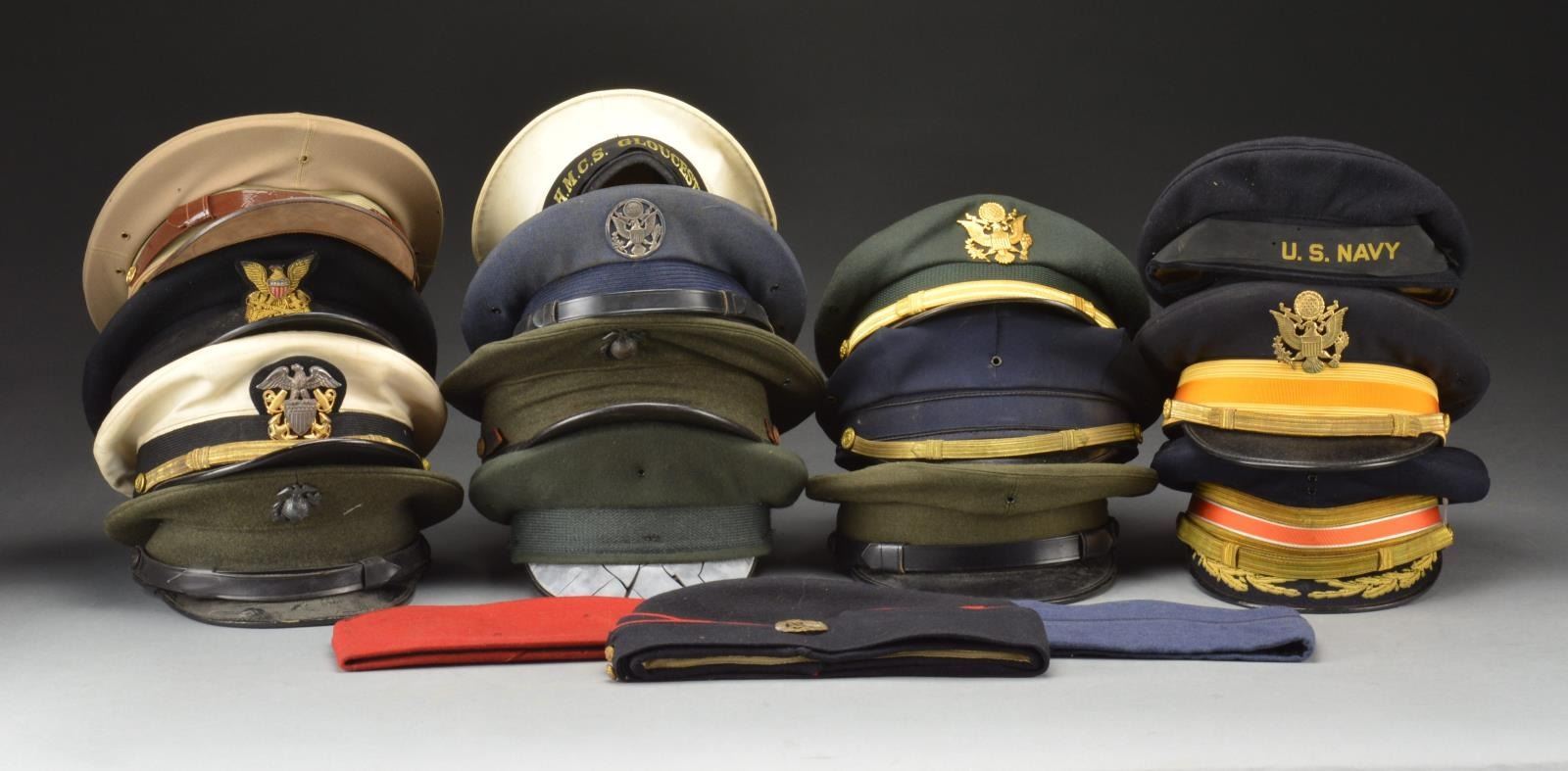 1) 15 HATS. This group of hats includes 2 campaign hats, 1 flight helmet, 8 officers & enlisted visor hats, 2 overseas caps & 2 berets. (02-14372(15)/BF). 2) 54 HATS. This group includes mostly visor hats of the American military w/ a few foreign examples included. There are a few overseas caps, naval “Donald Duck” caps as well as others. There are officer & enlisted caps represented along w/ a few extra covers thrown in. CONDITION: ranges from virtually unused to very well worn w/ the vast majority showing light to moderate wear. (02-14468/BF). $500-800.
