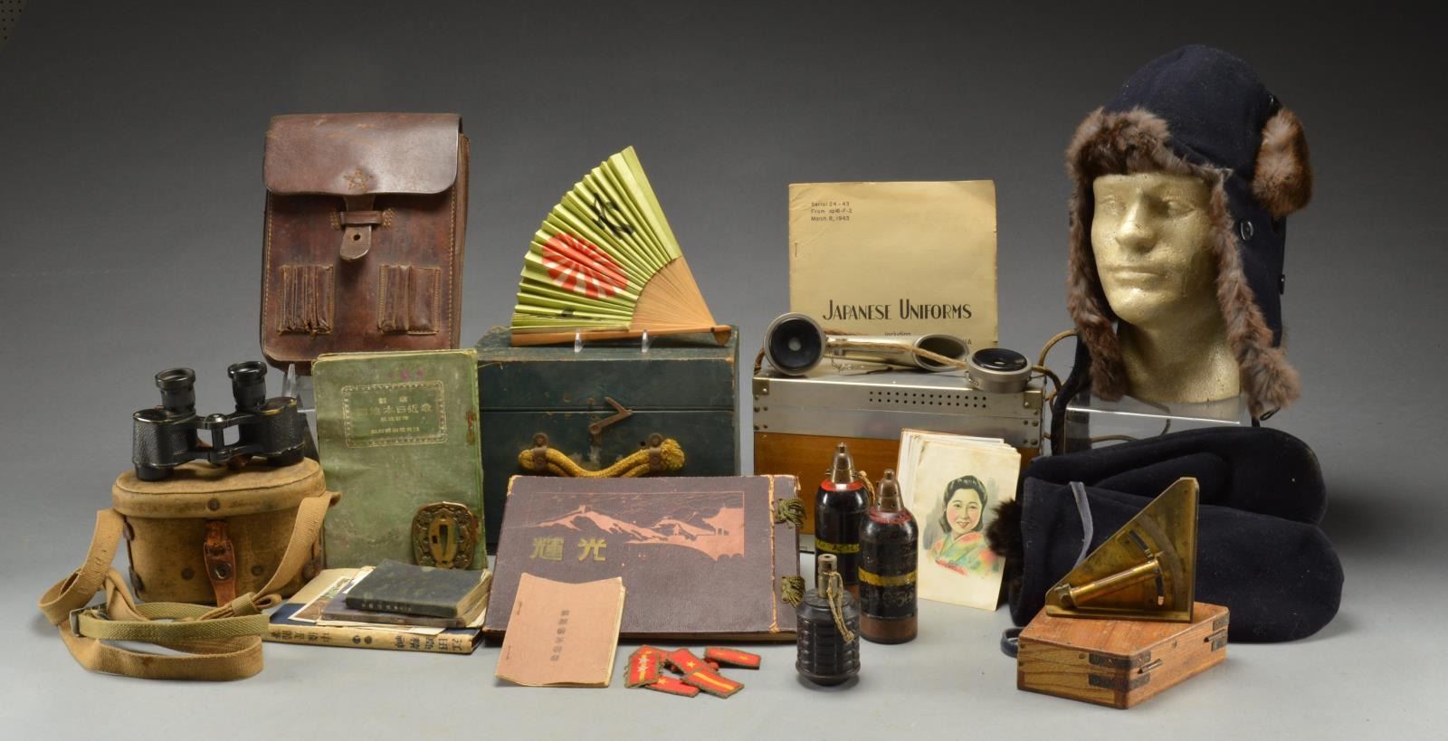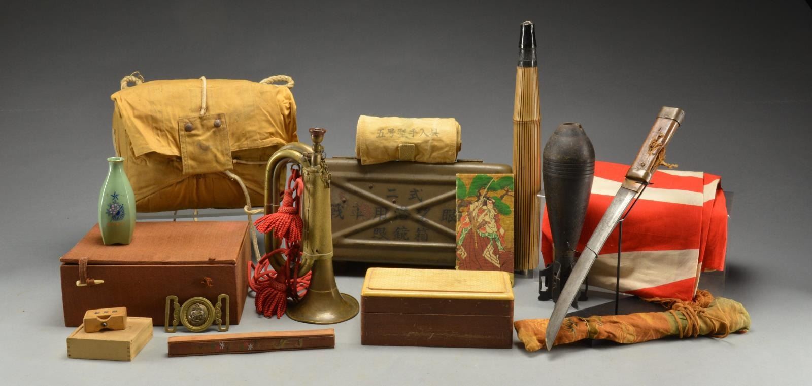 GROUP. This lg. group of Japanese militaria includes 3 pairs of binoculars in tan canvas case. / 2 Brown leather map cases. / 1 Green wooden box having a Japanese label containing 2 mortar rds., a grenade, a bag of coins, a compass & a canvas strap. / 1 Pocket rubberized canvas cartridge pouch in petrified condition. / 1 Japanese radio set having a generator crank on the side. / A lg. variety of Japanese newspapers, pamphlets, photo albums & sm. books. / 1 Winter wool & fur flight helmet & mittens. / 1 Pair of shoes. / 1 Petrified rubber gas mask. / 1 Selection of Japanese military collar tabs. / 1 Package of military cigarettes. / 1 Engineering angle gauge. / 2 Cigarette cases. / 1 Fan. / 2 Sm. collapsible flag poles. / 1 Inside micrometer. / 1 Tsuba. / 5 Nambu bullets. / 2 Safety razors. / Shoelaces. / 1 Compass pouch. / 1 Cotton frog for a bayonet. / 1 Sm. tin holding coins, a pencil, eye dropper & stamps. / 1 Lg. group of Japanese paper money & coins including occupation currency. / 5 Hinumaru style flags. / 4 Rising Sun flag. / 1 Hinumaru flag signed by many GIs. / 1 Silk bag for a samurai sword. / 1 Bamboo umbrella. / 1 Organizational flag. / 1 Sword belt & 2 piece buckle for an officer. / 1 2 Pc. Buckle for a naval officer. / 1 Military sword sash & plain tsuba. / 1 Baby Nambu holster. / 1 Artillery bugle. / 1 Wooden box w/ a rising sun inside possibly cut from a plane. / 1 Bag containing several Japanese medals & decorations including 2 Orders of the Rising Sun & 2 Orders of the Golden Treasure. / 1 Parachute in its original pack. / 1 Original parachute, out of its original pack, partially in a wooden box. / 1 Metal case containing a Japanese ocular sighting device marked, “2X25 / 8X 15 TO(logo)KO NO.636”. / 1 Lg. 24" x 16" green board containing several relics of the war w/ Japan. / 1 Pasteboard box containing an enamel ware Navy mess bowl. /1 Mess tin. / 1 Mortar rd. / 1 Collapsible cooking pot. / 1 Celadon vase. / 1 Tool belt. / 1 Japanese tanto, reportedly used by a kamikaze measuring 17 3/4" overall. / 1 Japanese tanto, measuring 12 1/2" overall in storage mounts. CONDITION: most items, as expected, show light to moderate wear. Some do show heavier wear. Some flags have staining but are generally complete. Paper money & coins have been circulated. Medals do not show damage. (02-14322, 02-14335, 02-14377/BF). $1,400-1,800.