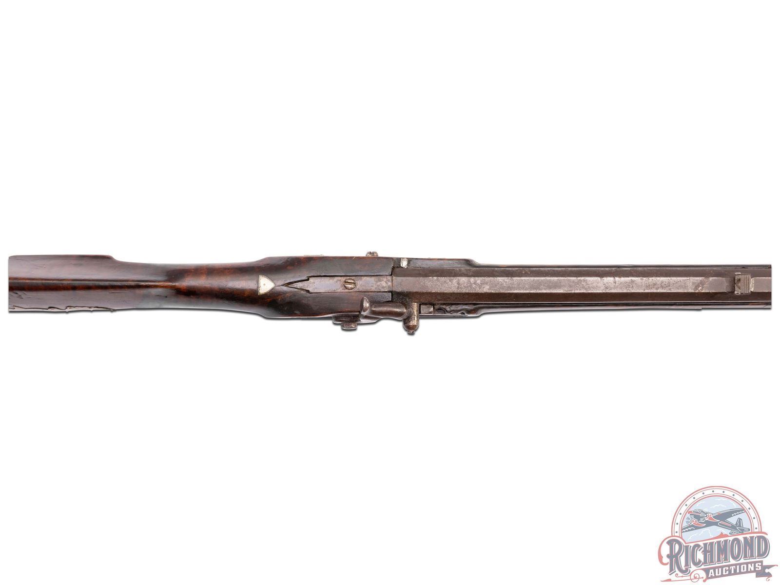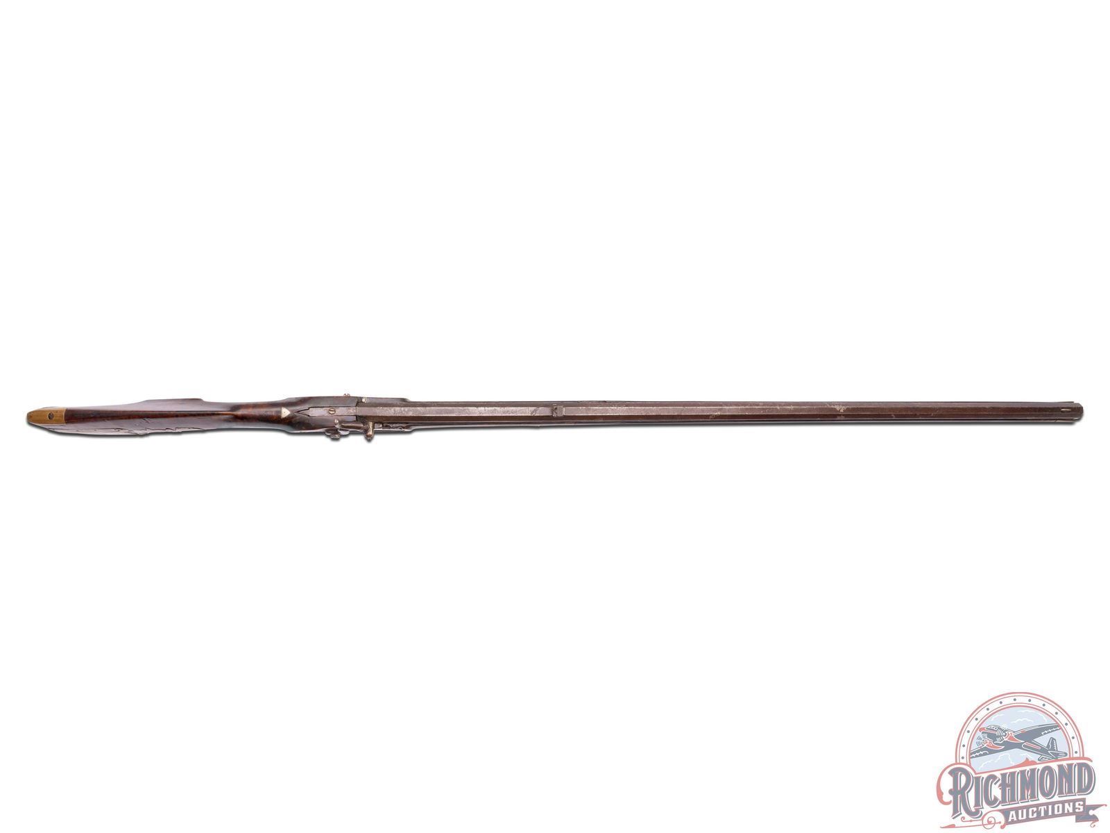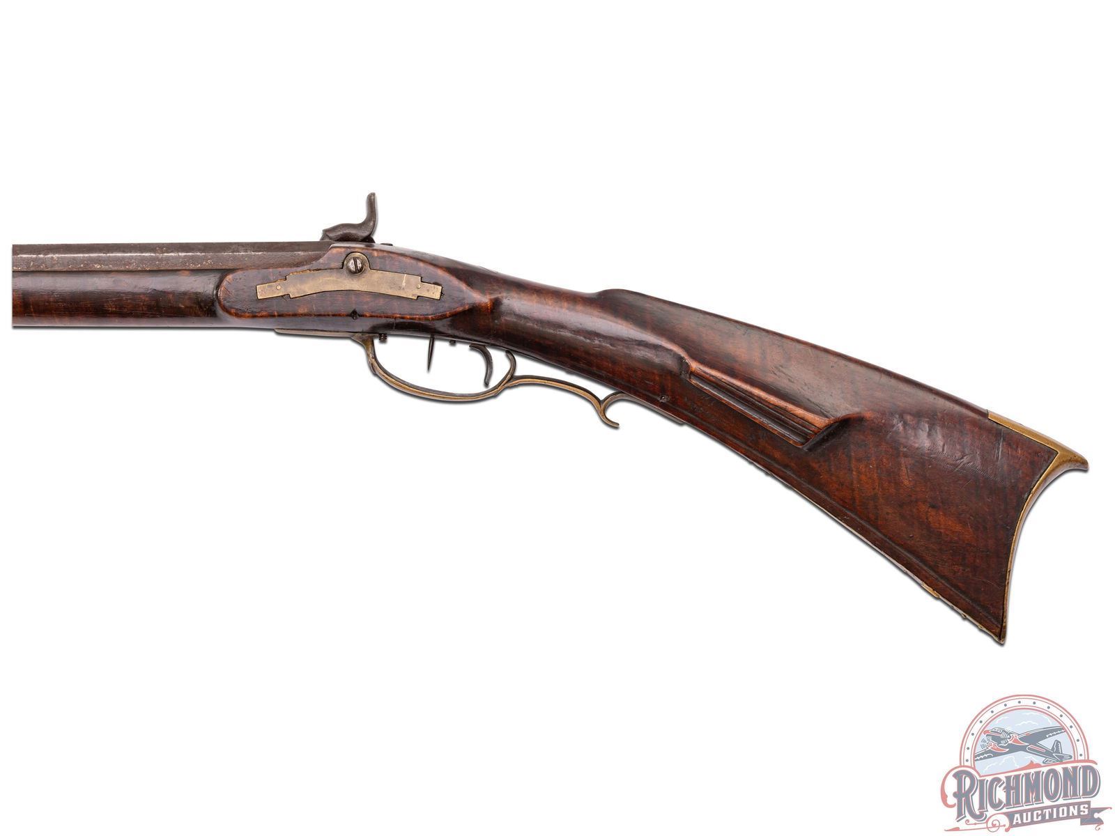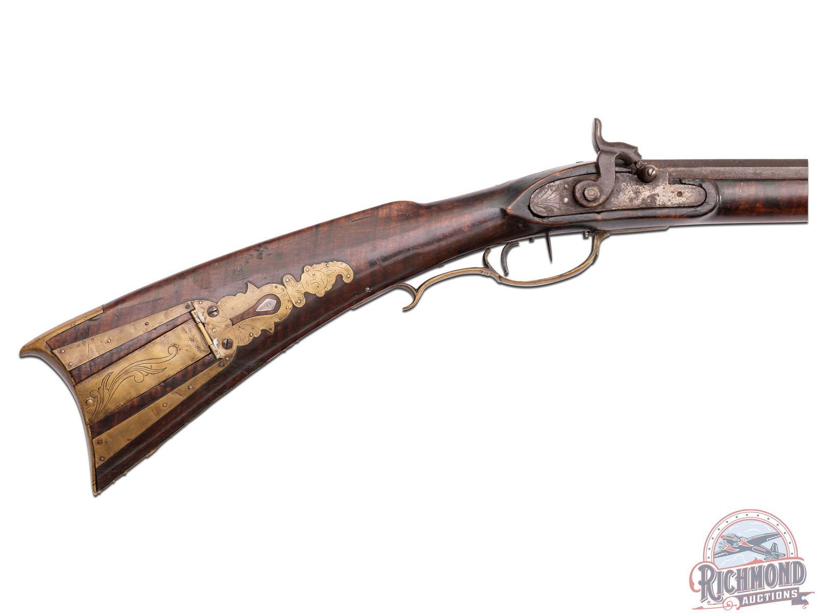 Unique percussion Kentucky rifle attributed to the Lehigh County area of PA., circa 1840. Rifle measures 51" overall with 35-1/2" octagon 38 caliber rifled barrel with rifle sights and typical Lehigh "Double Lines" in front and back of rear sight. Floral engraved percussion lock with double set trigger control. Full curly maple stock with brass hardware including a four piece patchbox with floral engraved lid, bone toe plate release button and unique "Liberty Cap" or "Indian" finial. Stock also has silver diamond inlay and two brass diamond forestock inlays. Comes with original hardwood ramrod, in poor condition. CALIBER: 38. FFL STATUS: Antique.