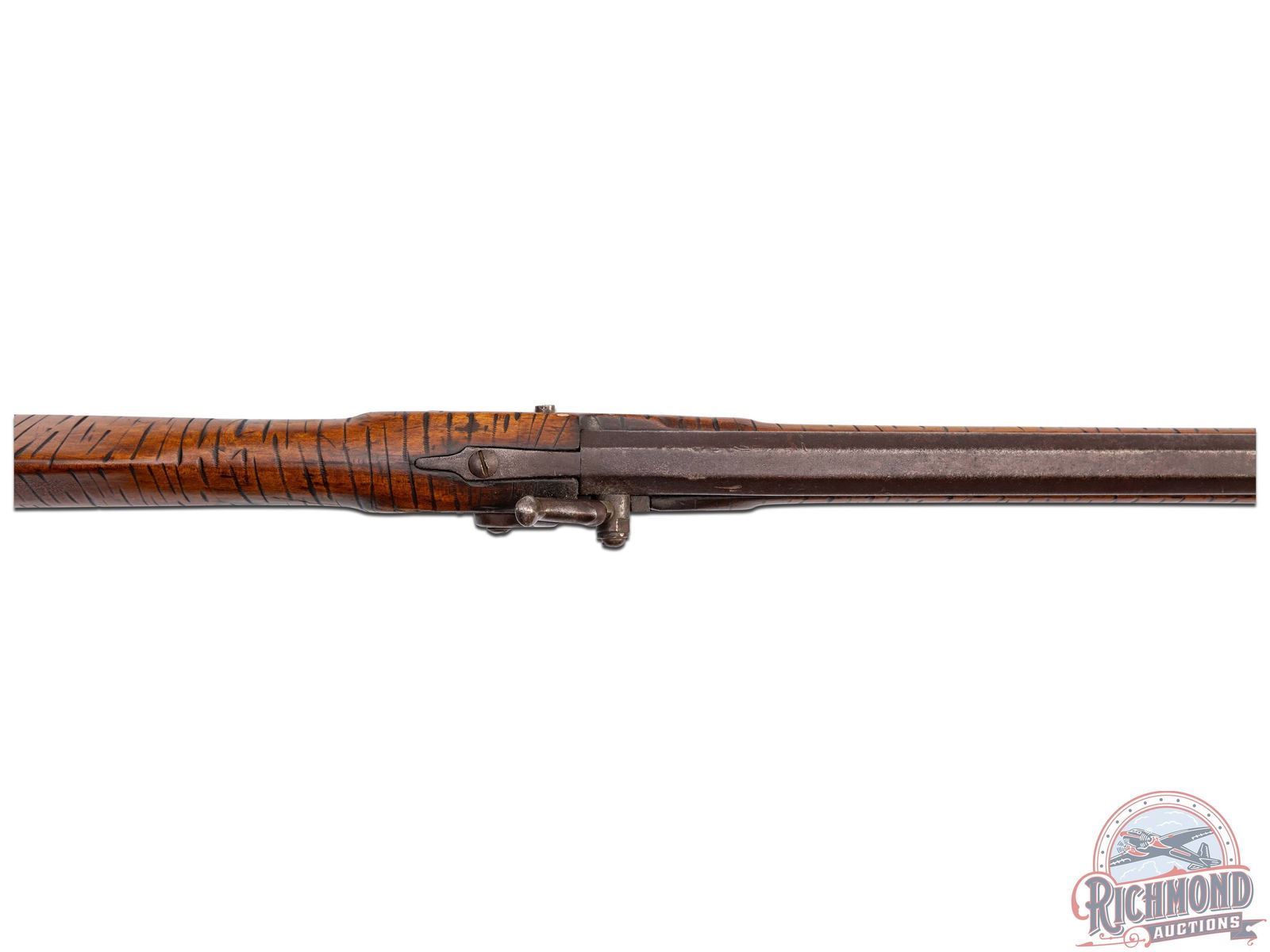 Percussion Kentucky rifle attributed to the Lehigh County area of Pennsylvania, circa 1850. Rifle measures 53-1/2" overall with a 38-1/2 " octagon 45 caliber smoothbore barrel. Barrel is unmarked with rifle sights. Rifle has a George Golcher marked percussion lock with single trigger control. Full plain maple stock with unique "Gouge" type decoration that appears to be done to simulate curly maple striping. Stock has brass hardware including two piece brass patchbox with release in butt. Comes with striped hardwood ramrod with gunsmith made worm attachment. CALIBER: 45. FFL STATUS: Antique.