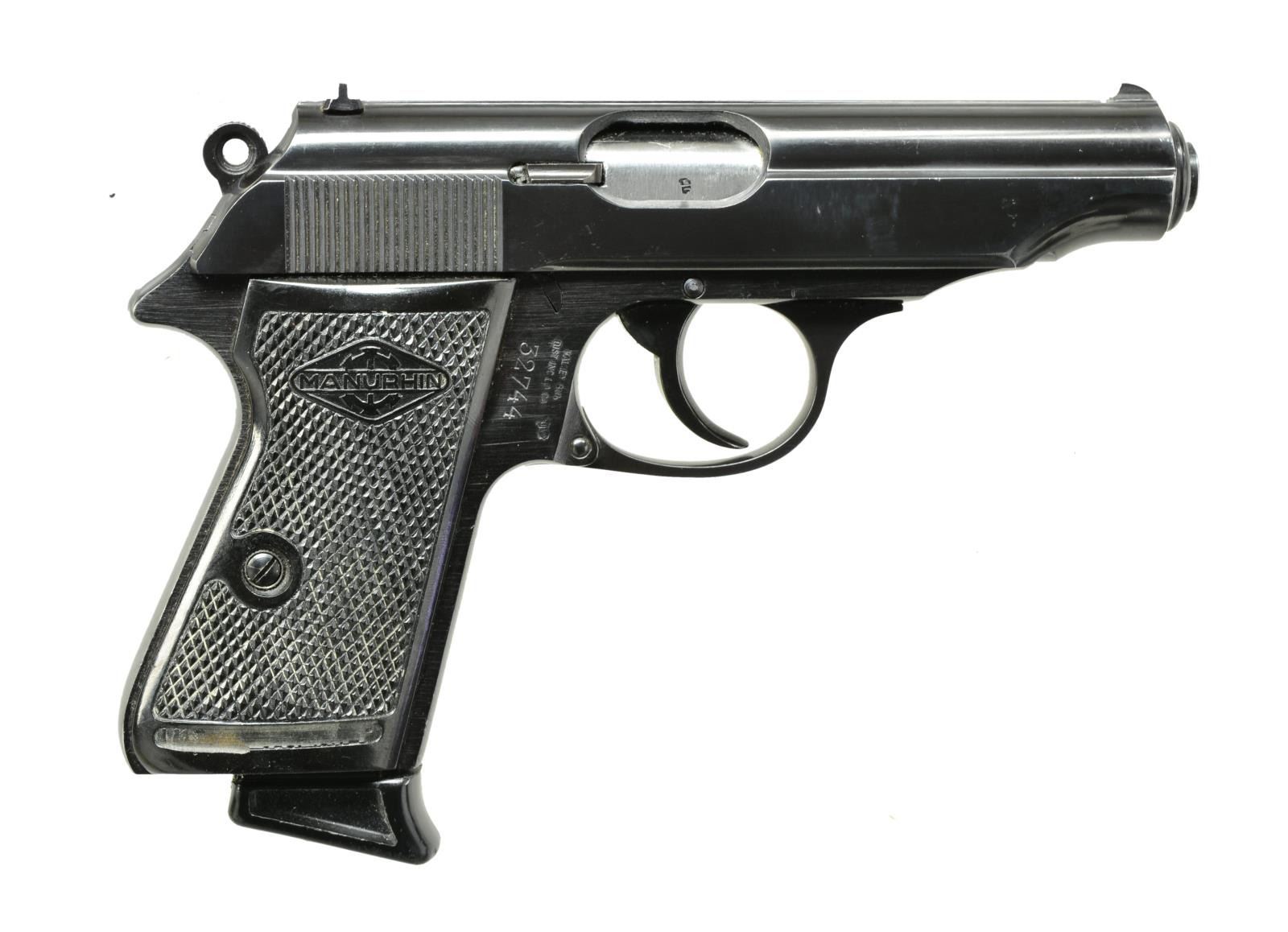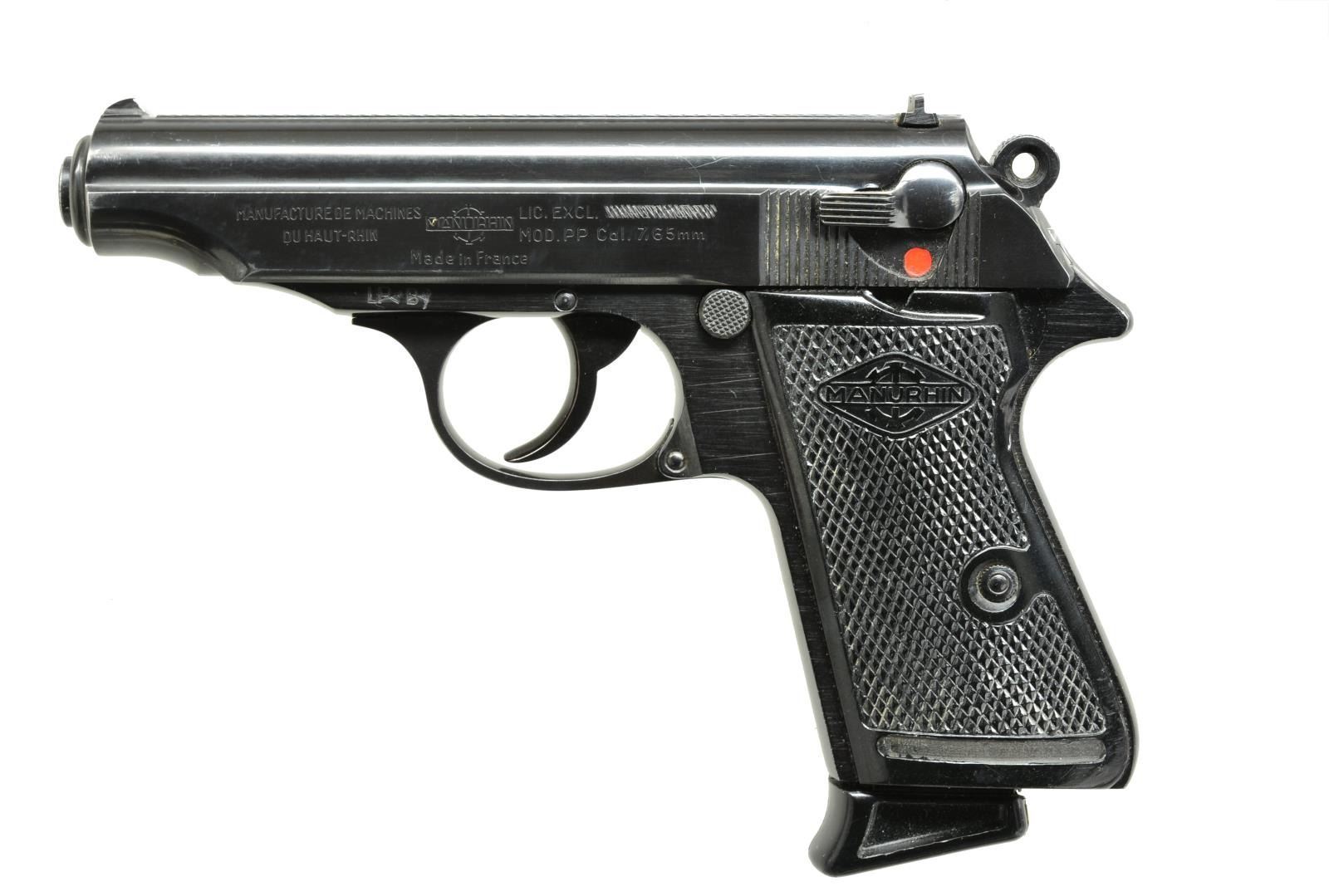 Cal. 7.65mm. S# 32744. Bbl. 3 7/8". The Manuhrin Model PP was made in France under license on original Walther machinery. Hard rubber checkered grips. Standard sights. MAGS: 1 w/ correct markings & extension. UNATTACHED ACCESSORIES: Manhurin box for Pistolet PP. Box lid has heavy duty tape w/ black marker numbered to match pistol. Box is in fair condition. CONDITION: fine. Retaining approx. 90% original blue. Markings on slide partially blanked out. New marking on left side of frame "LP-B4". Also stamped over w/ slash mark. Importers mark on right side of frame. Legend on bottom of grips removed. Bright shiny bore. Mechanically good. (21-1115/MGM). MODERN. $400-550.