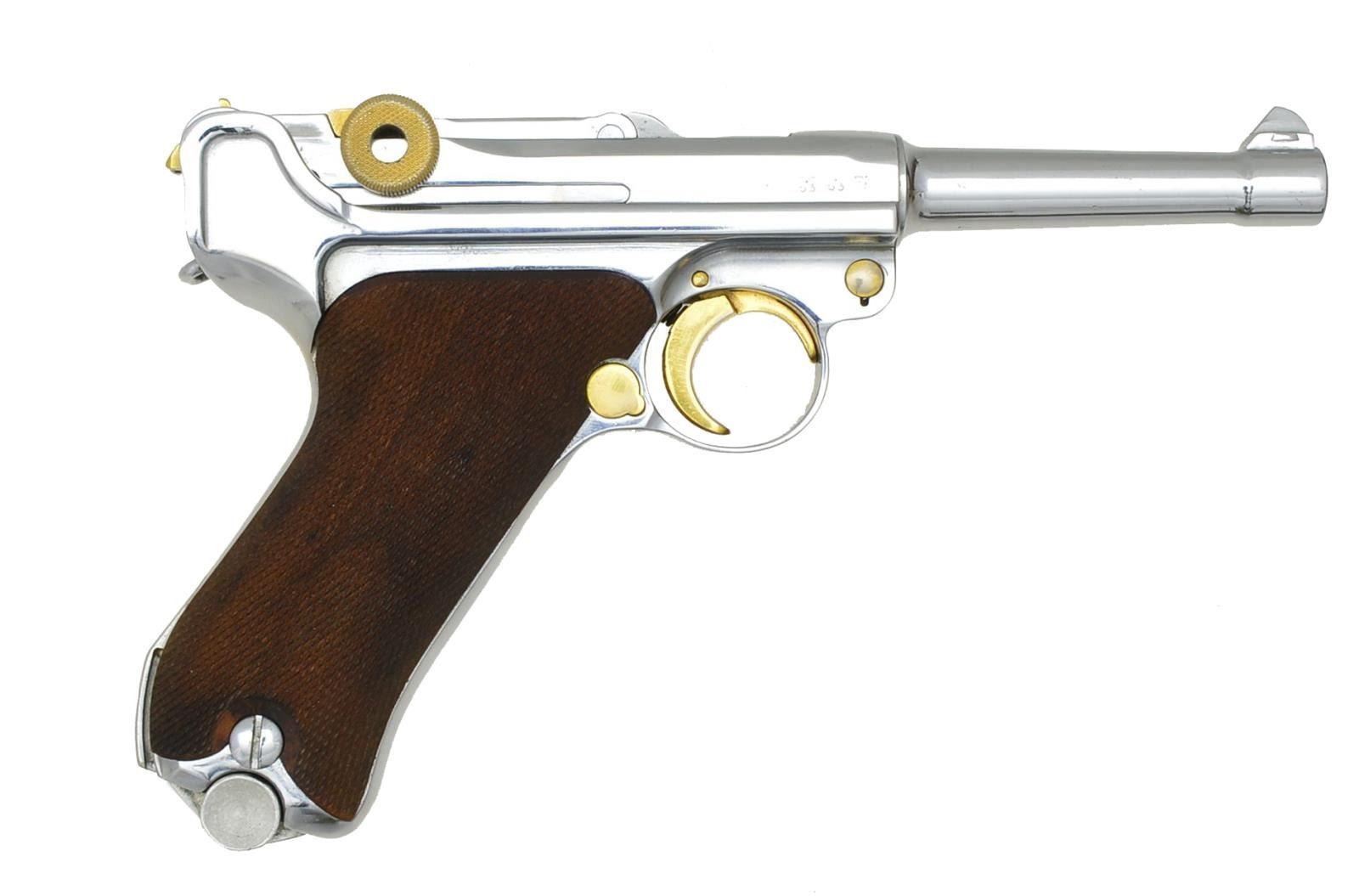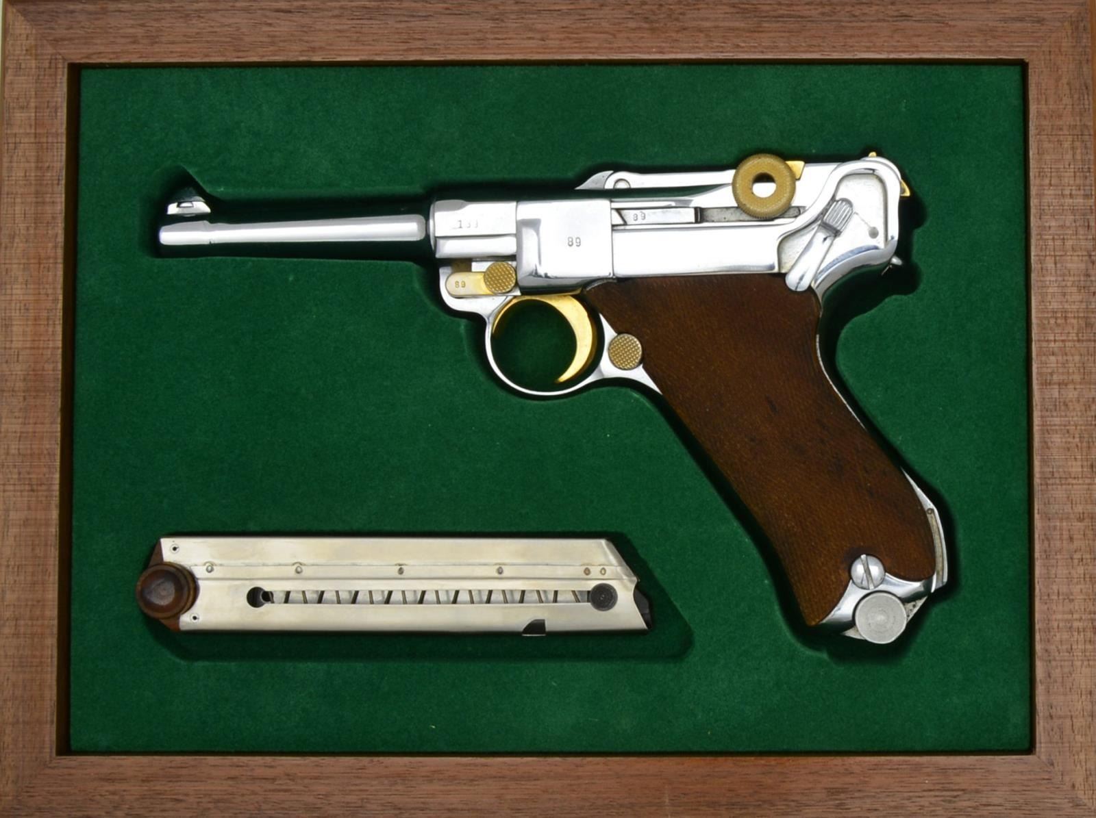 Cal. 9mm Luger. S# 189v. Bbl. 4" w/ fin shaped front sight. Attractive appearance as chrome plated w/ gold accents comprised of takedown lever, trigger, mag. latch & rear toggle. Mostly matching numbered metal parts; hold open latch #33 & rear toggle #27 plus unmarked aftermarket checkered walnut grips. Retains stock lug but 2 or 4 digit chamber date removed; most likely per S# was 1939. Receiver w/ eagle party symbol & eagle 63; eagle 63 common on 1939 S/42 Code models & eagle 655 usually used on 42 Codes. MAGS: 2 very good aftermarket 8 rd.; blued w/ unmarked aluminum base & stainless appearance w/ unmarked wood base. UNATTACHED ACCESSORIES: very attractive walnut glass topped case w/ shadow line cutout for pistol & spare mag. having sprayed on green velvet like material; brass hardware. CONDITION: very good to excellent appearance w/ thinning of gold plating w/ slight base chrome plating showing through. Near excellent grips. Fair bore w/ even, moderate cleaned pitting & wear. (21-1479/NW). CURIO. $750-1,000.