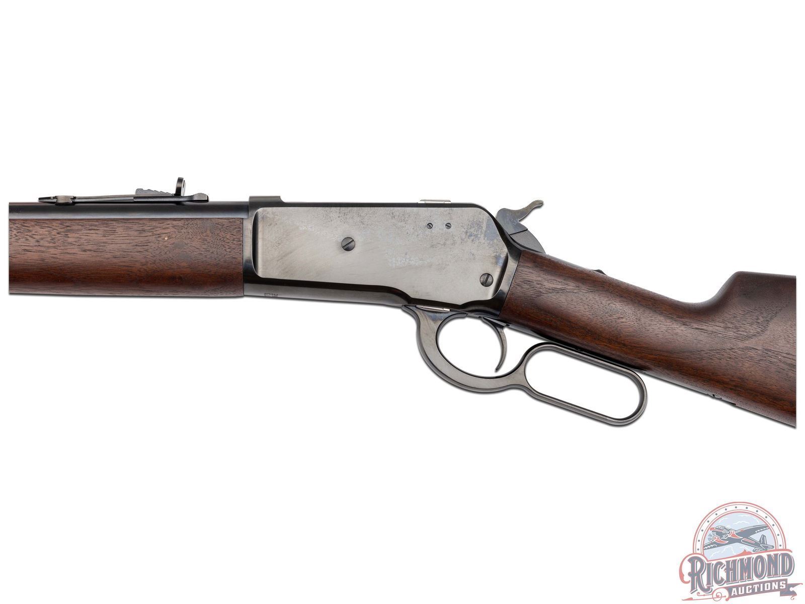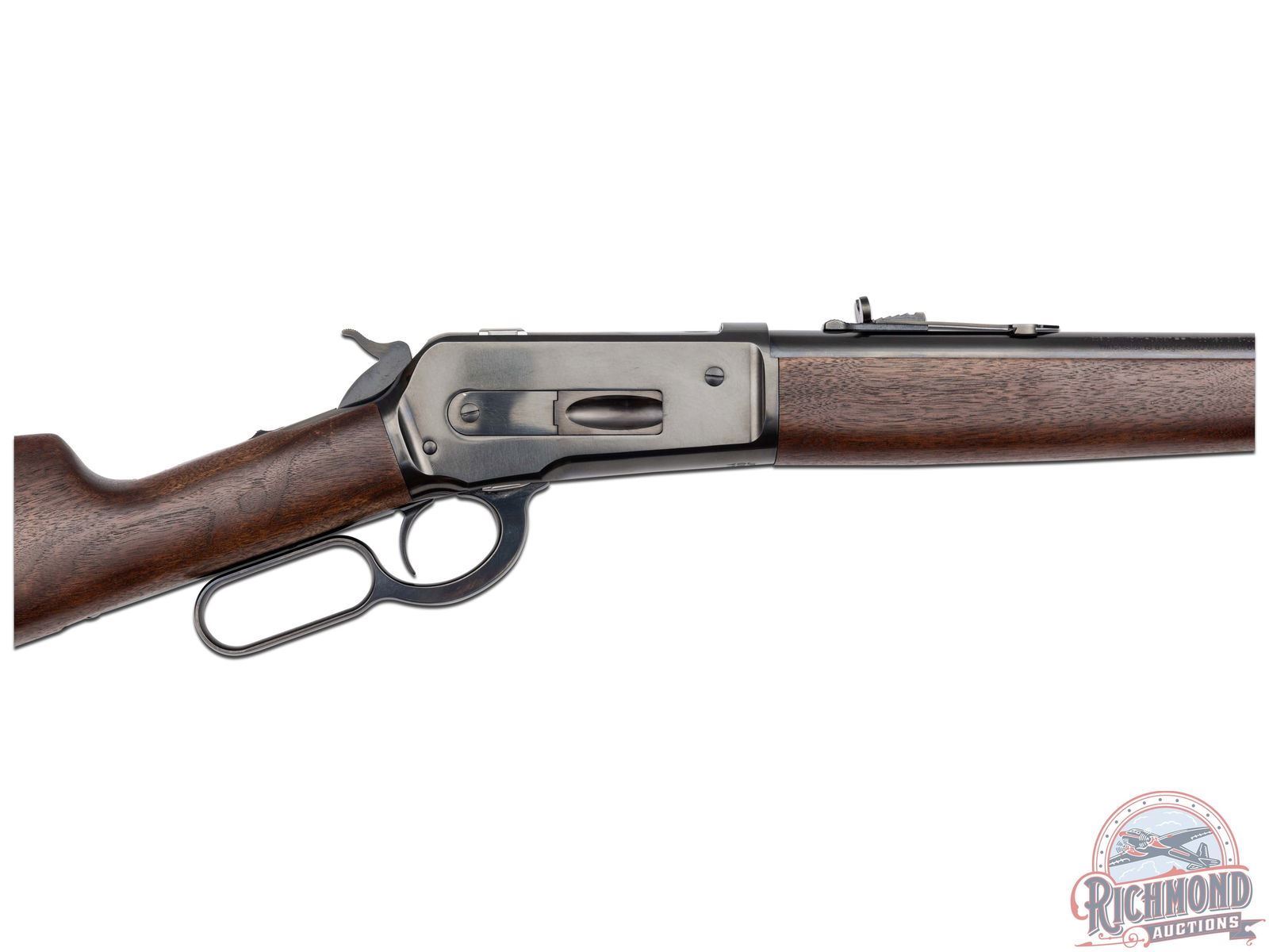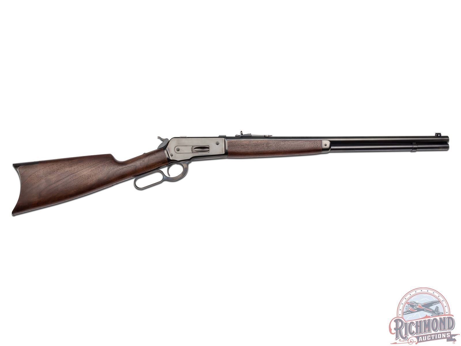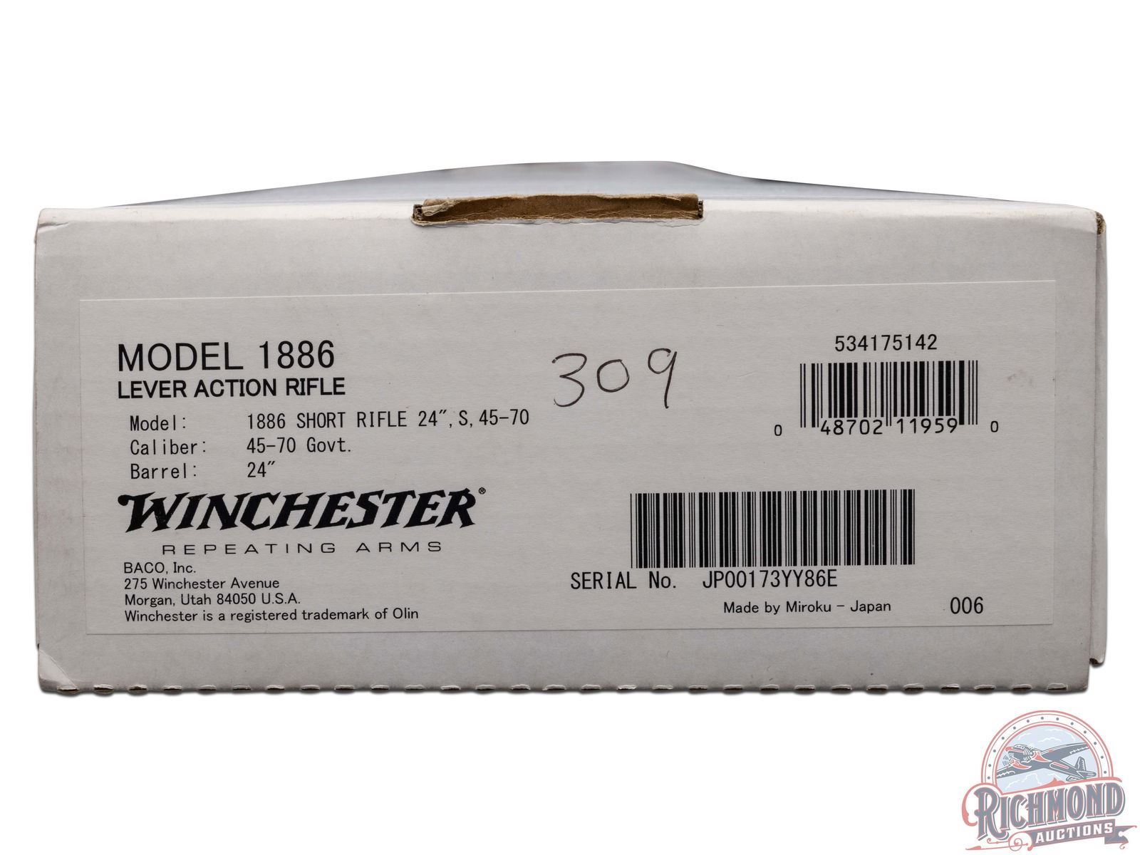 This newly manufactured Winchester model 1886 features a 24" blued round barrel with full length magazine tube. Rear semi-buckhorn sight with elevator adjustment and Marbles blade front sight with brass bead. Polished blued receiver and lever, and tang mounted safety. Satin American walnut straight stock and forearm. Fitted with a blued crescent steel butt plate. Comes in the original box with factory paperwork and cable lock. LOP: 13". CALIBER: 45/70 GOVT. S/N: JP00173YY86E. FFL STATUS: Modern.