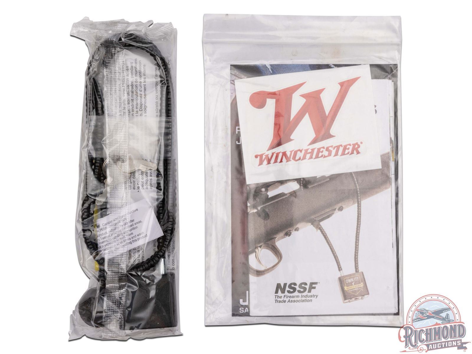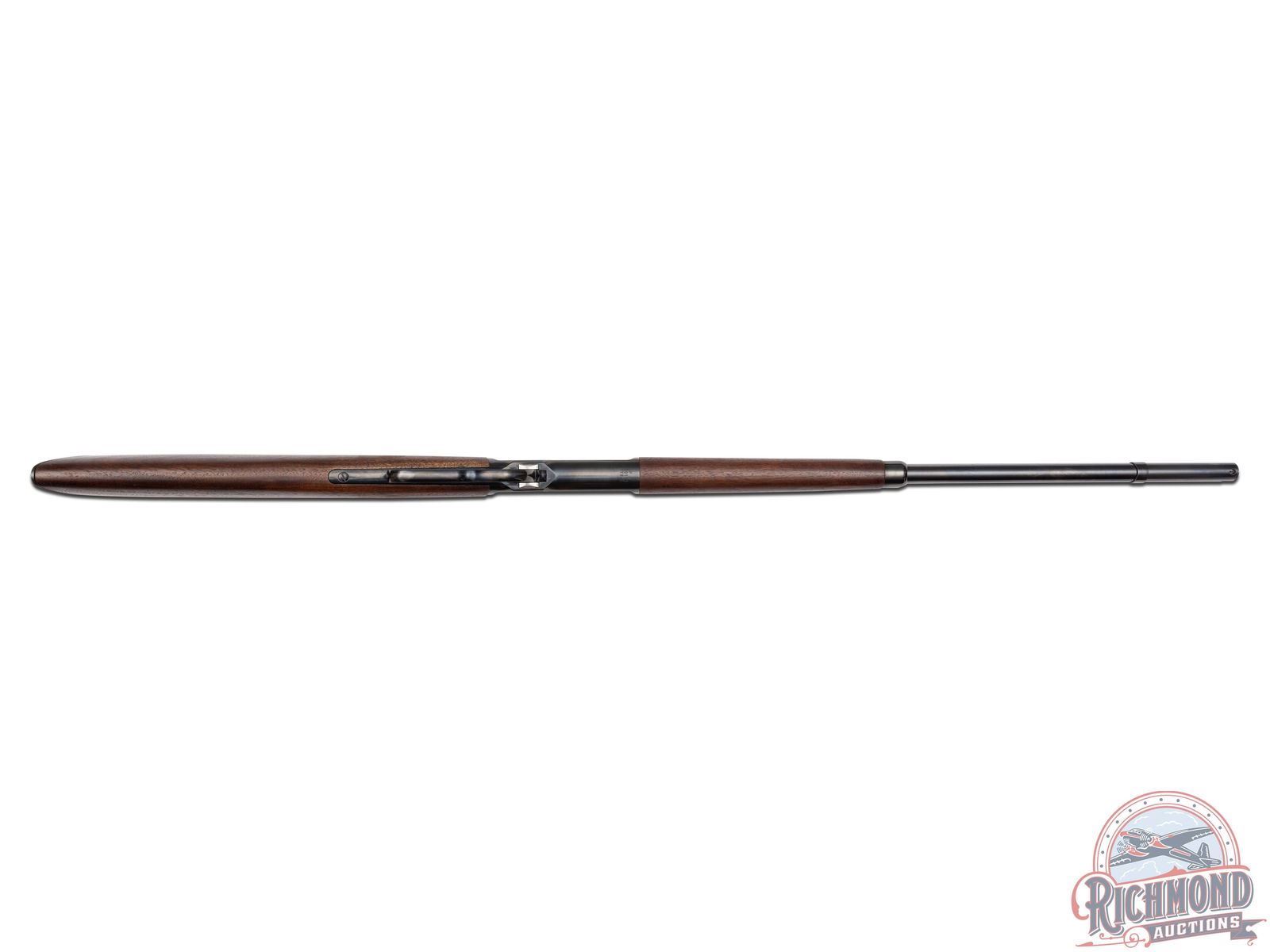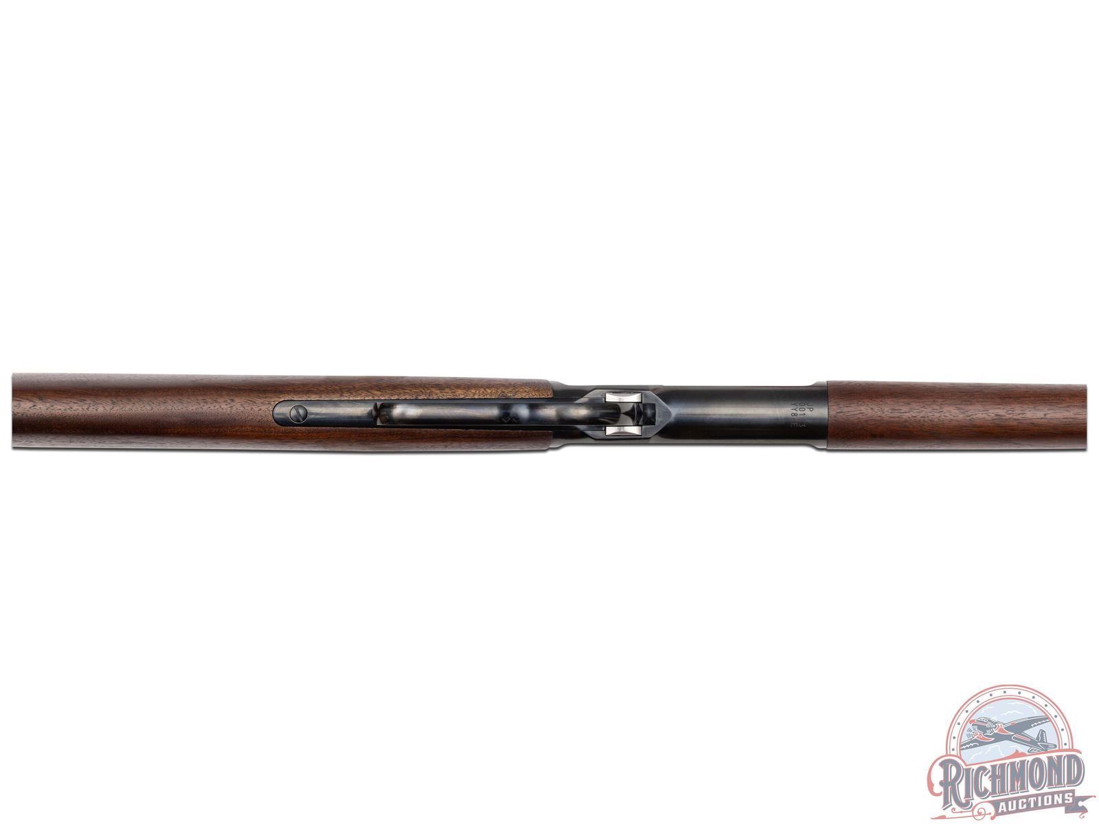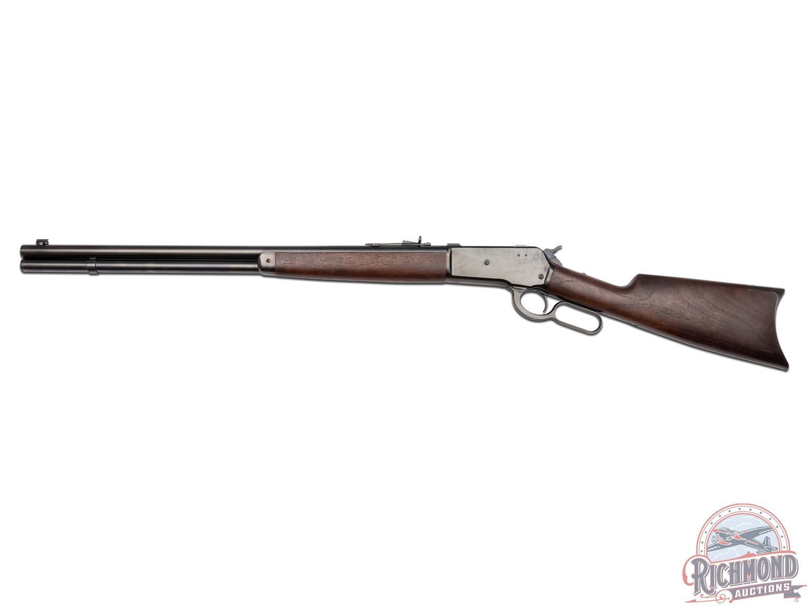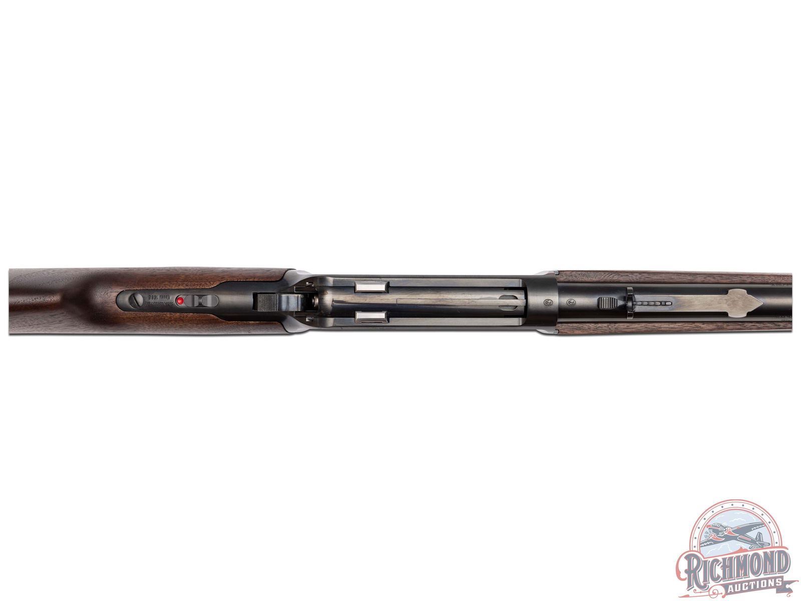 This newly manufactured Winchester model 1886 features a 24" blued round barrel with full length magazine tube. Rear semi-buckhorn sight with elevator adjustment and Marbles blade front sight with brass bead. Polished blued receiver and lever, and tang mounted safety. Satin American walnut straight stock and forearm. Fitted with a blued crescent steel butt plate. Comes in the original box with factory paperwork and cable lock. LOP: 13". CALIBER: 45/70 GOVT. S/N: JP00173YY86E. FFL STATUS: Modern.