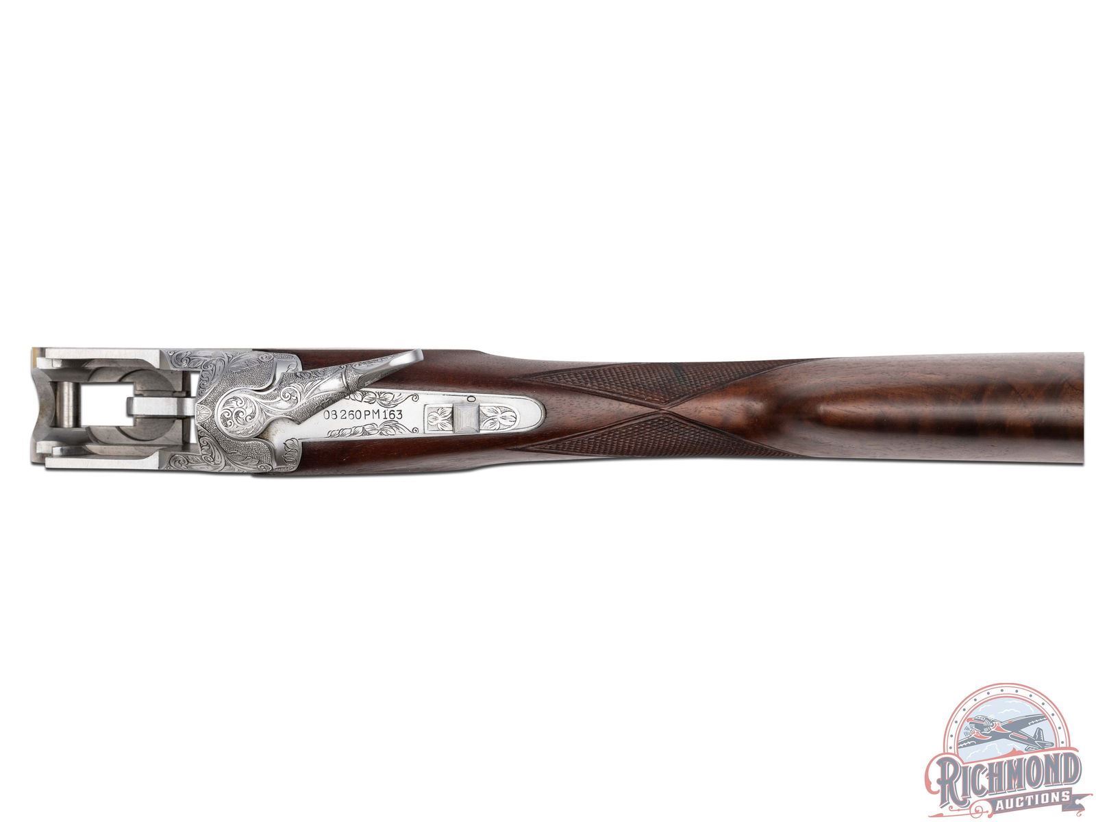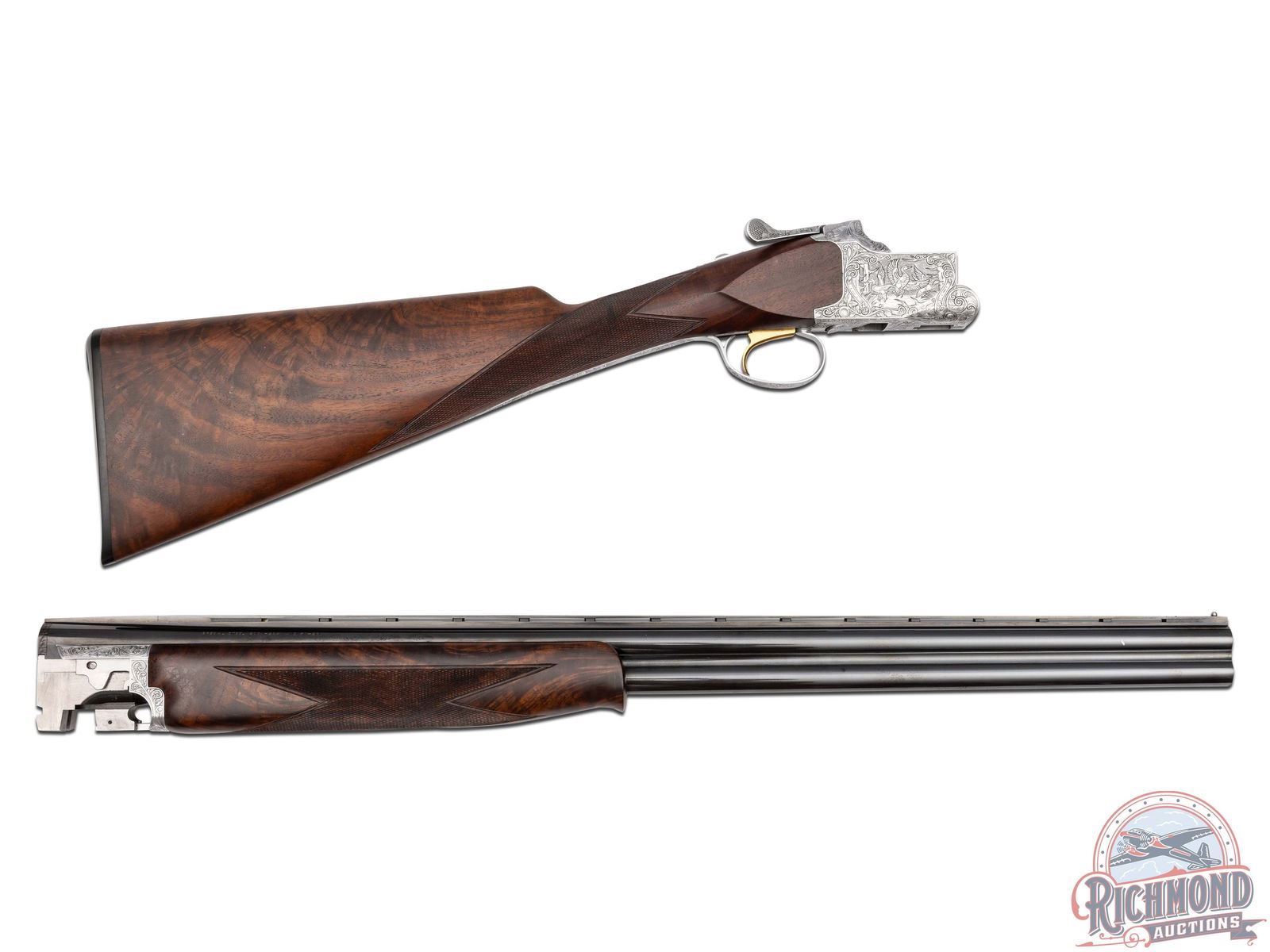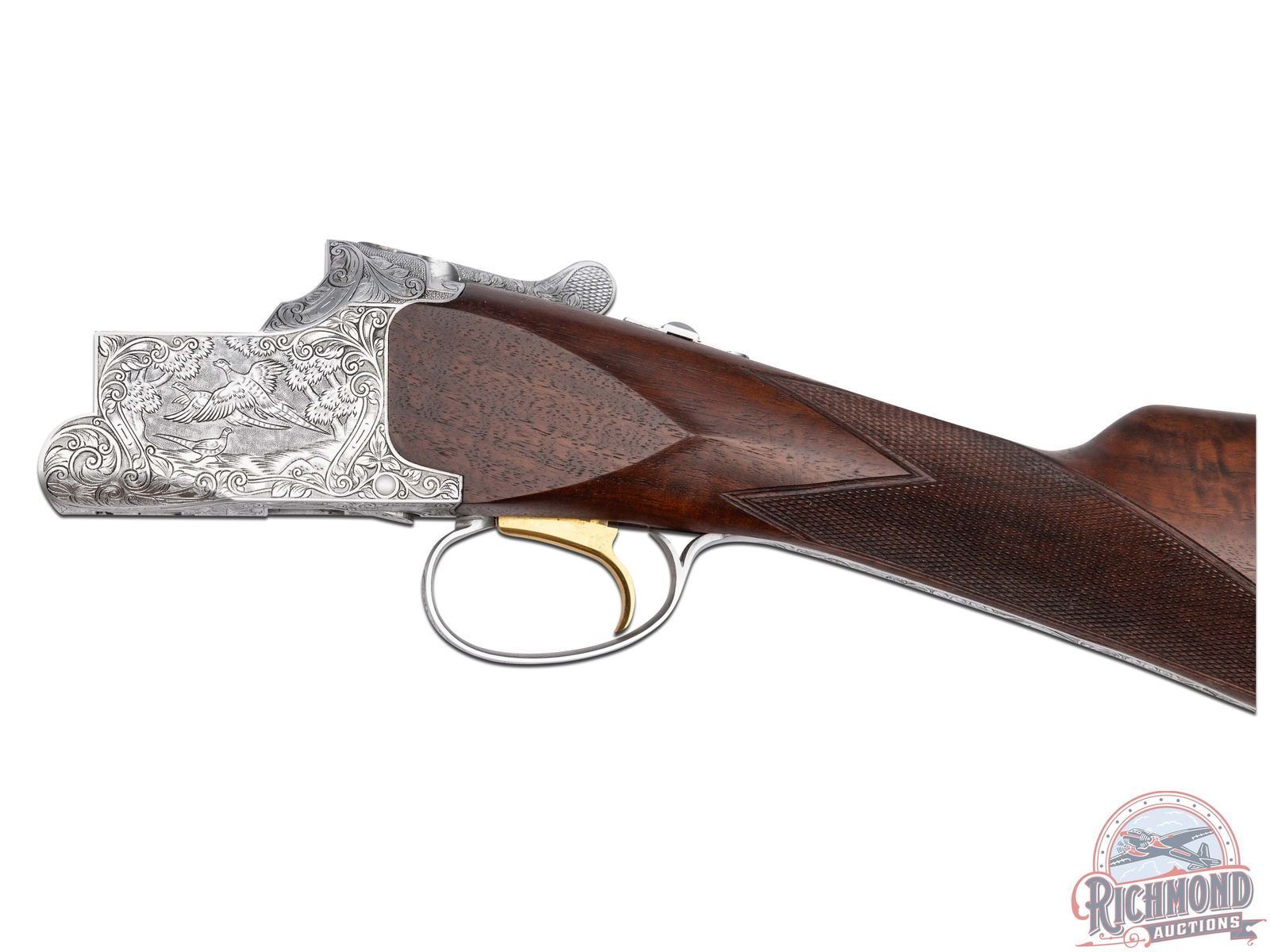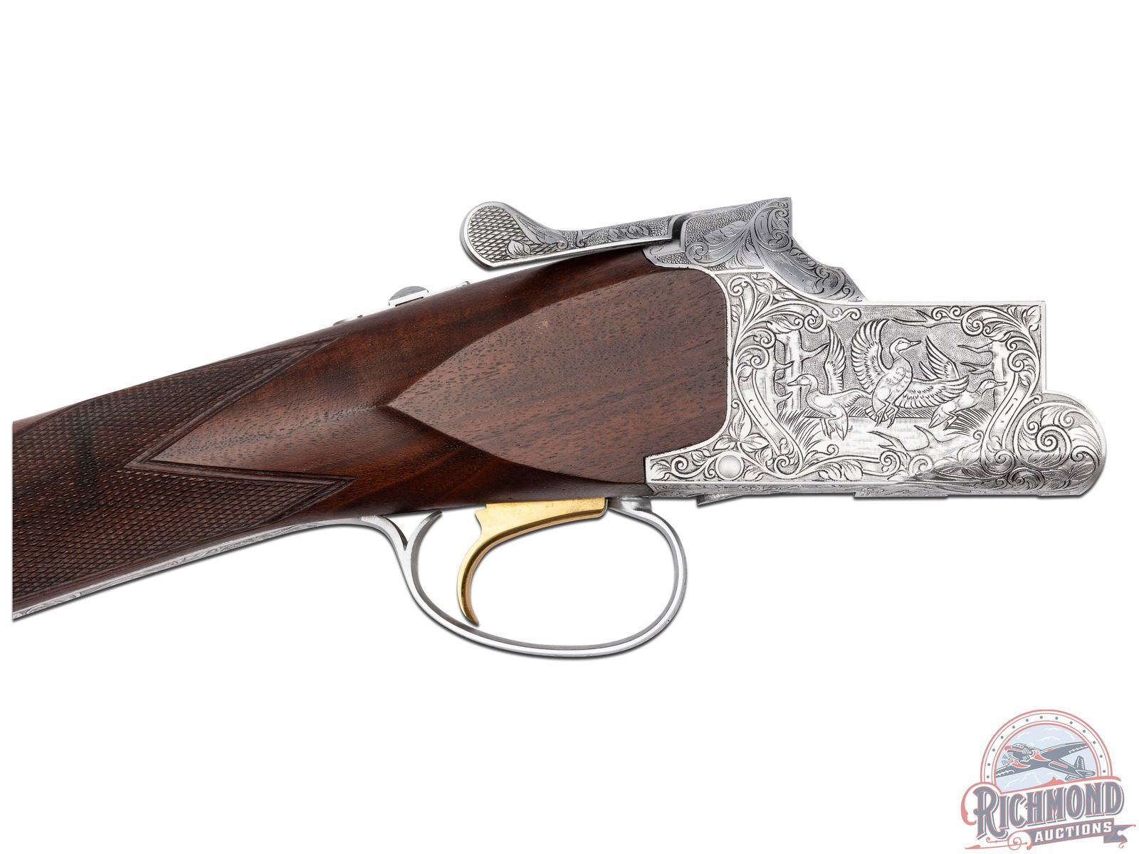 Manufactured in 1980. Features 26" blued barrels with single nickel bead front sight on a matte ventilated rib. Chambered for 2-3/4" and 3" shells choked modified and improved cylinder and equipped with automatic ejectors. The coin finished action has deep floral scroll engraving which extends to the break lever, trigger guard, tang, barrel breeches and forearm hardware. The right side of the action is engraved with a game scene of three ducks taking to flight from a wooded marsh, with the left side similarly engraved with three pheasants in a wooded field scene. The underside of the action is also engraved with a setter and a flushed pheasant, along with a quail in flight on the trigger guard. Select grade V checkered walnut straight grip stock, Schnabel tipped forearm with a satin oil finish. Gold washed single selective trigger / tang safety. Fitted with a factory Browning textured black plastic butt plate. Comes in the original factory box with manual. LOP: 14". DAC: 1-1/4". DAH: 2". CALIBER: 20 GA. S/N: 08260PM163. FFL STATUS: Modern.