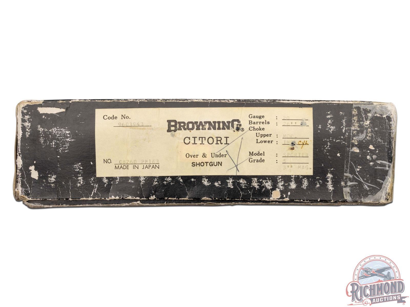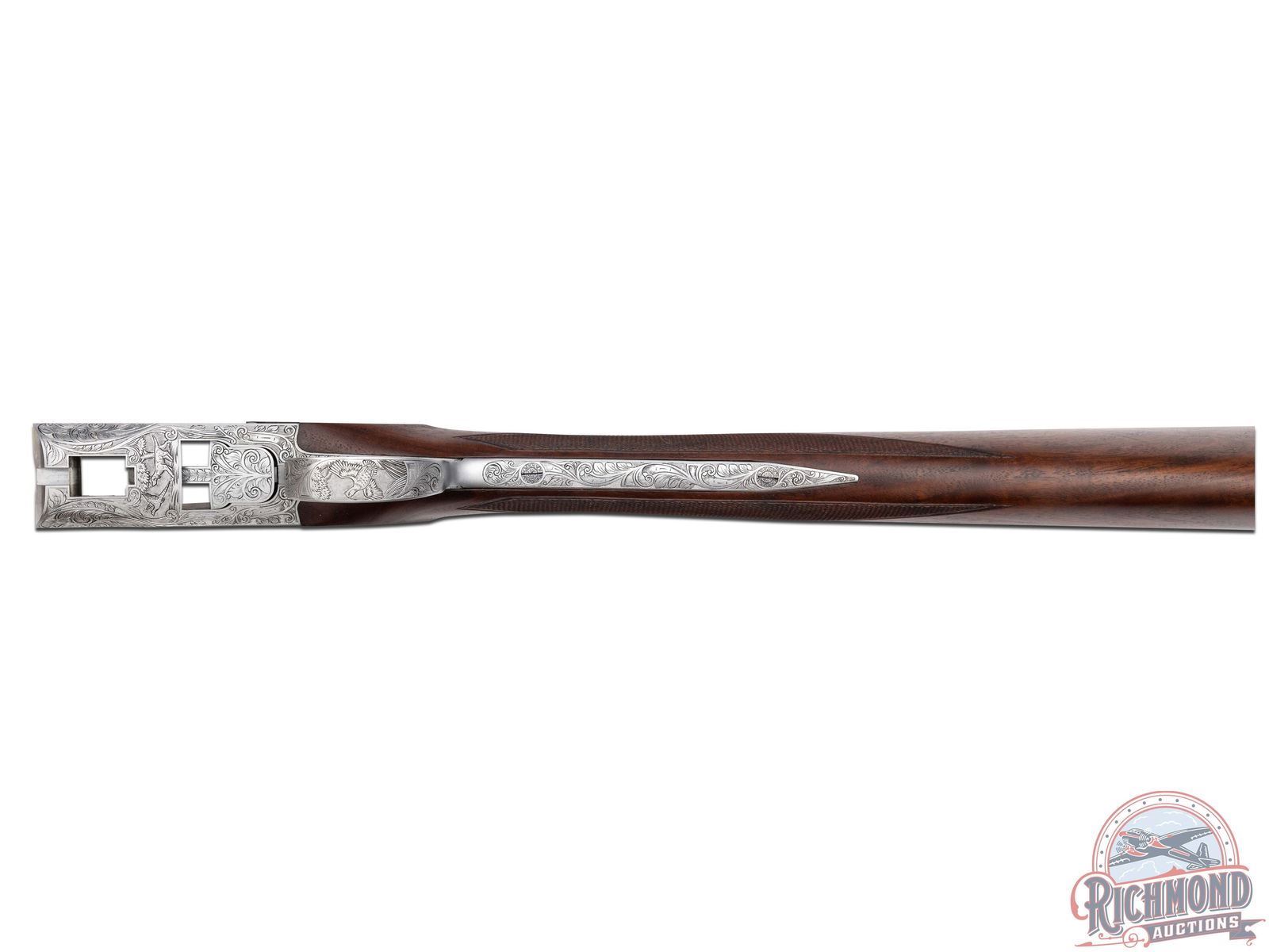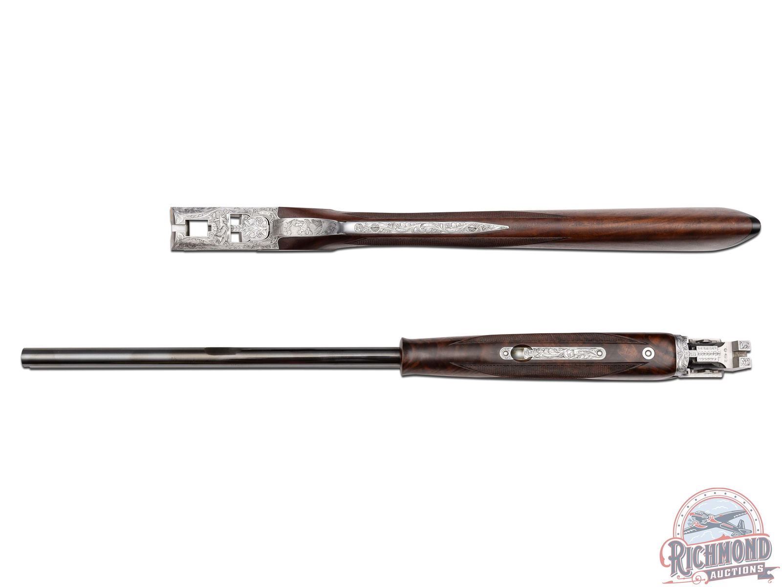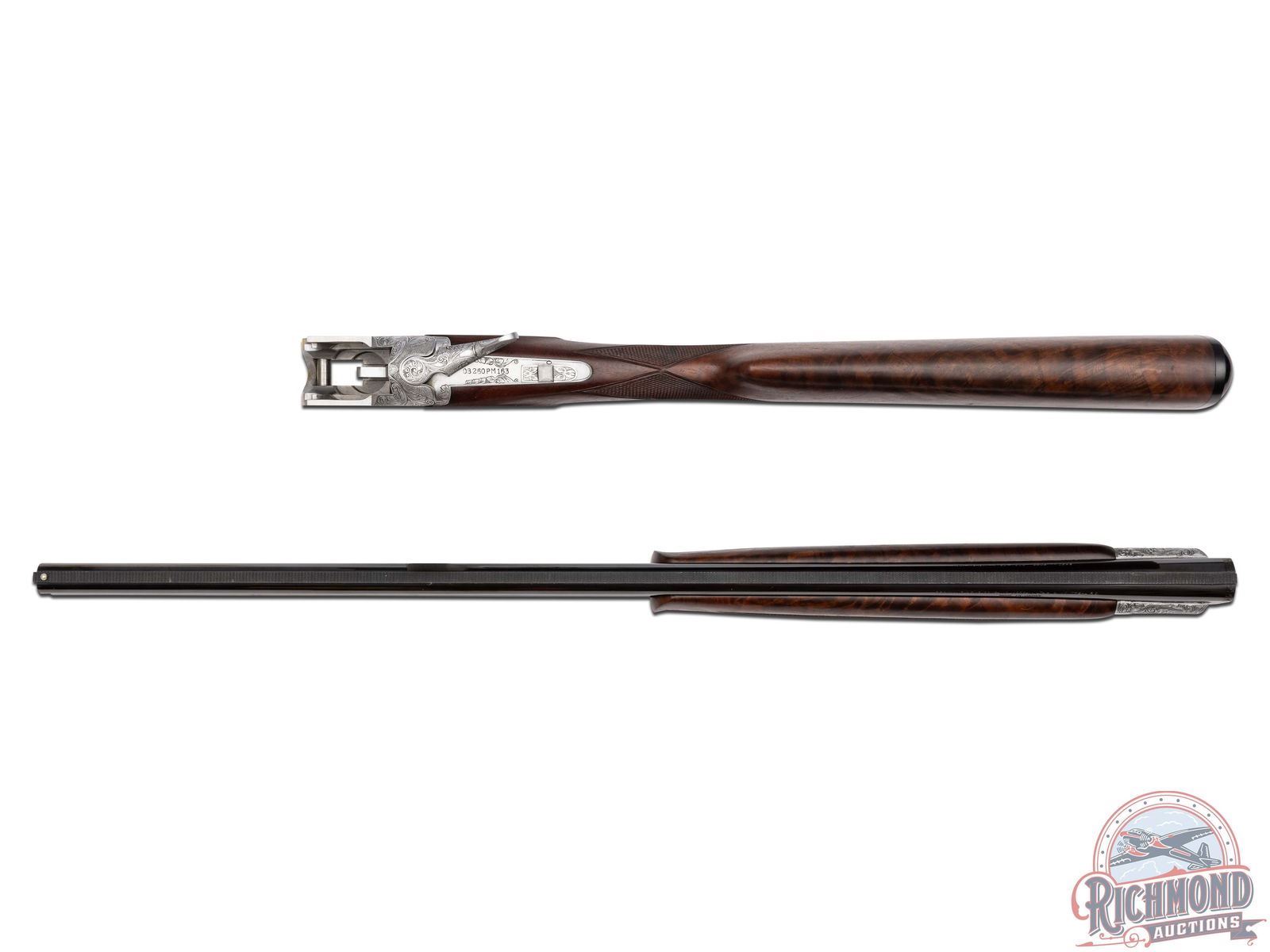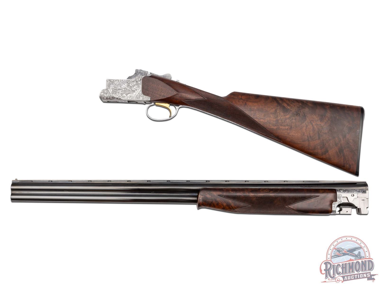Manufactured in 1980. Features 26" blued barrels with single nickel bead front sight on a matte ventilated rib. Chambered for 2-3/4" and 3" shells choked modified and improved cylinder and equipped with automatic ejectors. The coin finished action has deep floral scroll engraving which extends to the break lever, trigger guard, tang, barrel breeches and forearm hardware. The right side of the action is engraved with a game scene of three ducks taking to flight from a wooded marsh, with the left side similarly engraved with three pheasants in a wooded field scene. The underside of the action is also engraved with a setter and a flushed pheasant, along with a quail in flight on the trigger guard. Select grade V checkered walnut straight grip stock, Schnabel tipped forearm with a satin oil finish. Gold washed single selective trigger / tang safety. Fitted with a factory Browning textured black plastic butt plate. Comes in the original factory box with manual. LOP: 14". DAC: 1-1/4". DAH: 2". CALIBER: 20 GA. S/N: 08260PM163. FFL STATUS: Modern.