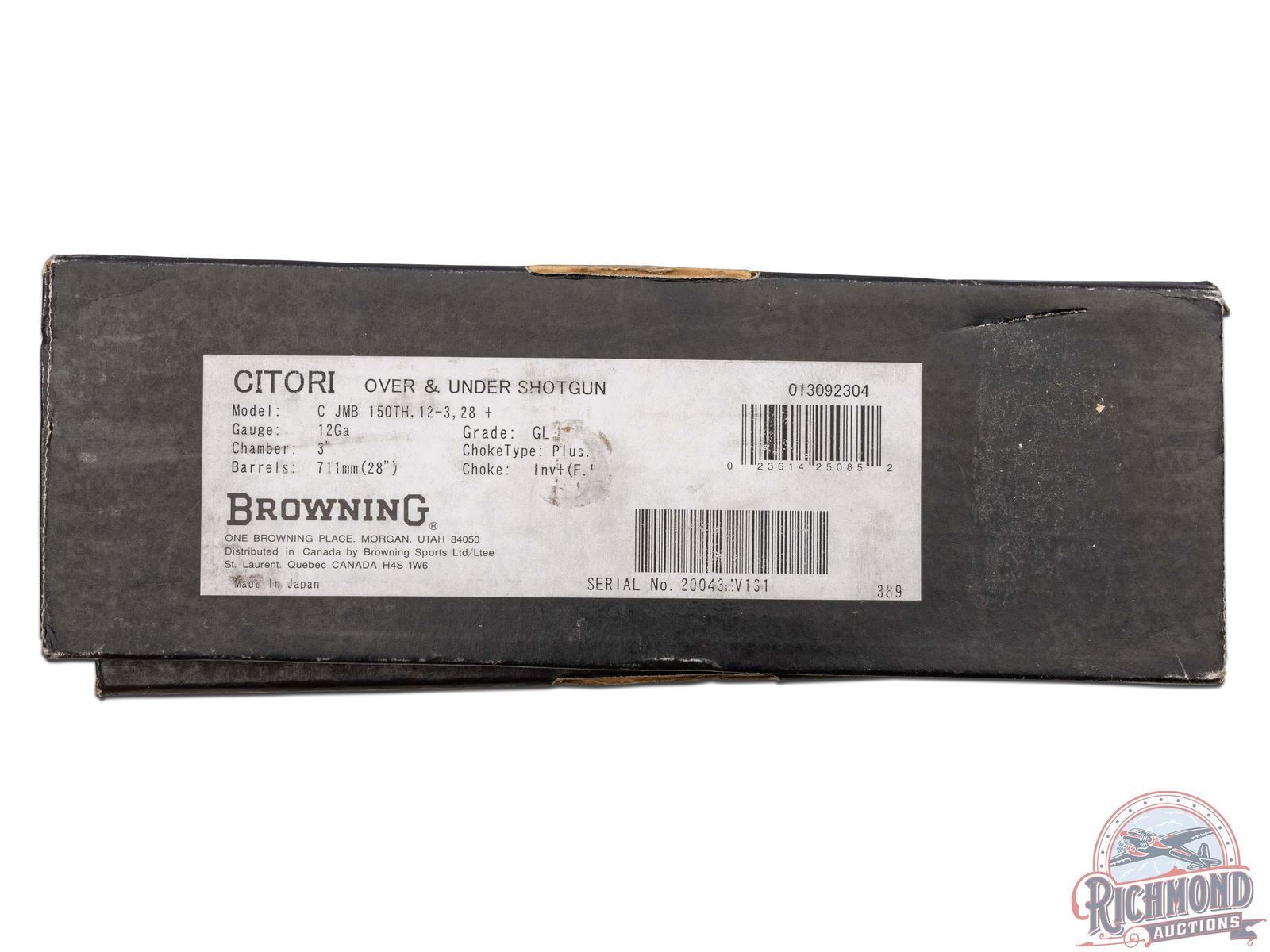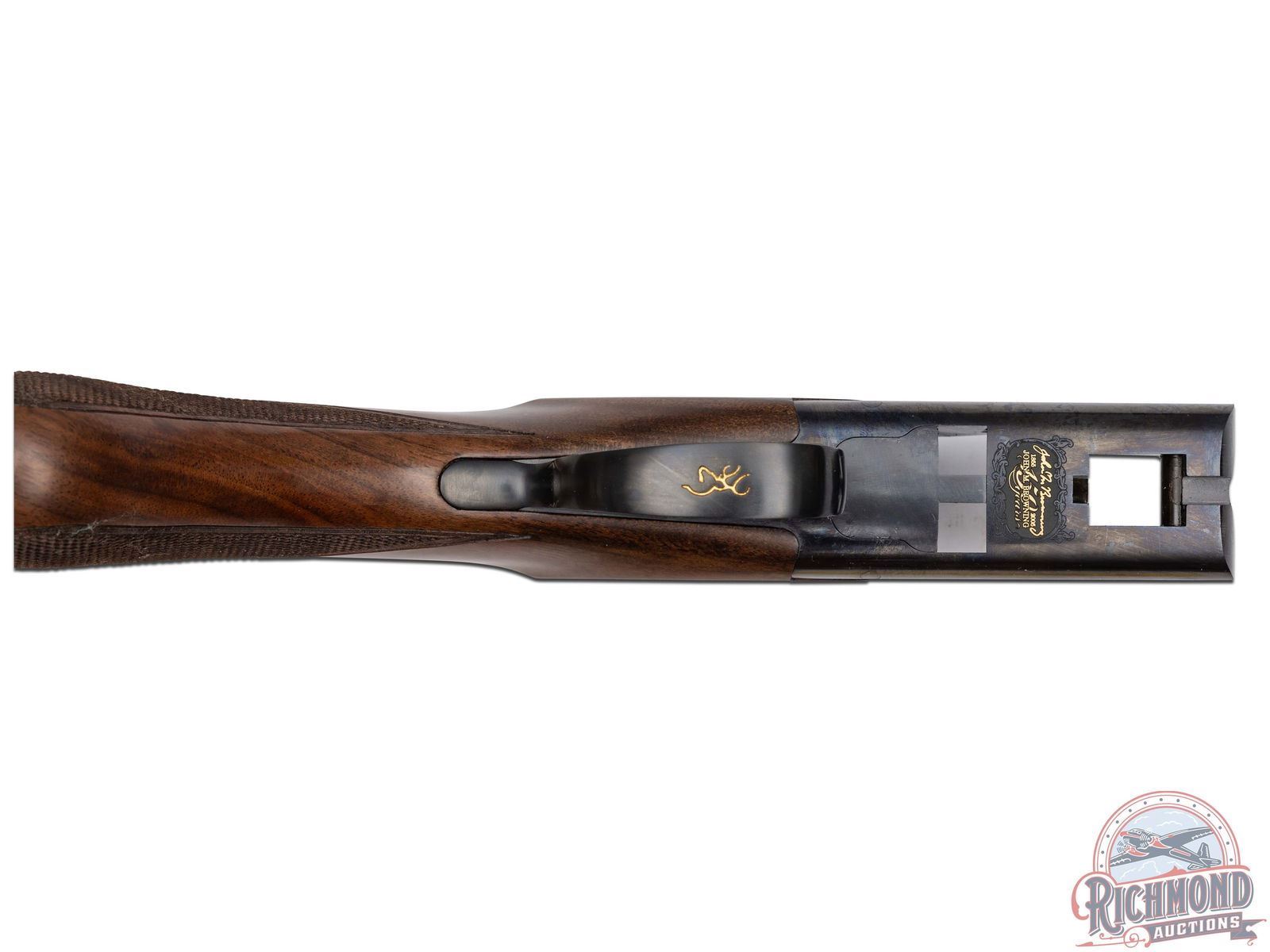 Manufactured in 2004 to commemorate the 150th year of Browning Arms. Features 28" blued barrels with ventilated rib, chambered for 2-3/4" and 3" shells with Invector Plus choke system and nickel bead front sight. Polished blued action with an oval gold portrait of John Browning on both sides surrounded with scroll floral engraving. Bottom of the receiver shows a facsimile signature of John M. Browning in gold with the years "1885 and 2005" superimposed above a gold "150 Years". Crossbolt safety and gold washed trigger with Browning Buck logo stamped on the bottom of the guard in gold. High grade walnut round knob, long tang stock with checkered pistol grip and matching forearm with checkering, all in a satin oil finish. Fitted with a factory brown ventilated recoil pad. Comes in the original Browning box with paperwork, choke wrench and lock. LOP: 14-1/8". DAC: 1-1/2". DAH: 2". CALIBER: 12 GA. S/N: 20043MV131. FFL STATUS: Modern.
