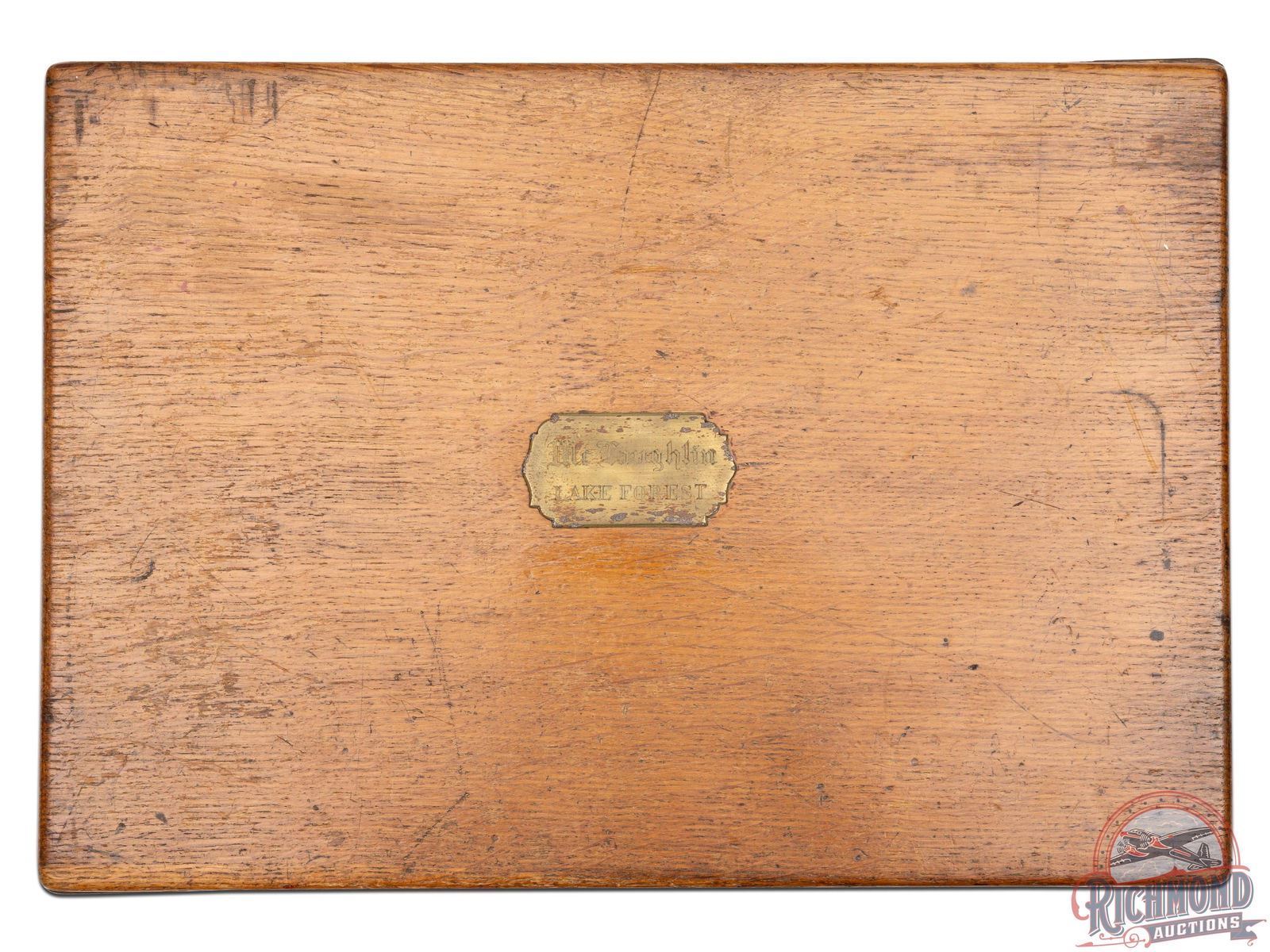 Manufactured in 1901 and 1903. These identical custom revolvers feature 5-1/2" barrels with notch and blade front sights. Single line Colt address on top of the barrel and "COLT SINGLE ACTION ARMY 45" stamped on the left side. Left side of the frames have a 2-line, 3 patent date and rampant Colt logo. Nickel and gold-plated finish. They are fitted with Sambar stag grips. Each revolver is accompanied by a spare nickeled cylinder in 45 ACP caliber. Revolvers are engraved identically by Horatio Acevedo and signed on bottom front edge of the frames. Engraving covers around 80% of each firearm and consist of floral scroll, arabesque patterns with punch dot background. Engraving extends over both sides of the barrel stopping just behind front sight with small patterns on each side of the muzzle. Loading gates are engraved with Helfricht-style sunbursts with flower blossoms on each side of front of frame. Ejector rod housings are engraved with a climbing leaf pattern on outer radius with snake & dot pattern in top gullets. Top rail is engraved with a fleur-de-lis and dot like pattern. Sides of hammers are engraved with a floral scroll pattern. Top of backstraps are nicely engraved with the initials "McL." Backstraps have matching floral scroll engraving near the top, at the heel, and on grip base with matching patterns on trigger bows. All cylinders are identically engraved with the floral scroll pattern between the flutes and a scalloped border at rear edges. Screws & base pins are all fire-blued. This set comes in a fine custom oak case with brass corner reinforcements and a scalloped edge brass plaque engraved "McLaughlin / Lake Forest." Interior is green velvet lined with bottom compartmented for two revolvers with two empty covered compartments and a compartment for the two spare cylinders. Includes two nickeled steel cleaning rods, each with a small brass plaque engraved "MCLAUGHLIN". Each end of the case has a cartridge block for 12 cartridges. *Please Note Ammunition shown is for Display ONLY and WILL NOT be shipped with the firearms. Per consignor; this pair belonged to Major Frederick McLaughlin, first owner of the Chicago Blackhawks NHL team from 1926-1942. A brief history on Major McLaughlin is included. His son William McLaughlin had these SAA's gold-plated and engraved during the 1970's. CALIBER: 45 ACP / COLT. S/N: 240397 / 219055. FFL STATUS: Curio & Relic.