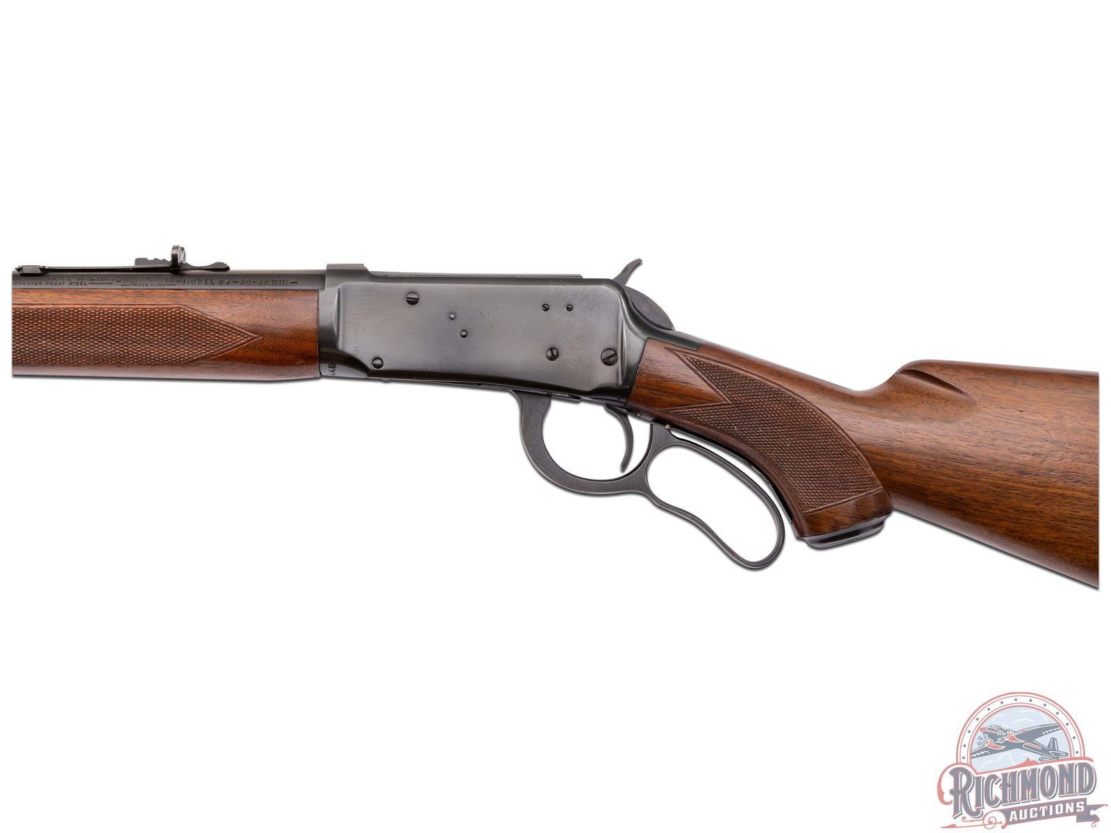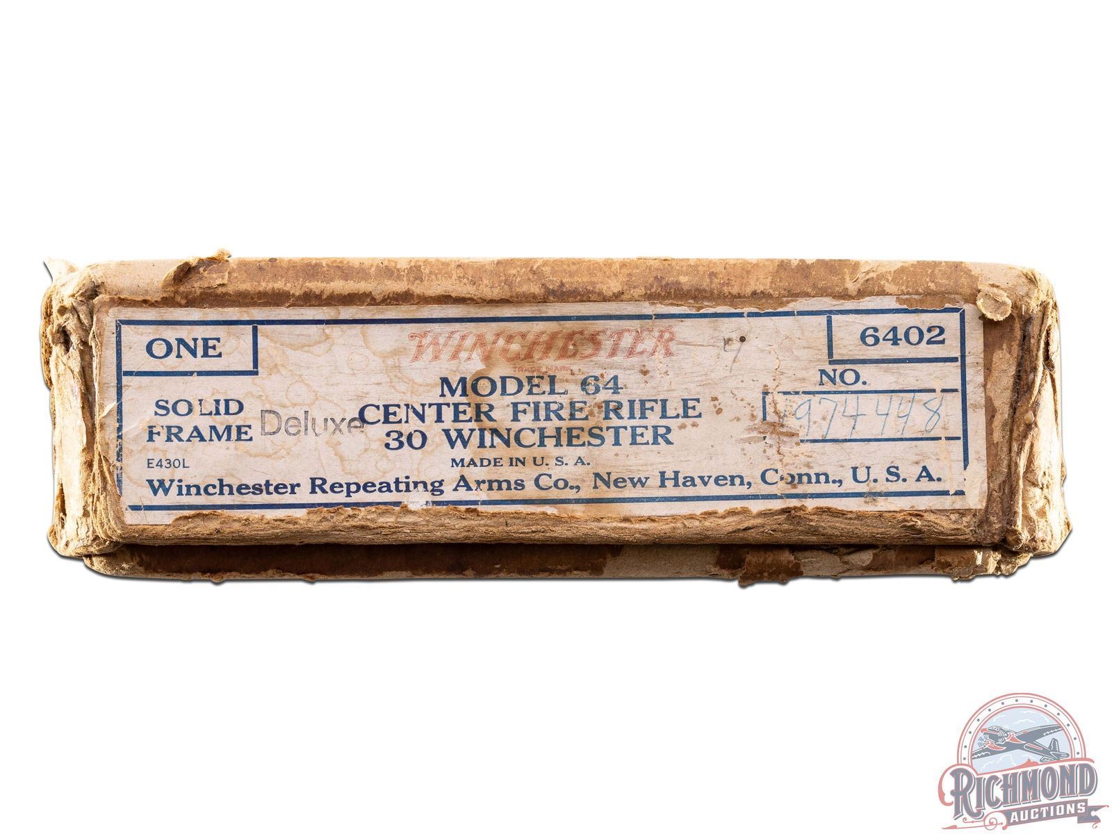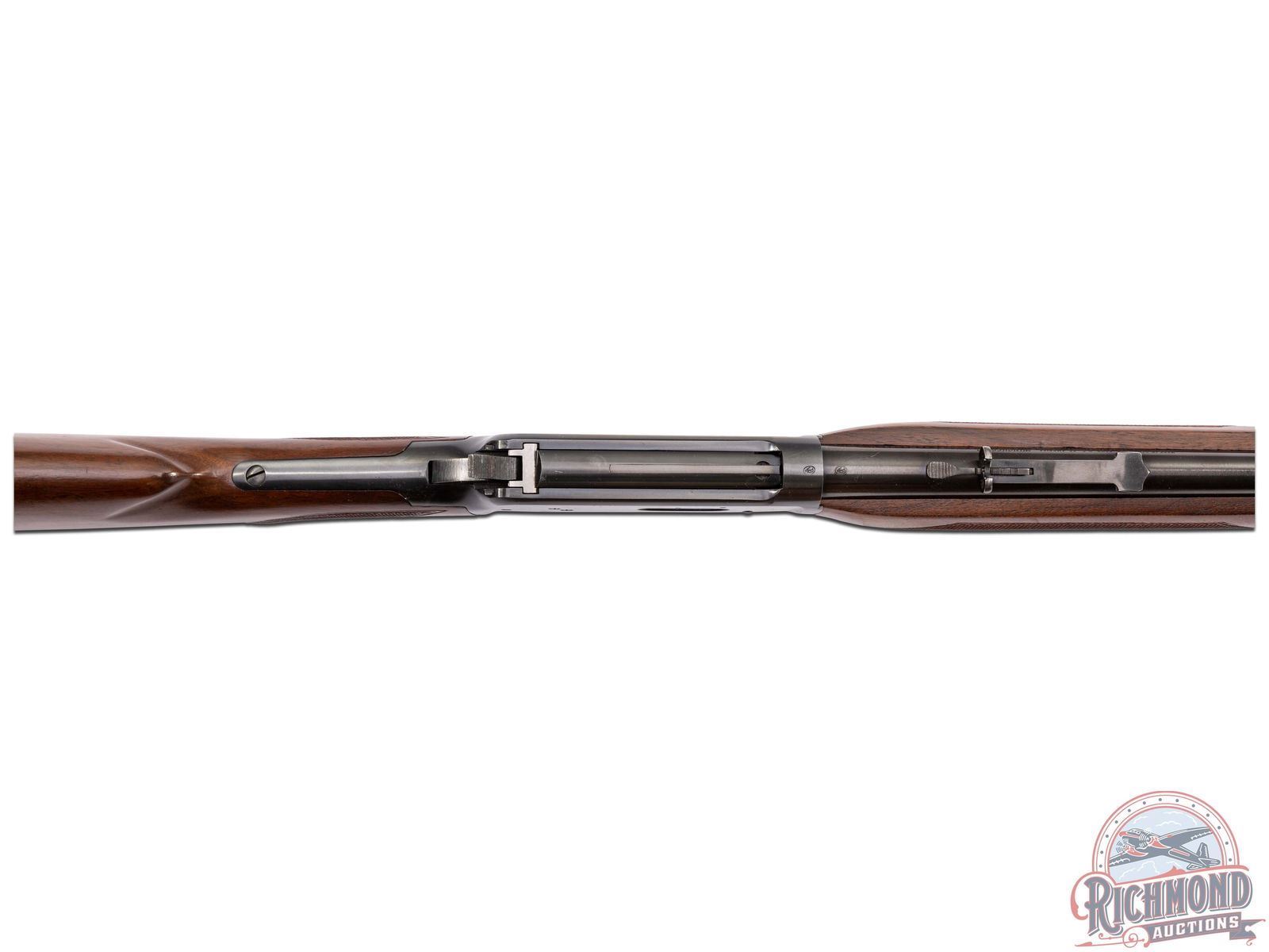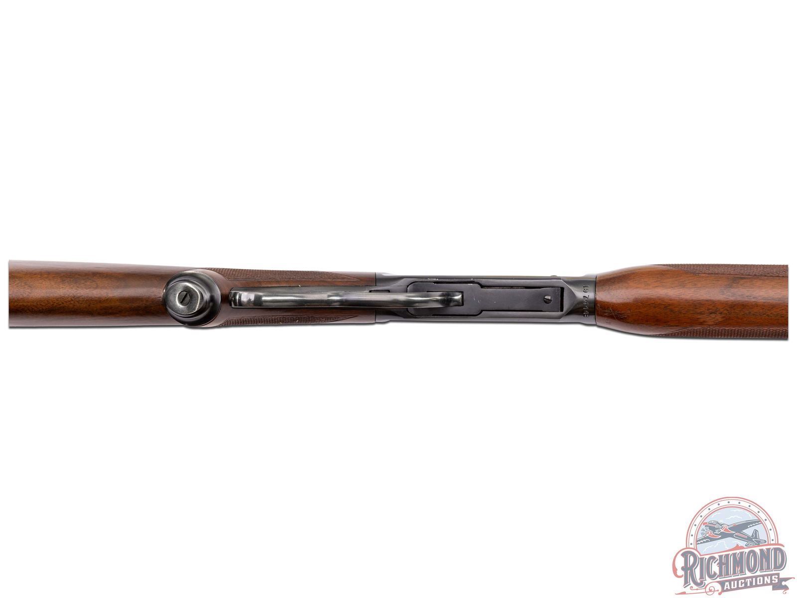 Manufactured in 1953. Features a 24" blued barrel with all the standard Winchester roll marks and proof marks. Hooded front ramp sight and rear adjustable semi-buckhorn sight. Blued receiver with side loading gate and tubular magazine. Deluxe hand-checkered walnut wood stock with pistol grip and matching forearm. Fitted with a factory checkered metal butt plate and swivel studs. Comes in the original factory box with original sling swivels, factory hanging tag, instruction manual and safety brochure. LOP: 13". CALIBER: 30-30 WIN. S/N: 1974448. FFL STATUS: Curio & Relic.