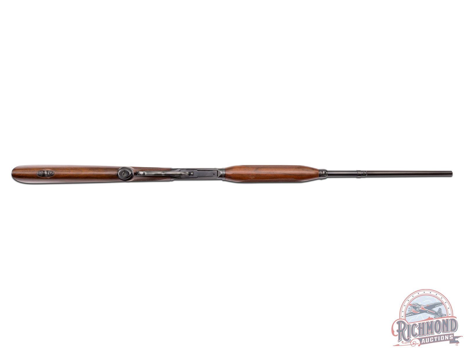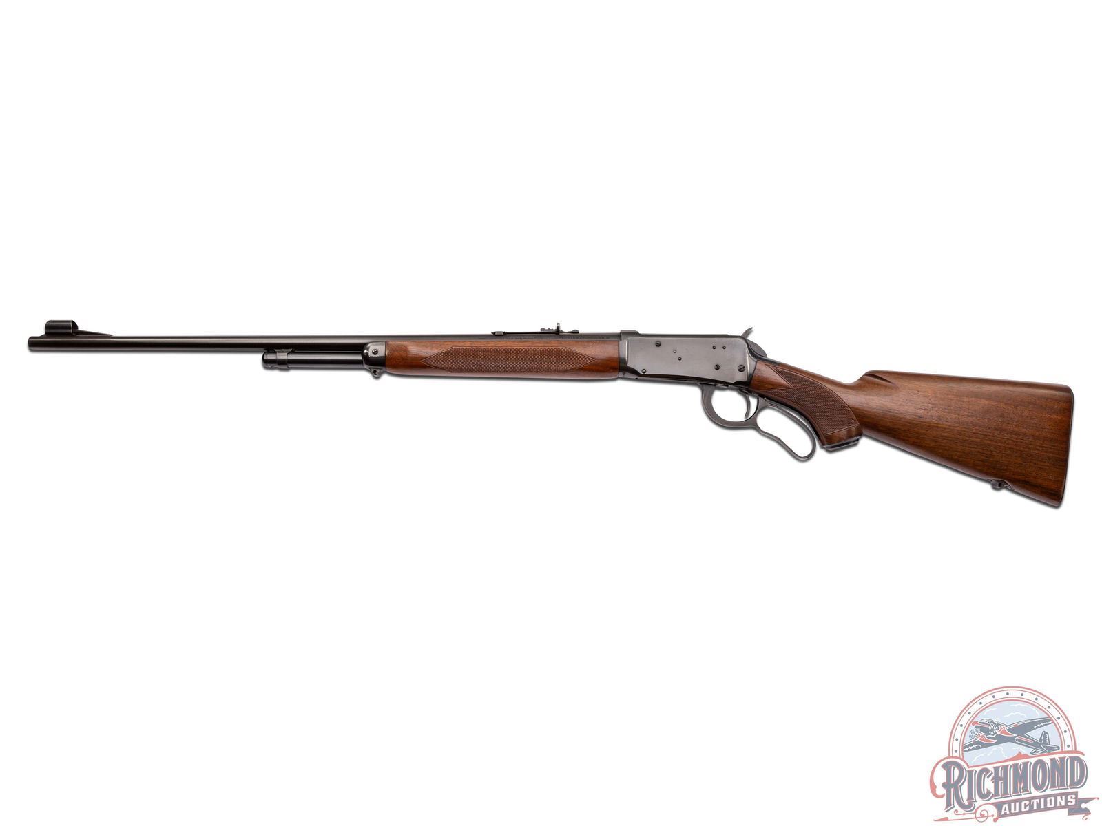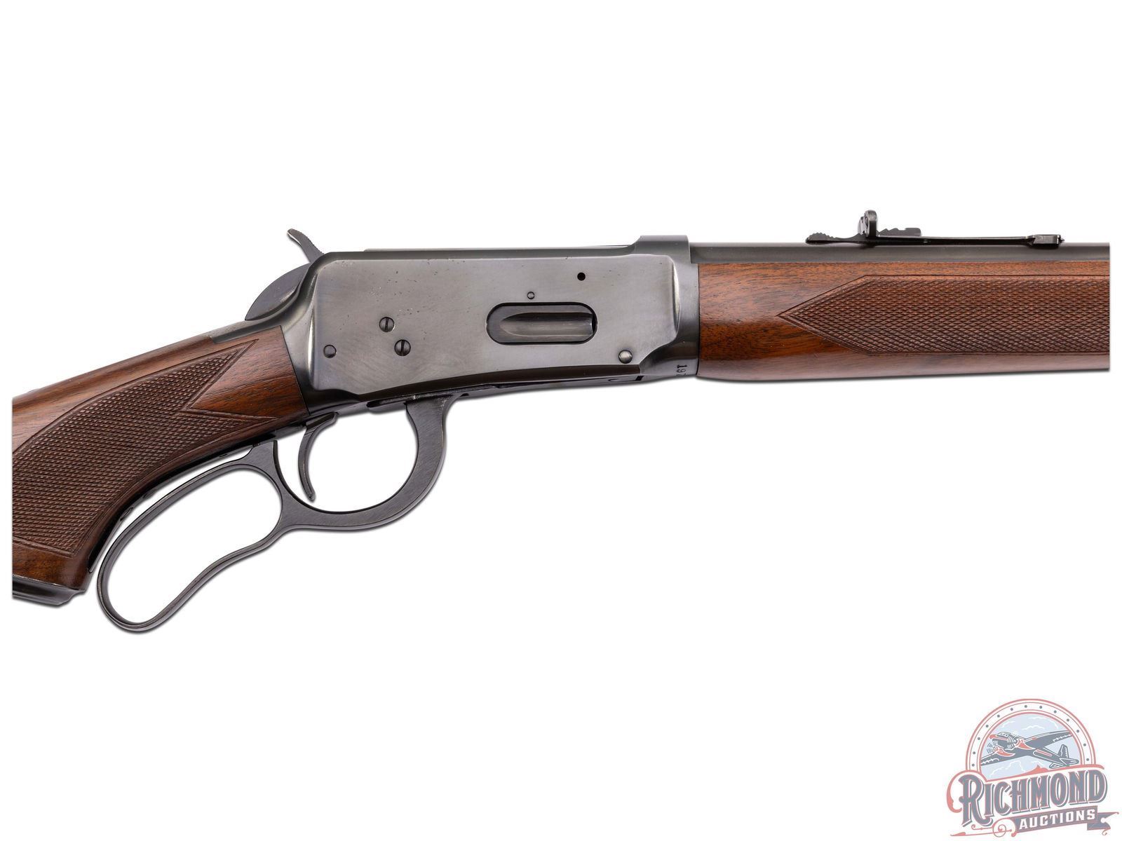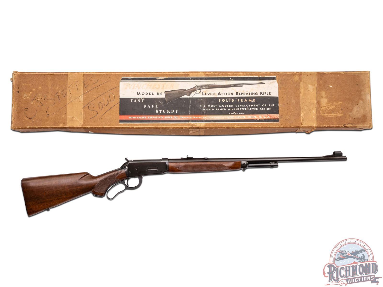 Manufactured in 1953. Features a 24" blued barrel with all the standard Winchester roll marks and proof marks. Hooded front ramp sight and rear adjustable semi-buckhorn sight. Blued receiver with side loading gate and tubular magazine. Deluxe hand-checkered walnut wood stock with pistol grip and matching forearm. Fitted with a factory checkered metal butt plate and swivel studs. Comes in the original factory box with original sling swivels, factory hanging tag, instruction manual and safety brochure. LOP: 13". CALIBER: 30-30 WIN. S/N: 1974448. FFL STATUS: Curio & Relic.