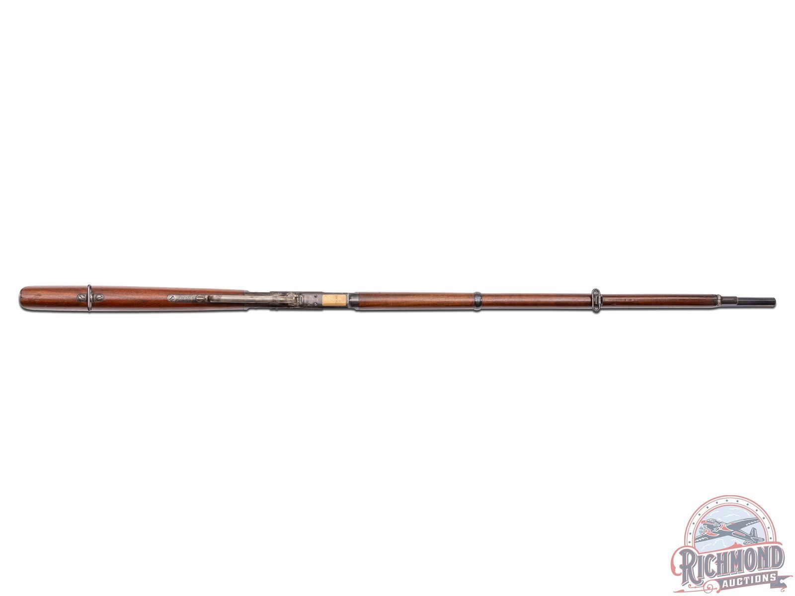 Manufactured in 1902. Features a 30" blued barrel with three barrel rings, factory rear ladder adjustable sight and post blade front sight. Near full length magazine tube. The top of the barrel is stamped "WINCHESTER'S REPEATING ARMS, NEW HAVEN, CT / KING'S-IMPROVEMENT-PATENTED-MARCH 29, 1866. OCTOBER 16, 1860" and "44 WCF" stamped near the receiver. Third model receiver with dust cover, side loading gate, lever lock and the iconic brass follower. Tang is stamped ">MODEL 1873<". Walnut straight stock with steel butt plate with brass gate for field cleaning storage. Near full length wood musket style forearm. Equipped with factory sling rings. Factory letter indicates that it shipped from the factory as a musket model. LOP: 13". CALIBER: 44 WCF. S/N: 571500B. FFL STATUS: Curio & Relic.