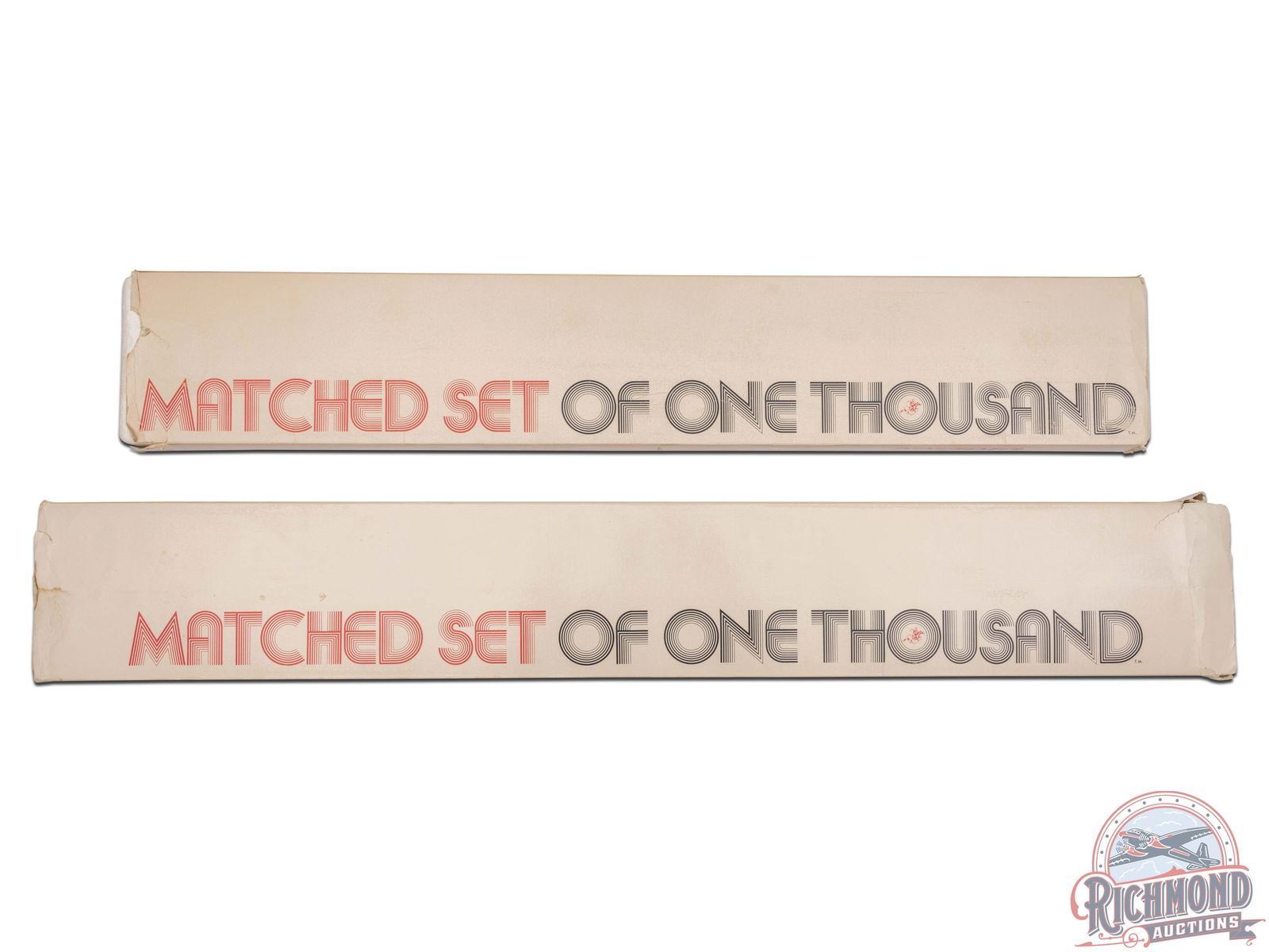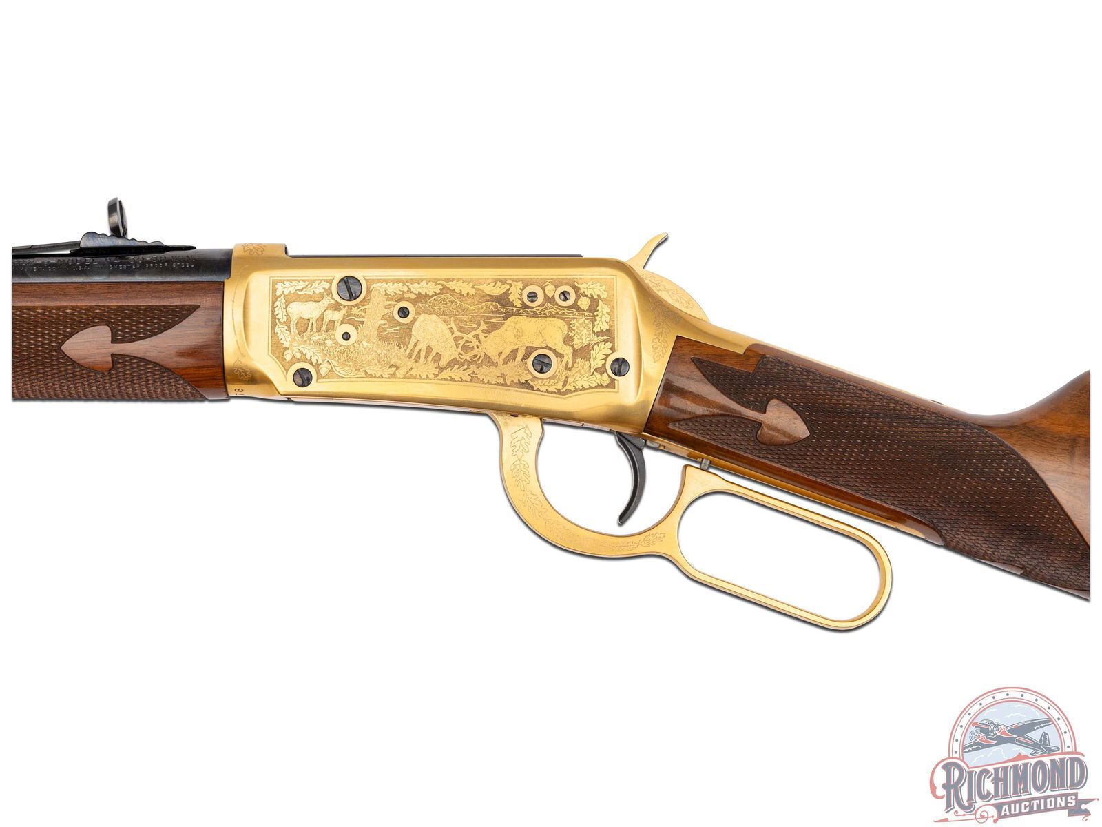 Manufactured in 1979, this matched set was the first two rifle commemorative set ever offered by Winchester . (1) Model 9422M chambered in .22 WIN Magnum, features a 20-1/2" blued round barrel with full length tubular magazine. Left side of the action features two beagles chasing a rabbit surrounded by an oak leaf design. Right side features two squirrels in a wooded scene surrounded by an oak leaf design. (2) Model 1894 chambered for .30-30 WIN, features a 24" blued barrel with full length tubular magazines. Left side of the action features two Whitetail bucks in rut and right side features a grizzly after dinner in a stream. Both scenes are surrounded by an oak leaf design. Both rifles are engraved on the right side of the barrel in gold lettering "MATCHED SET OF ONE THOUSAND". Both are equipped with nicely figured walnut straight stock with fleur-de-lis checkering, matching forearm with gold washed tip, and each fitted with a blued steel butt plate. Both come in the original factory Styrofoam cases with sleeves and factory shipping boxes. Includes a beautiful wood display case fitted for both rifles. CALIBER: 22 / 30-30 WIN. S/N: MR378 / MC378. FFL STATUS: Modern.