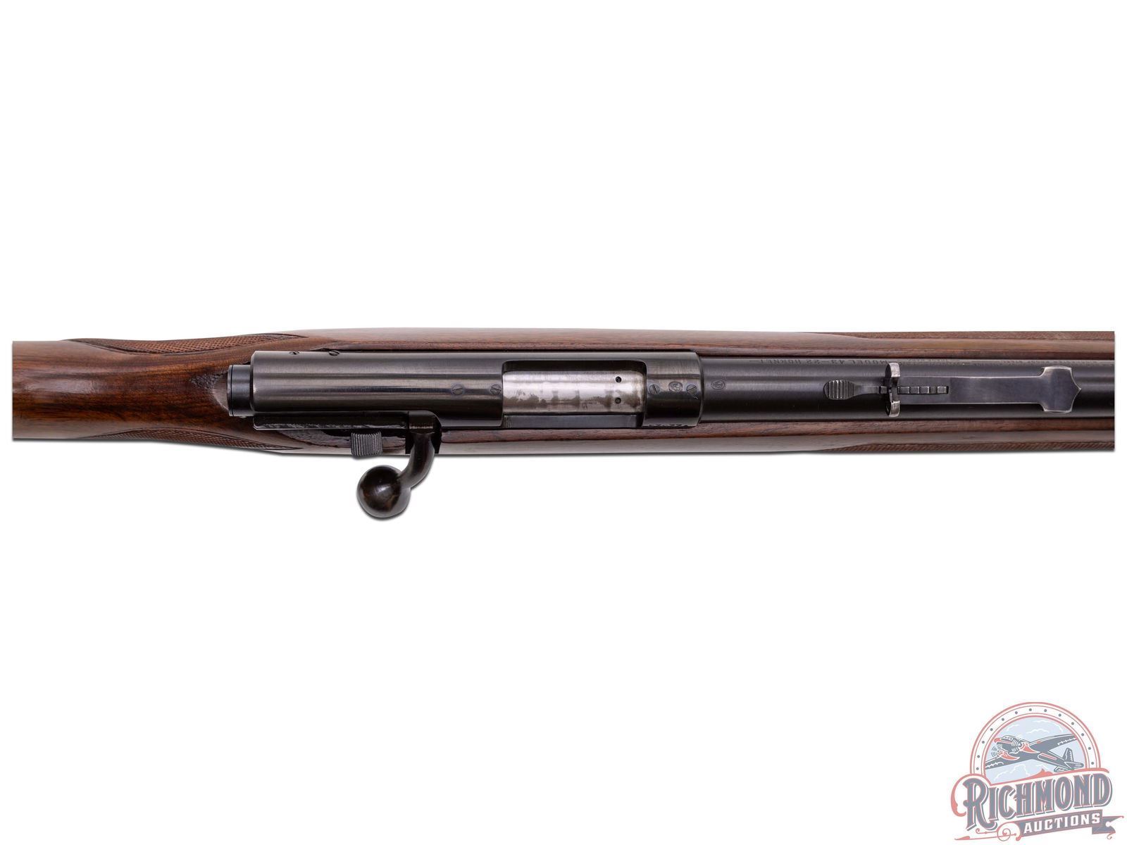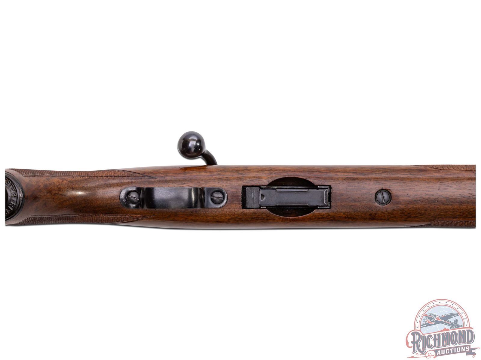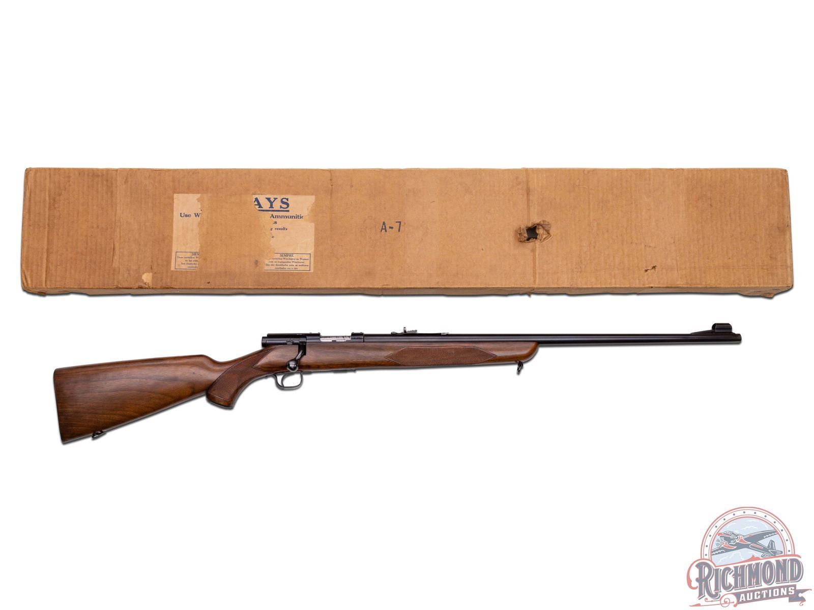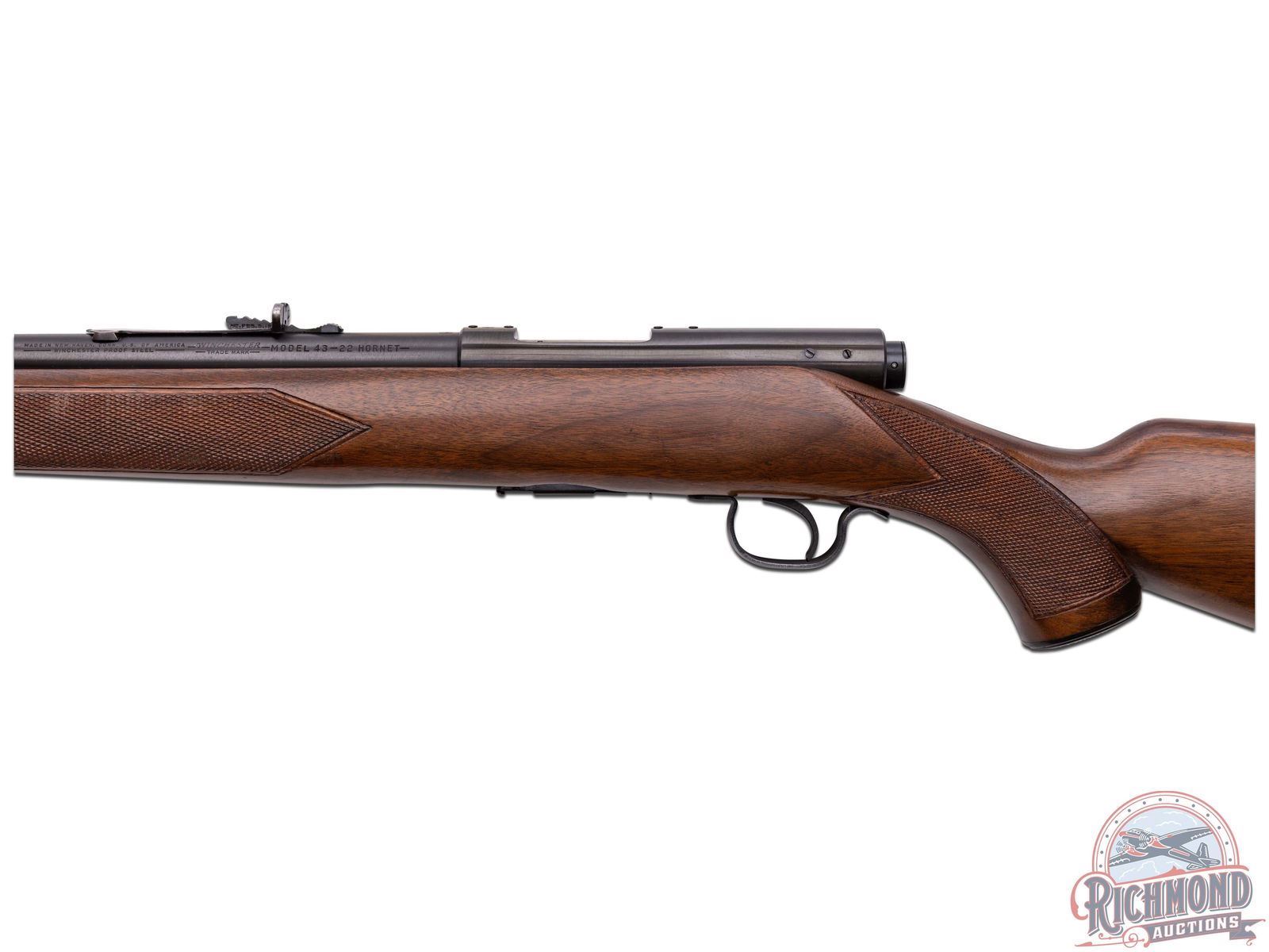 Manufactured circa 1950's and comes with the original factory box. Features a 24" blued round barrel with standard Winchester roll marks and proof marks. Hooded ramp front sight and rear adjustable Buckhorn notch sight. Receiver is factory drilled and tapped for optics. Deluxe walnut wood stock with hand checkered pistol grip and forearm. Fitted with swivel sling rings, Winchester logo metal pistol grip cap and checkered steel butt plate. Includes factory detachable magazine, original factory box and a copy of the original instructions. LOP: 13-3/4". CALIBER: 22 HORNET. S/N: 57677A. FFL STATUS: Curio & Relic.