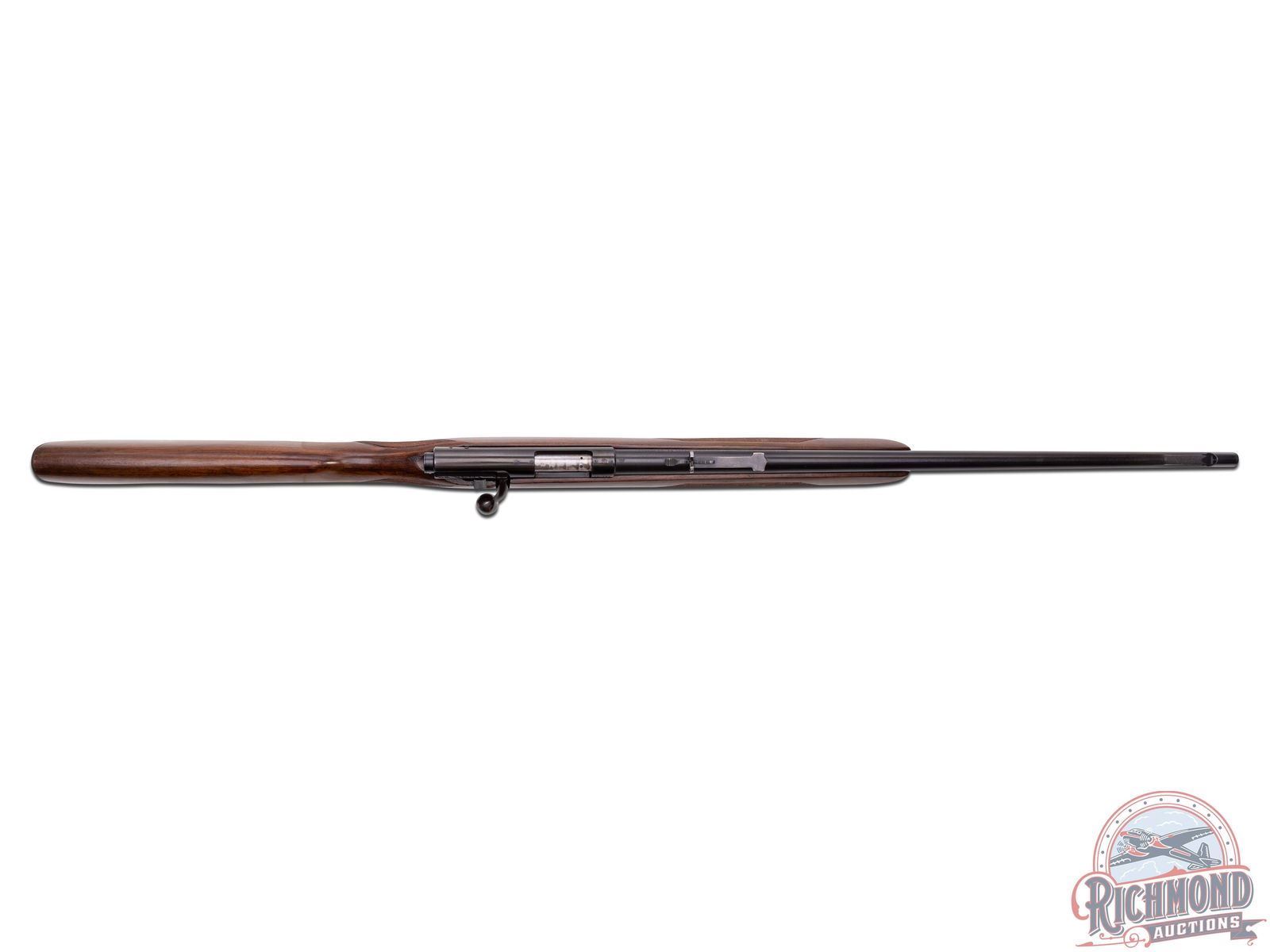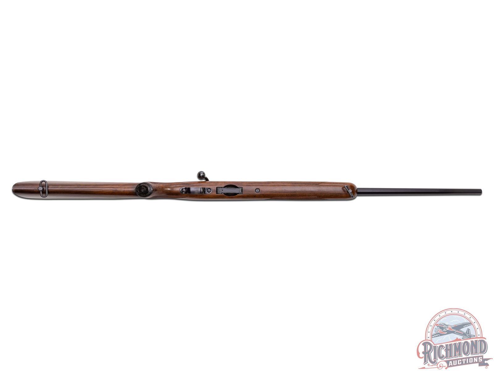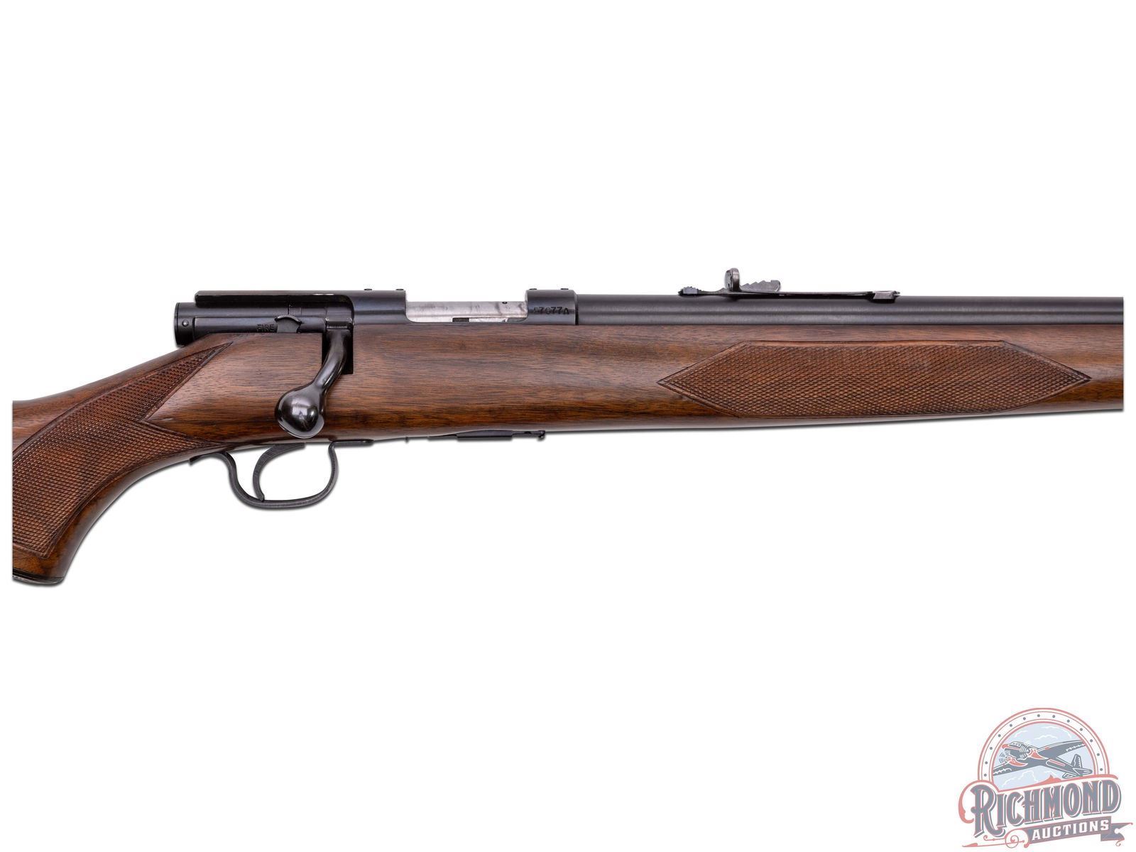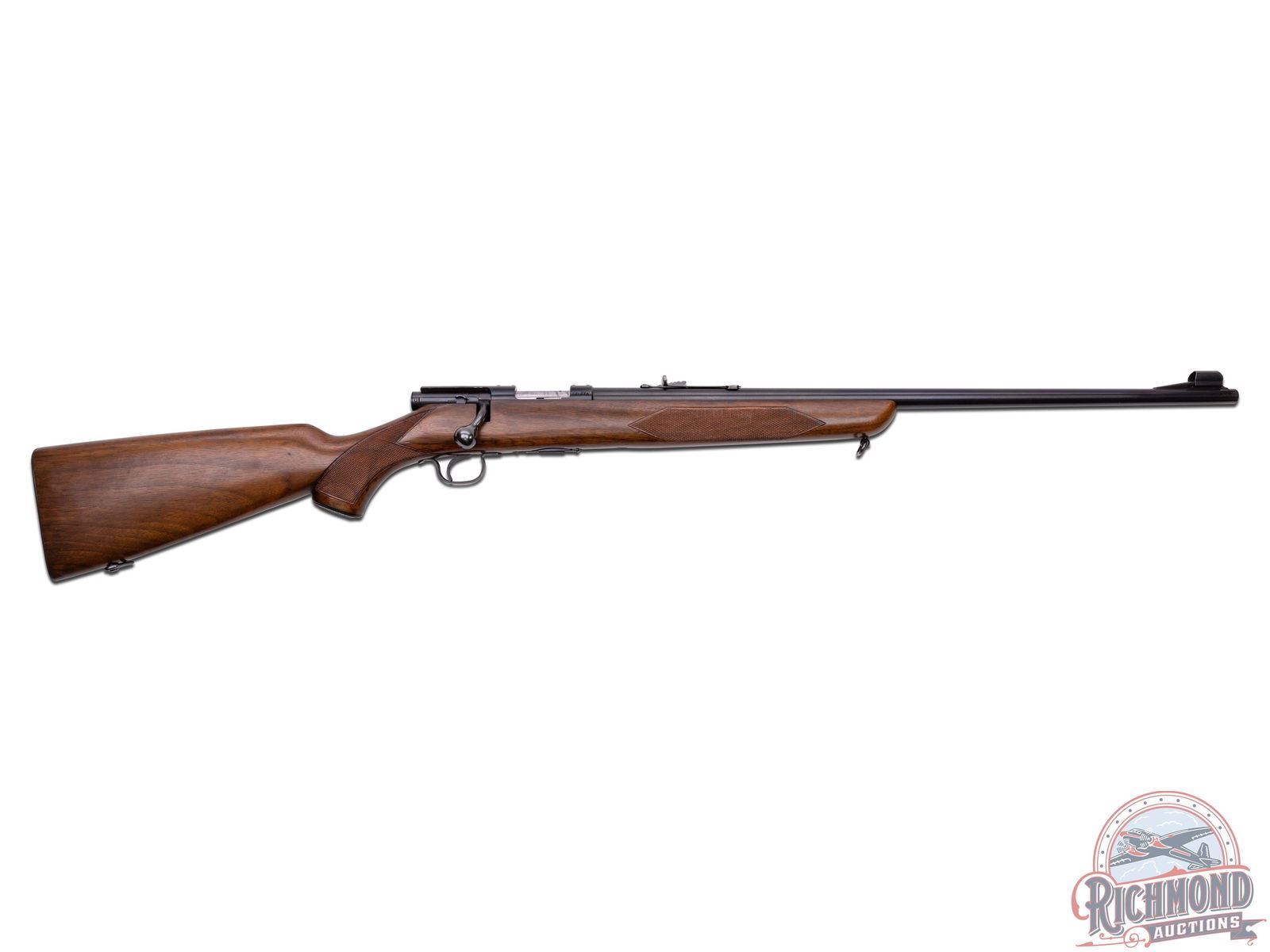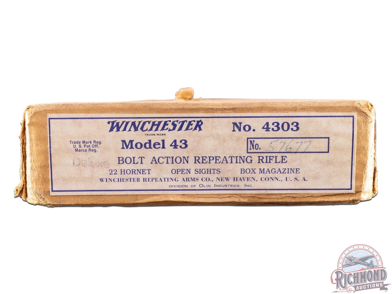 Manufactured circa 1950's and comes with the original factory box. Features a 24" blued round barrel with standard Winchester roll marks and proof marks. Hooded ramp front sight and rear adjustable Buckhorn notch sight. Receiver is factory drilled and tapped for optics. Deluxe walnut wood stock with hand checkered pistol grip and forearm. Fitted with swivel sling rings, Winchester logo metal pistol grip cap and checkered steel butt plate. Includes factory detachable magazine, original factory box and a copy of the original instructions. LOP: 13-3/4". CALIBER: 22 HORNET. S/N: 57677A. FFL STATUS: Curio & Relic.
