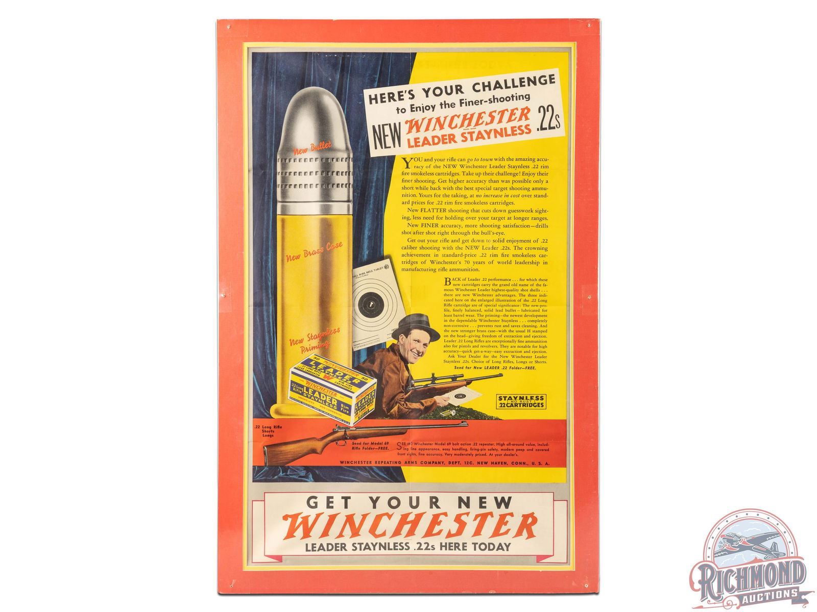 Excellent Winchester paper poster featuring the new Leader Staynless .22 cartridge with box and a Model 69 .22 repeater rifle. Reads "Here's Your Challenge to Enjoy the Finer-shooting." Great color and graphics. Poster is in excellent condition with wear along the fold lines, including a small vertical seam rip through the young man holding his rifle. Shrink wrapped and secured to foamboard with matte frame, which has a few mounting holes along the outer edge. 36" H x 24" W.