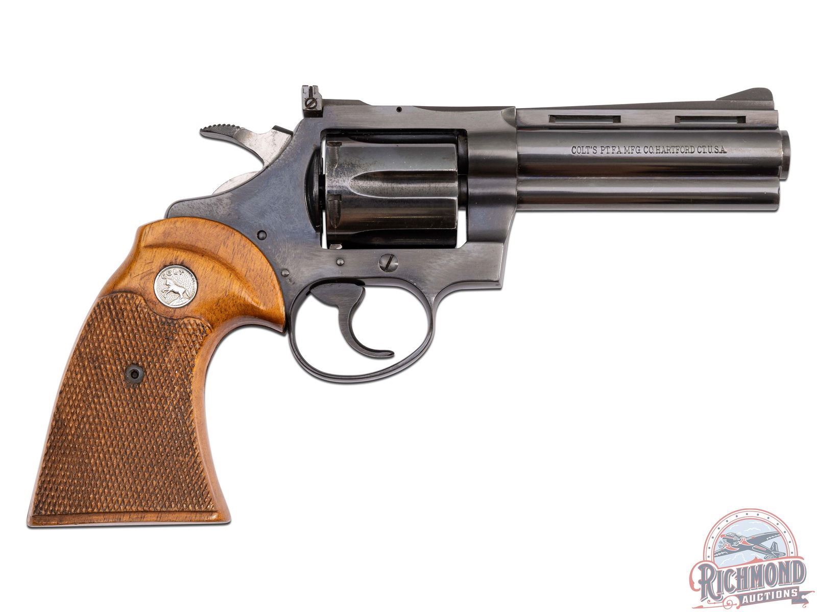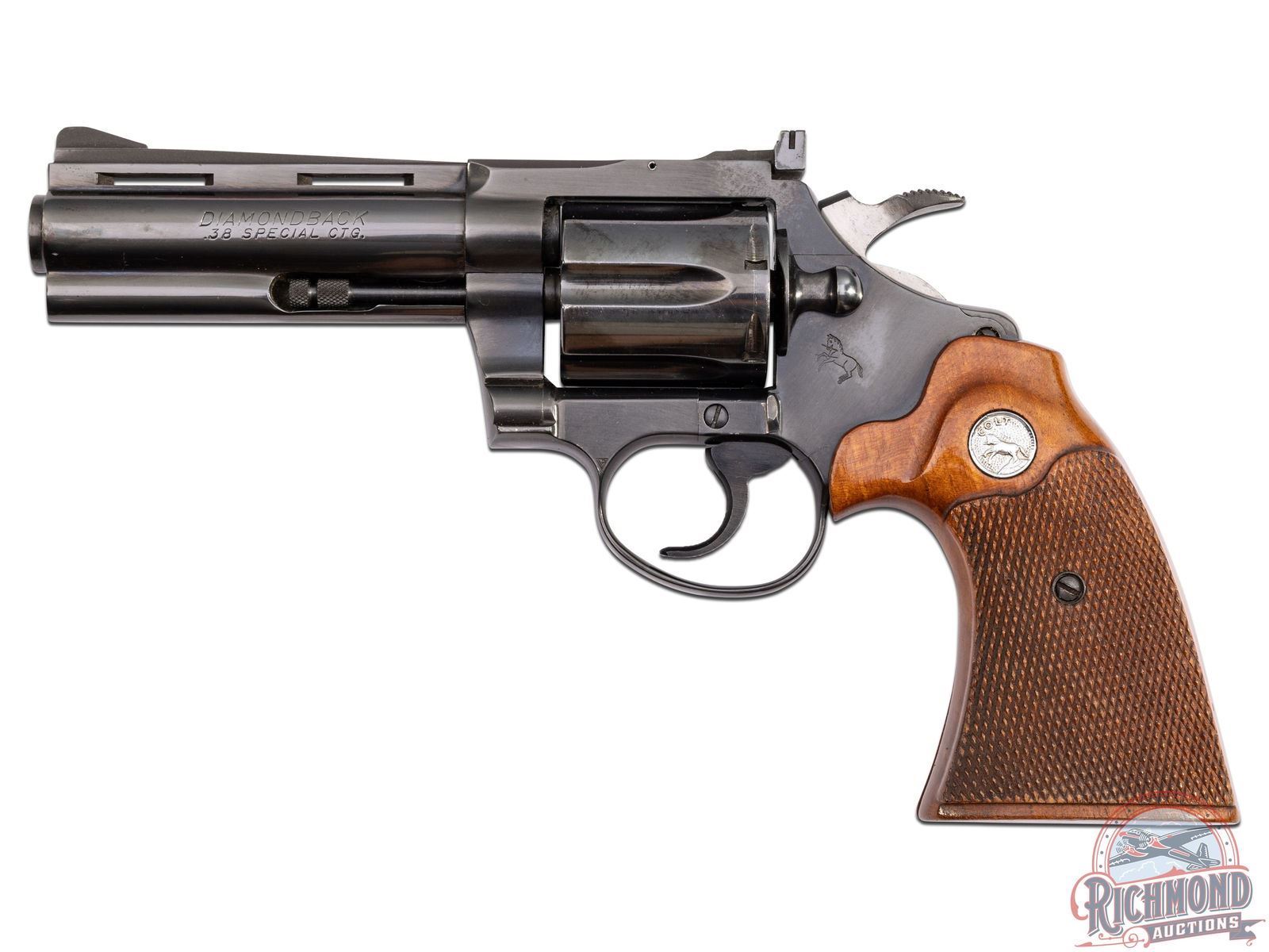 Manufactured in 1969. This beautiful early snake gun features a 4" ventilated barrel with full length ejector shroud. Rear adjustable notch with front ramp sights. Left side of the barrel is stamped "DIAMONDBACK / .38 SPECIAL CTG". Right side of barrel is stamped with a single line Colt address. Left side of the frame is stamped with the Rampant Colt logo. Blued finish with a six round fluted, swing-out cylinder chambered for 38 Special cartridges. Fitted with beautiful factory Colt checkered walnut wood grips with silver tone Colt medallions. CALIBER: 38 SPL. S/N: D37312. FFL STATUS: Curio & Relic.