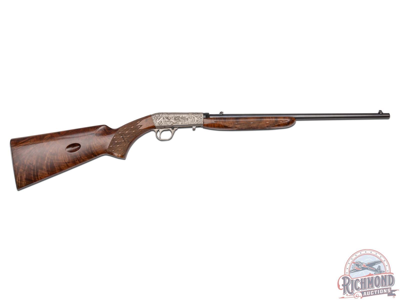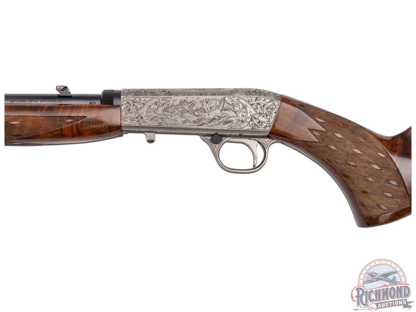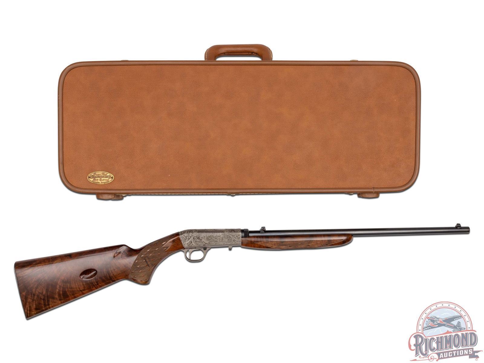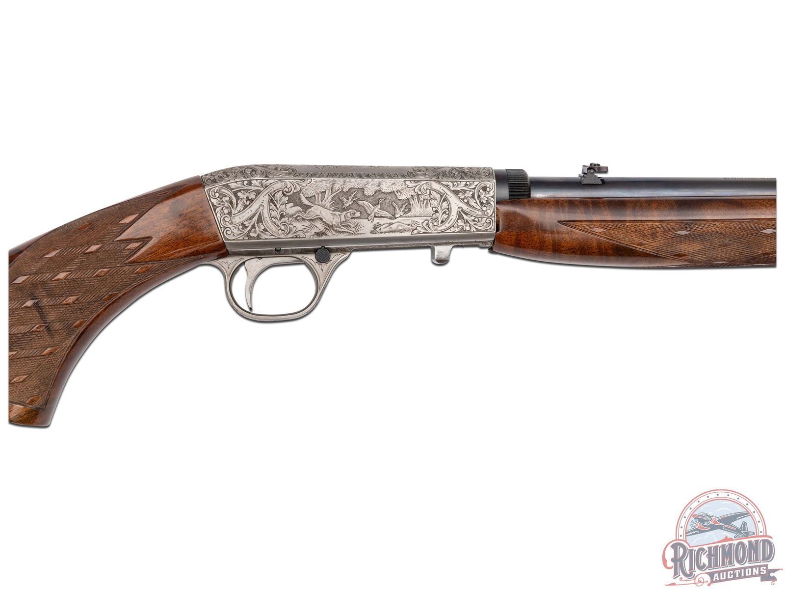 Manufactured in Belgium, in 1969 by FN and is stamped with a Browning Patent Depose barrel. Features a 19-1/4" blued barrel with rear fold-up notch sight and blade front sight. Coin finish receiver and trigger guard with 90% engraved coverage. Left side features a setter flushing pheasants surrounded by a floral scroll design. Top features a retriever with a duck in its mouth framed by a floral scroll design. Right side features a setter flushing mallards in a pond scene surrounded by matching floral scroll design. Both sides of the receiver and the bottom of the barrel is signed "A.BEE". Gold washed trigger, crossbolt safety with floral design engraved on bottom of the trigger guard. Grade III figured walnut stock with side loading magazine and matching forearm with skip-line checkering on the pistol grip and forearm. Fitted with a steel butt plate. Comes in a Browning factory case. This Angelo Bee design is featured on page 334 of the "Browning, Sporting Arms of Distinction" book by Matt Eastman. LOP: 13-3/4". CALIBER: 22 LR. S/N: 69T28725. FFL STATUS: Curio & Relic.