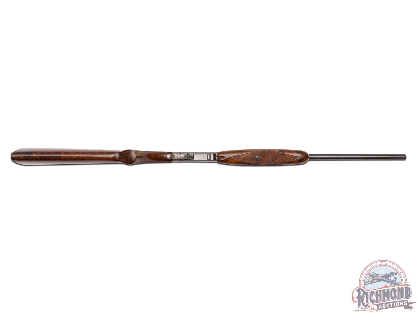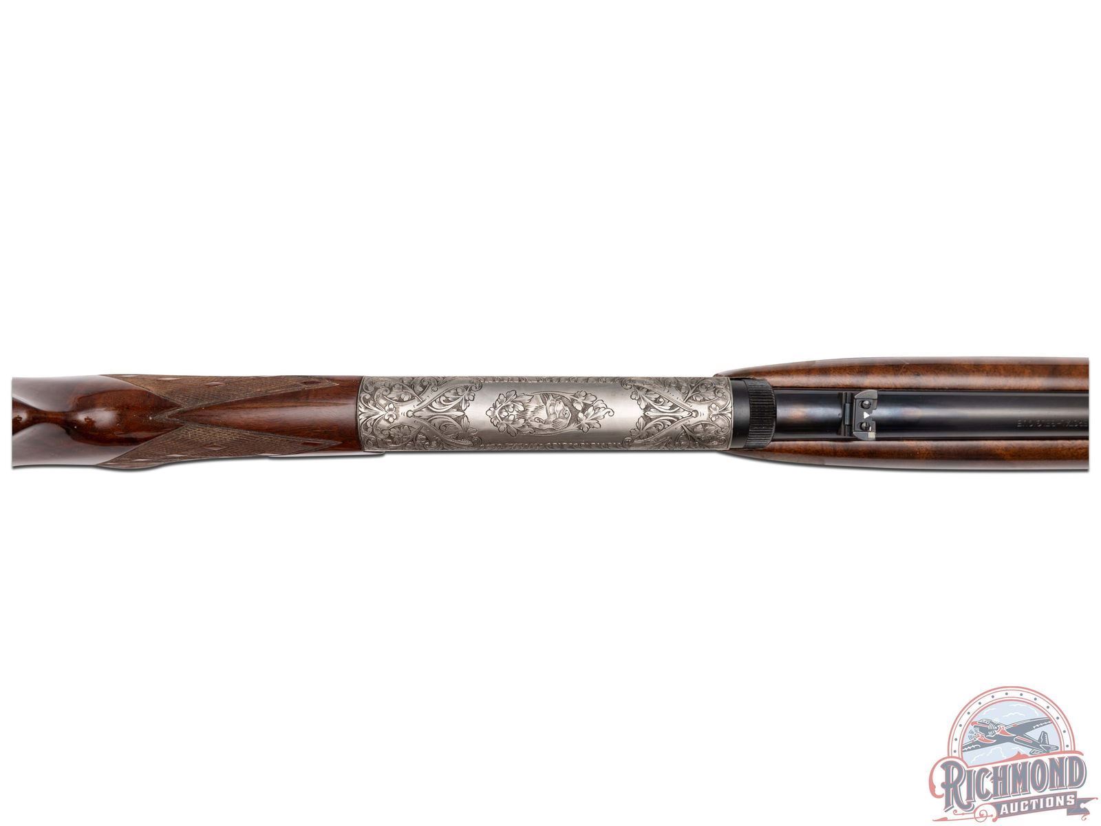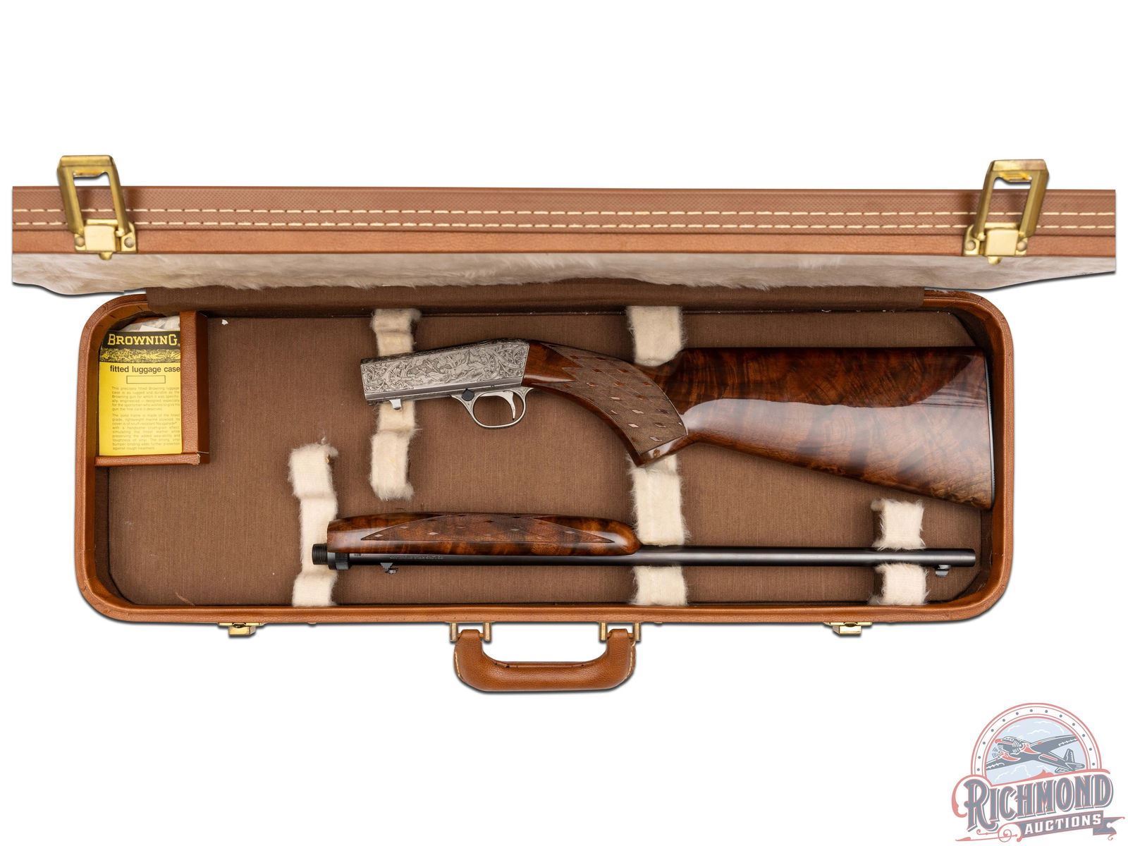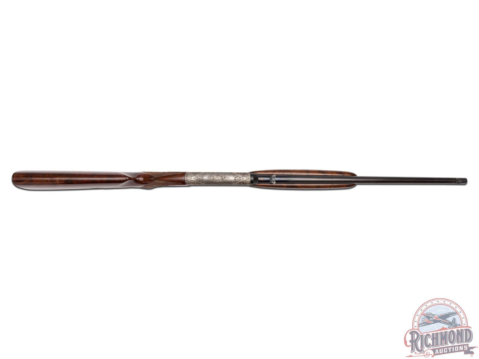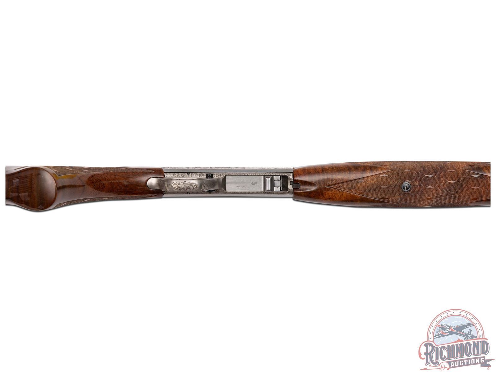 Manufactured in Belgium, in 1969 by FN and is stamped with a Browning Patent Depose barrel. Features a 19-1/4" blued barrel with rear fold-up notch sight and blade front sight. Coin finish receiver and trigger guard with 90% engraved coverage. Left side features a setter flushing pheasants surrounded by a floral scroll design. Top features a retriever with a duck in its mouth framed by a floral scroll design. Right side features a setter flushing mallards in a pond scene surrounded by matching floral scroll design. Both sides of the receiver and the bottom of the barrel is signed "A.BEE". Gold washed trigger, crossbolt safety with floral design engraved on bottom of the trigger guard. Grade III figured walnut stock with side loading magazine and matching forearm with skip-line checkering on the pistol grip and forearm. Fitted with a steel butt plate. Comes in a Browning factory case. This Angelo Bee design is featured on page 334 of the "Browning, Sporting Arms of Distinction" book by Matt Eastman. LOP: 13-3/4". CALIBER: 22 LR. S/N: 69T28725. FFL STATUS: Curio & Relic.