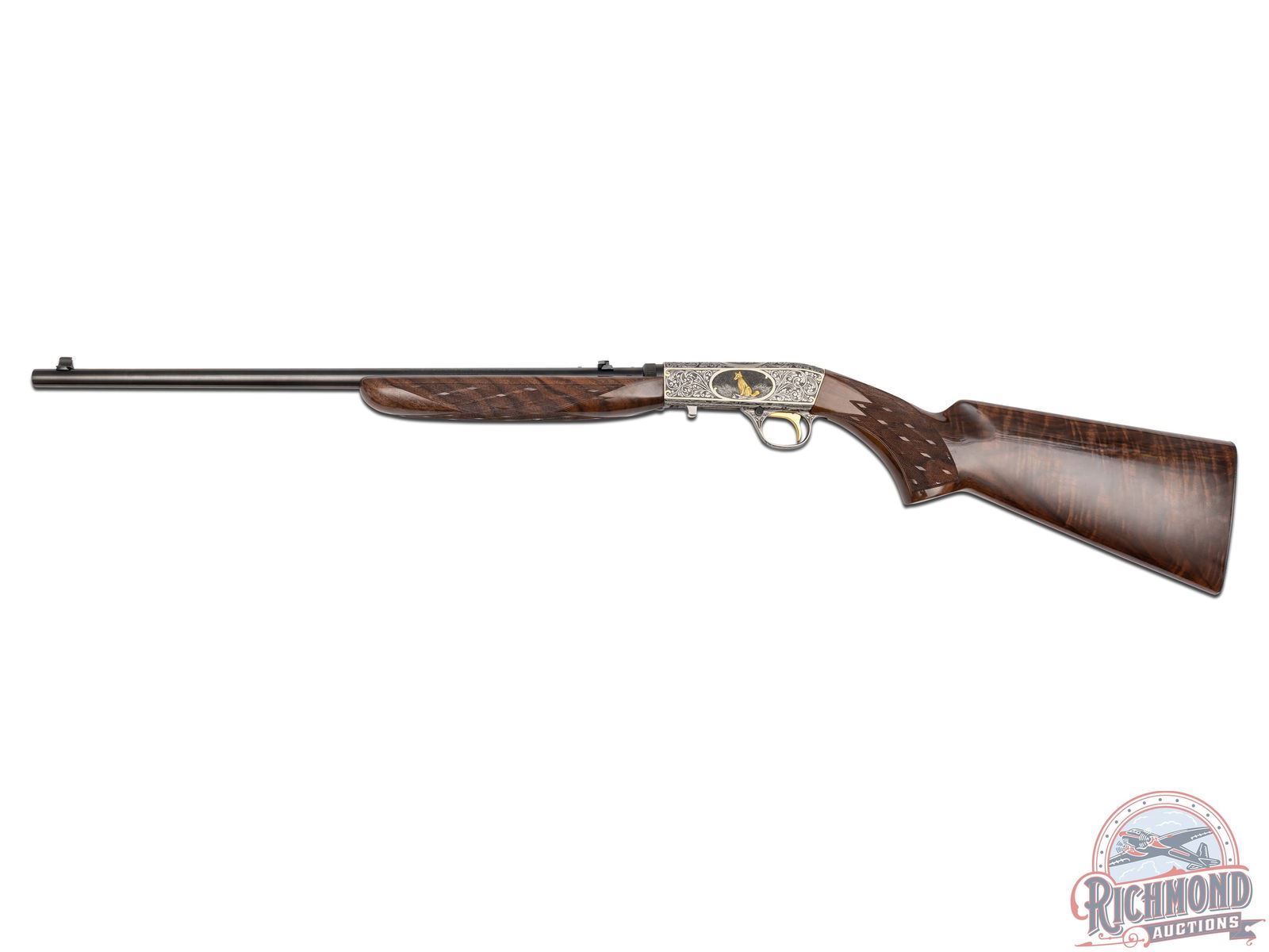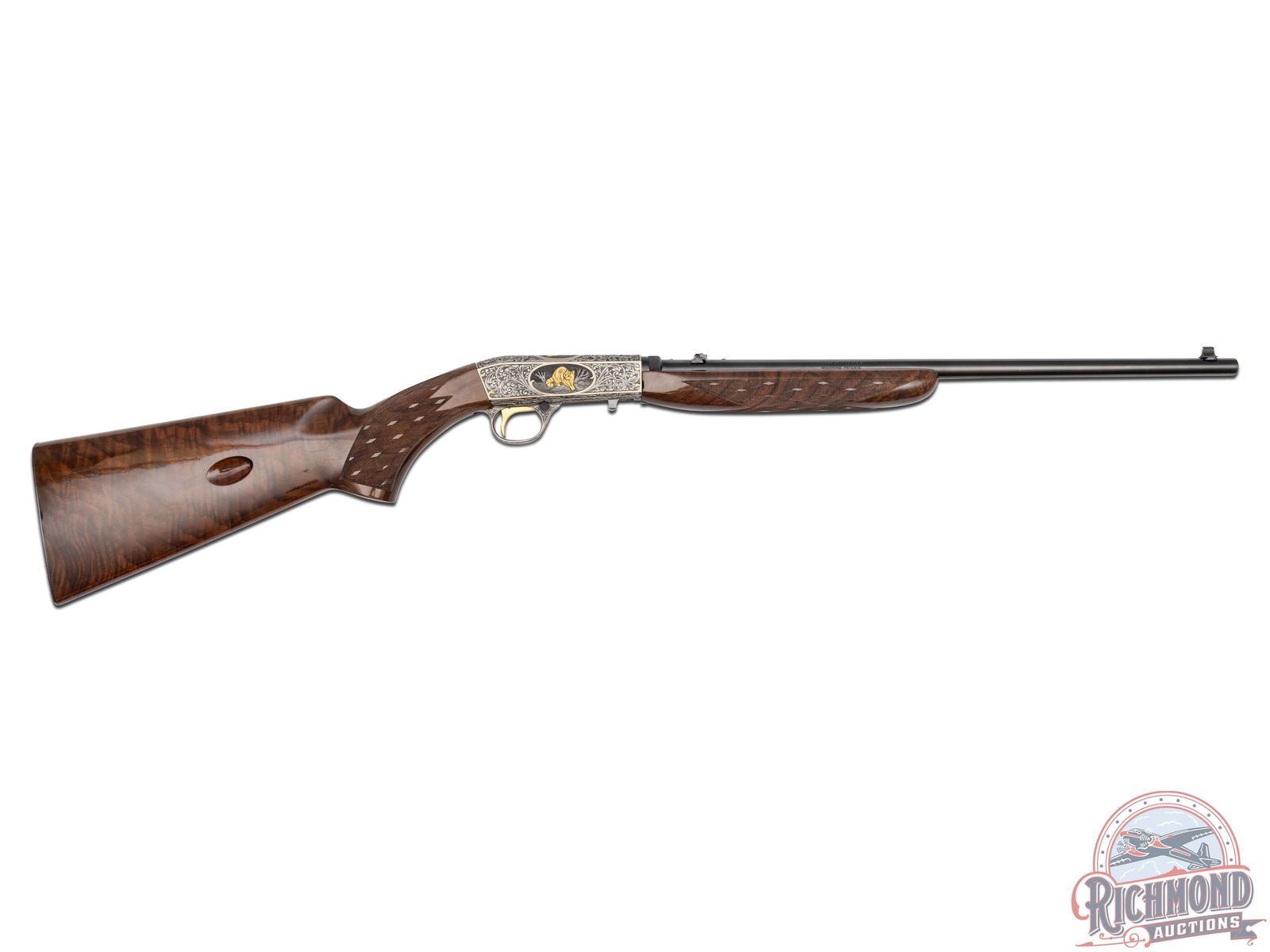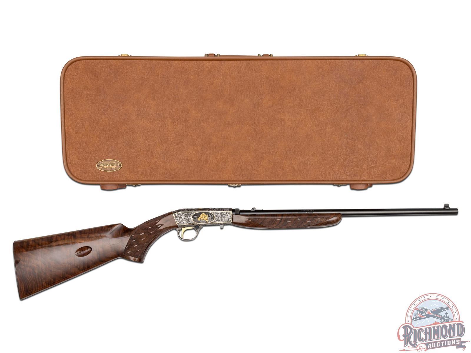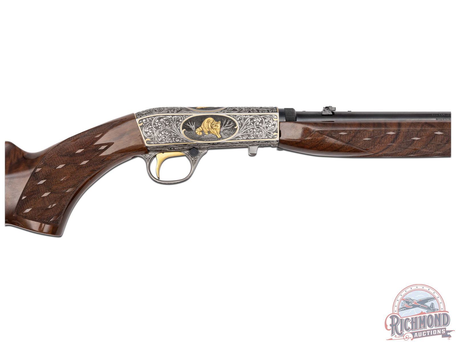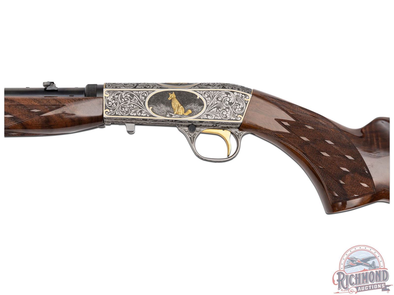 Manufactured in 1971, in Belgium for Browning. This beautiful rifle features a 19-1/4" blued barrel with rear flip-up adjustable notch sight and blade with brass bead front sight. Coin finished receiver features 98% engraved coverage. Left side features a gold embossed fox on a log in a gold bordered oval, surrounded by a deep relief floral scroll design. Top features a gold embossed bird of prey on a limb in a gold bordered oval, surrounded by a deep relief floral scroll design. Right side features a gold embossed raccoon in the field in a gold bordered oval, surrounded by a deep relief floral scroll design. Bottom left side of the receiver is signed "R.REIMER" by master engraver Ron Reimer. Trigger guard is also engraved with a floral scroll design. Gold washed trigger and crossbolt safety. Grade III nicely figured feather crotch walnut stock and forearm, with skip-line checkered pistol grip and forearm. Fitted with a factory steel butt plate. Comes in a Browning take-down case with original Browning case paperwork. CALIBER: 22 LR. S/N: 71T58745. FFL STATUS: Curio & Relic.
