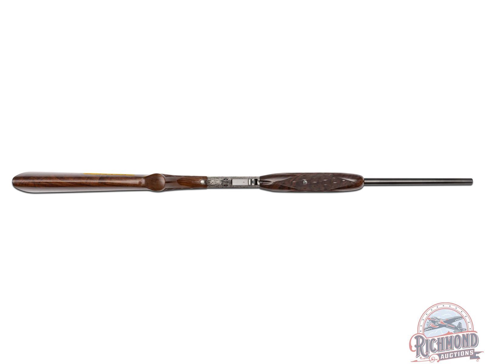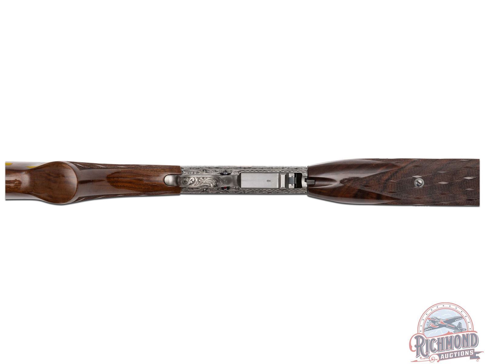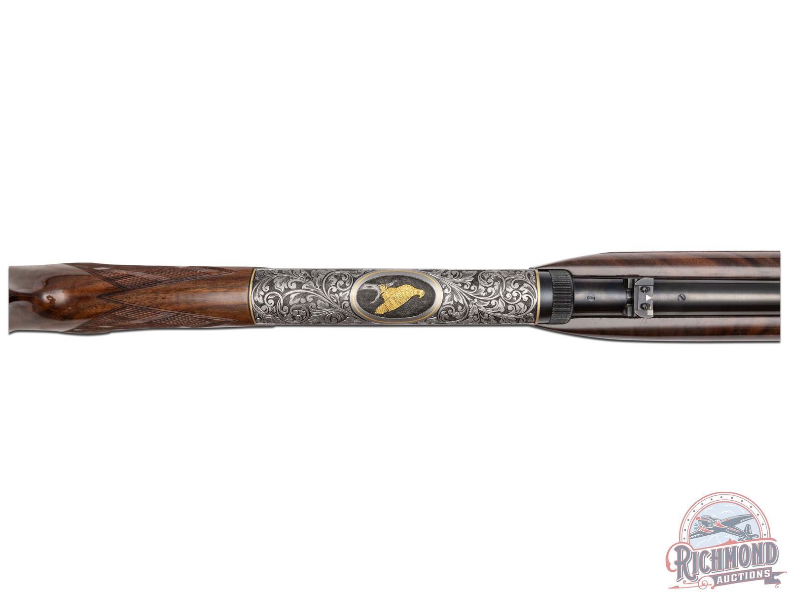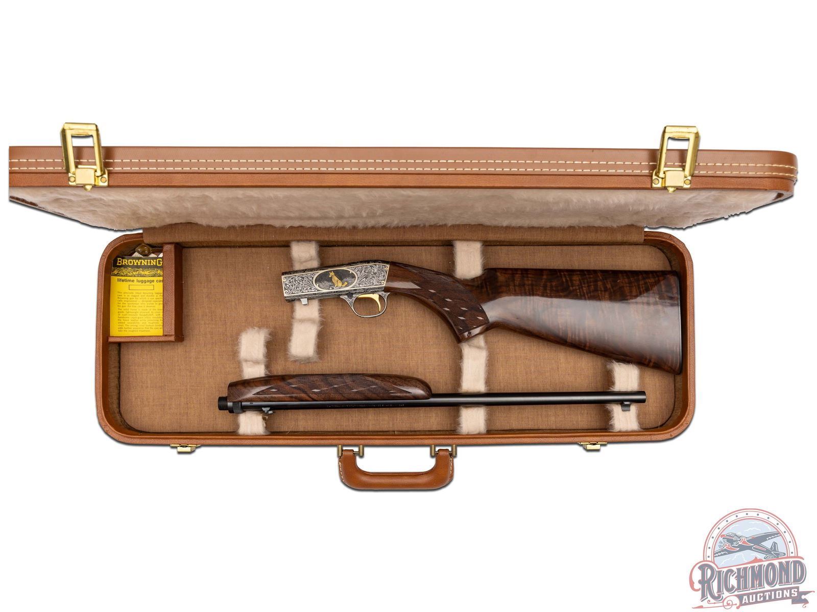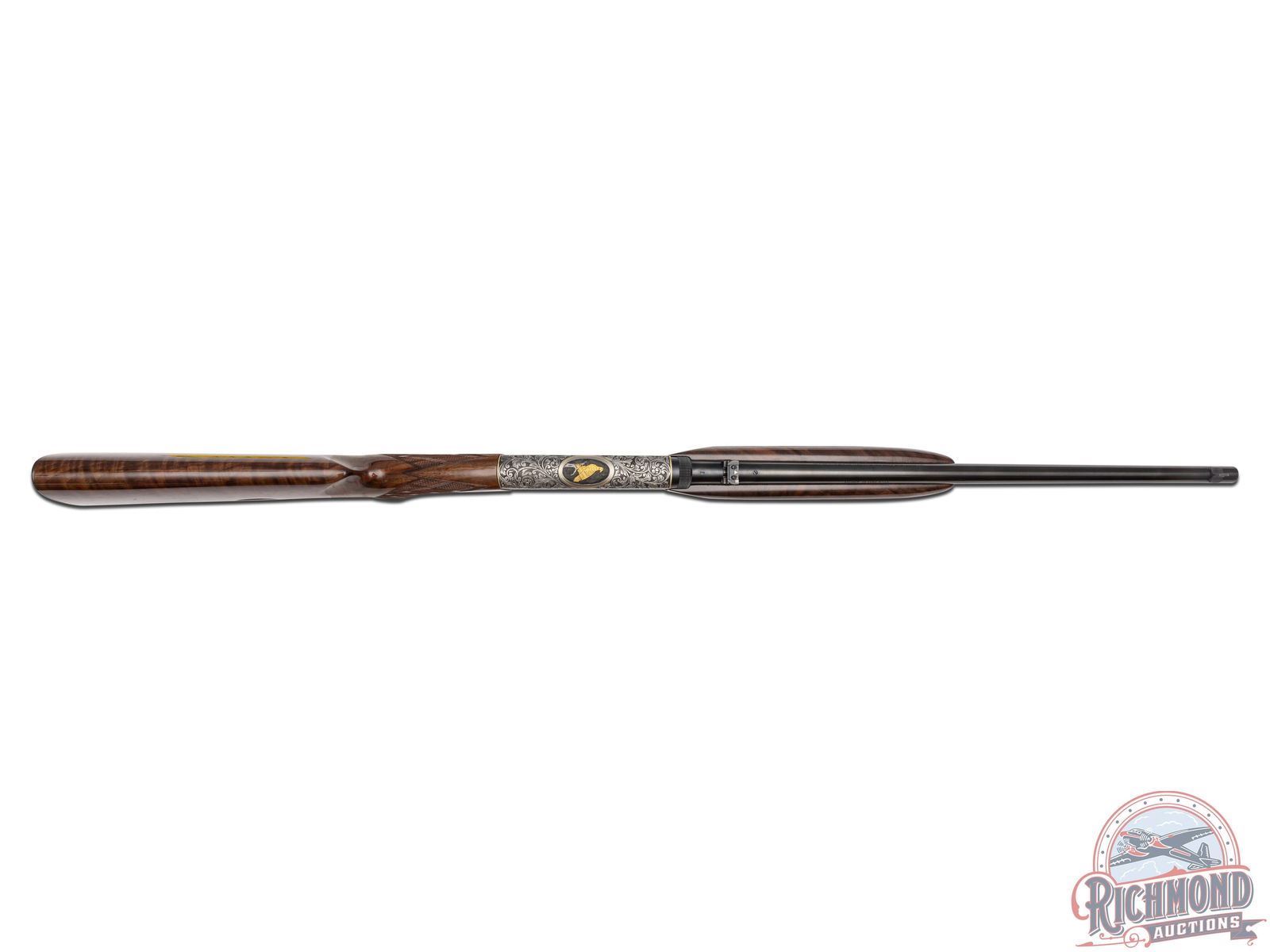 Manufactured in 1971, in Belgium for Browning. This beautiful rifle features a 19-1/4" blued barrel with rear flip-up adjustable notch sight and blade with brass bead front sight. Coin finished receiver features 98% engraved coverage. Left side features a gold embossed fox on a log in a gold bordered oval, surrounded by a deep relief floral scroll design. Top features a gold embossed bird of prey on a limb in a gold bordered oval, surrounded by a deep relief floral scroll design. Right side features a gold embossed raccoon in the field in a gold bordered oval, surrounded by a deep relief floral scroll design. Bottom left side of the receiver is signed "R.REIMER" by master engraver Ron Reimer. Trigger guard is also engraved with a floral scroll design. Gold washed trigger and crossbolt safety. Grade III nicely figured feather crotch walnut stock and forearm, with skip-line checkered pistol grip and forearm. Fitted with a factory steel butt plate. Comes in a Browning take-down case with original Browning case paperwork. CALIBER: 22 LR. S/N: 71T58745. FFL STATUS: Curio & Relic.