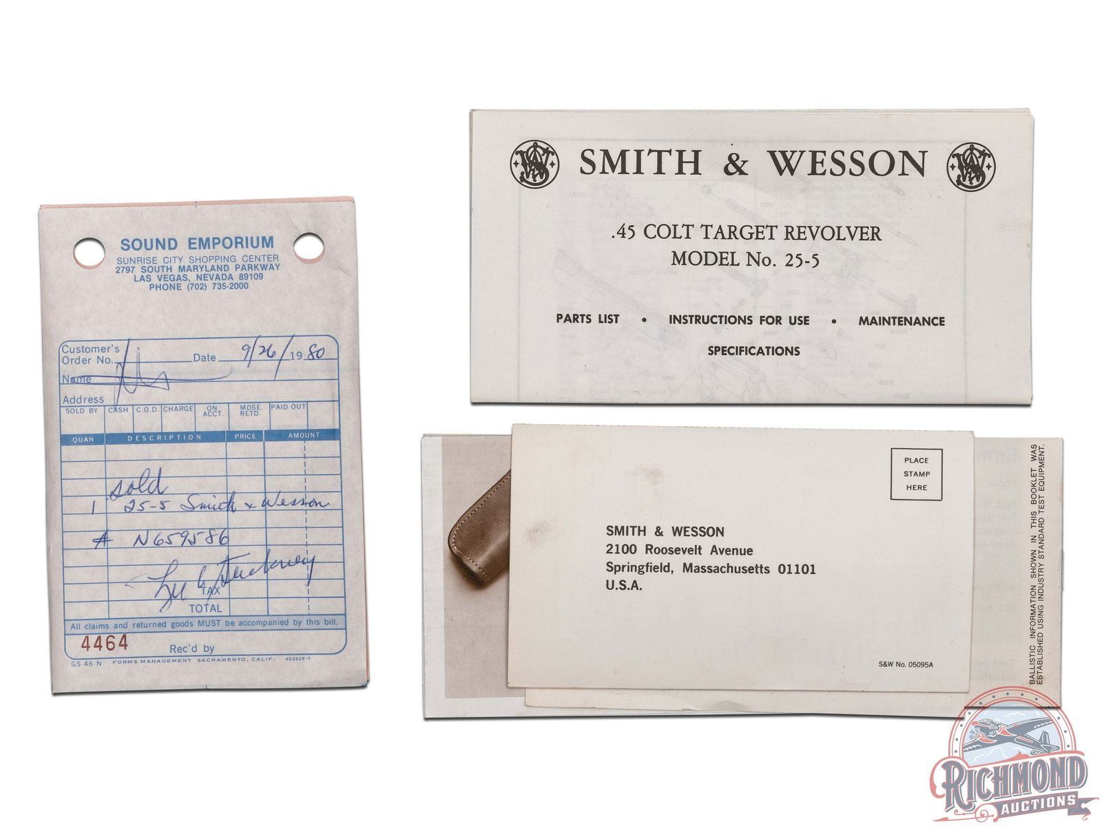 Manufactured in 1980. This classic double/single action revolver features an 8" barrel with rear adjustable white outlined notch sight and red highlighted front ramp. Blued finish with a 6-round swing-out fluted cylinder. case-hardened hammer and trigger. Fitted with factory walnut checkered grips with silver tone S&W logo medallions. Comes in a nice oak presentation case with original factory cleaning tools, manual, paperwork and original receipt. CALIBER: 45 COLT. S/N: N659586. FFL STATUS: Modern.