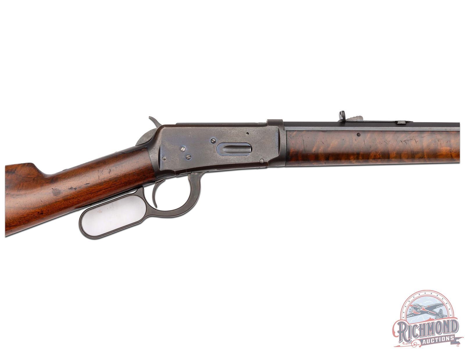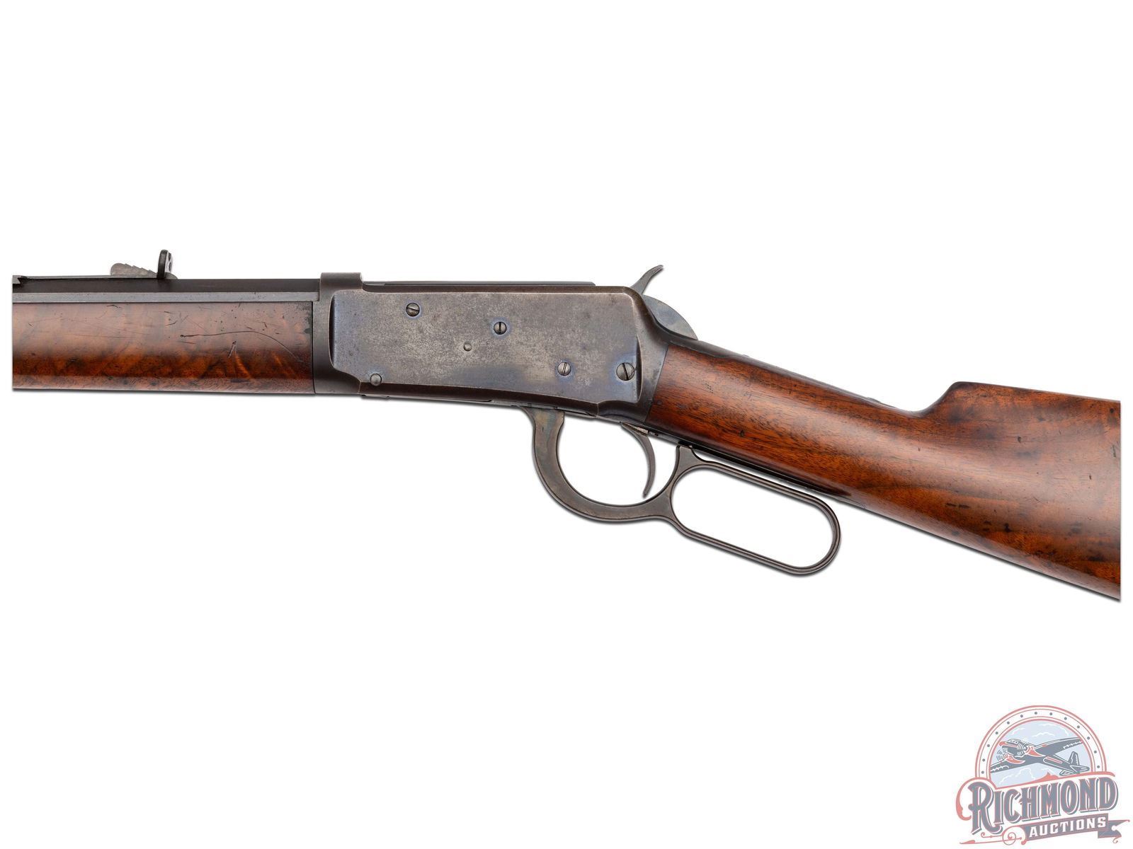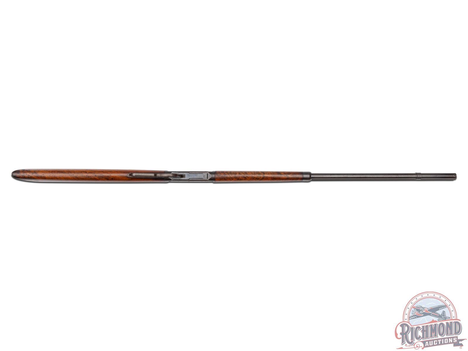 Manufactured in 1894, first year production for the model 1894. This nice rifle features a 26" blued octagon barrel with full length magazine. Period correct rear semi-buckhorn and front nickel blade sight. Period correct barrel stampings. Side loading gate action with case-hardened lever and hammer. Nicely figured walnut straight grip stock and matching forearm with blued forearm. Fitted with a steel crescent butt plate. LOP: 13". CALIBER: 38-55. S/N: 3355. FFL STATUS: Antique.