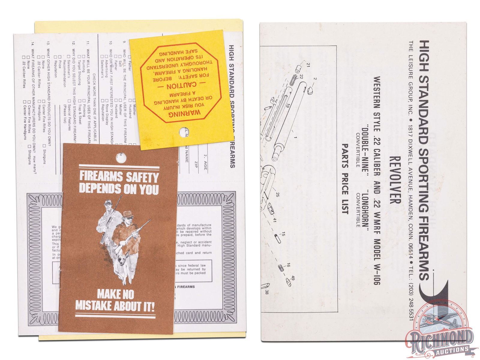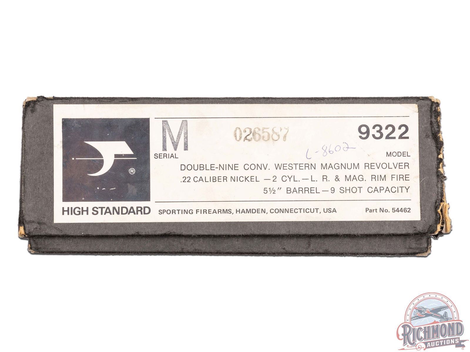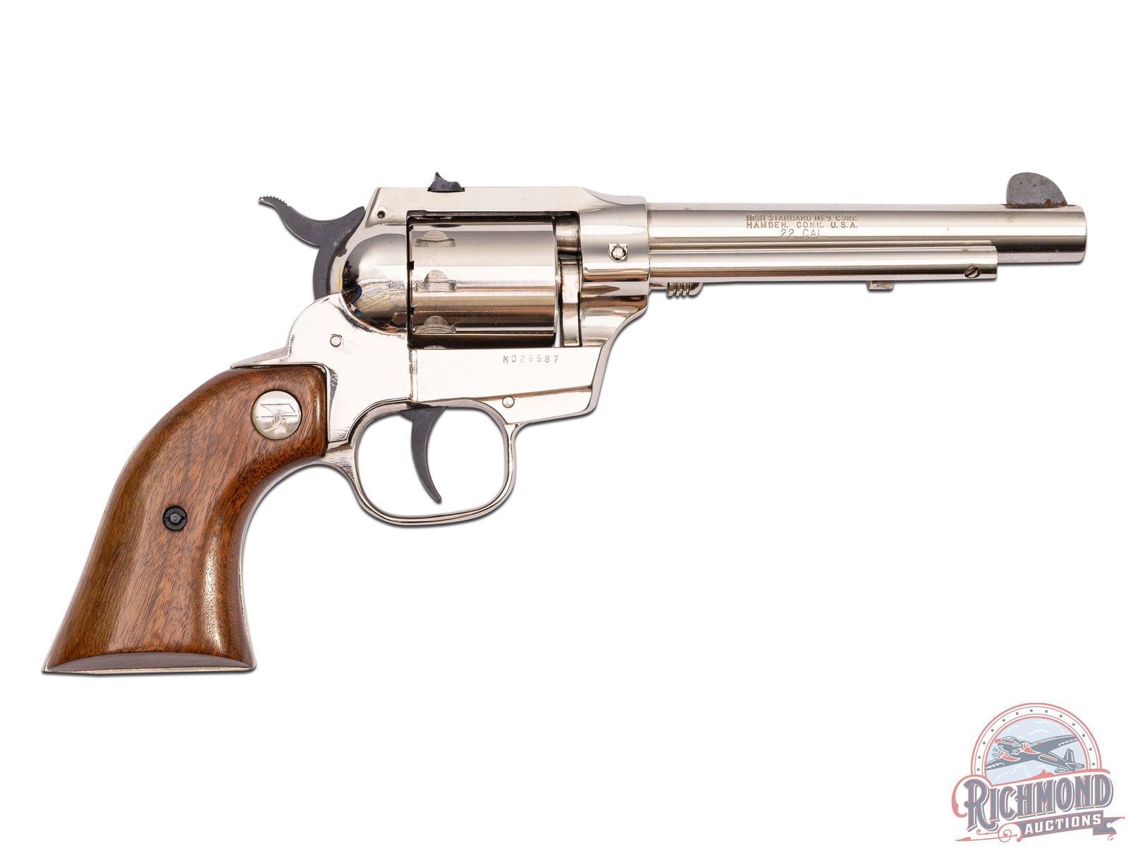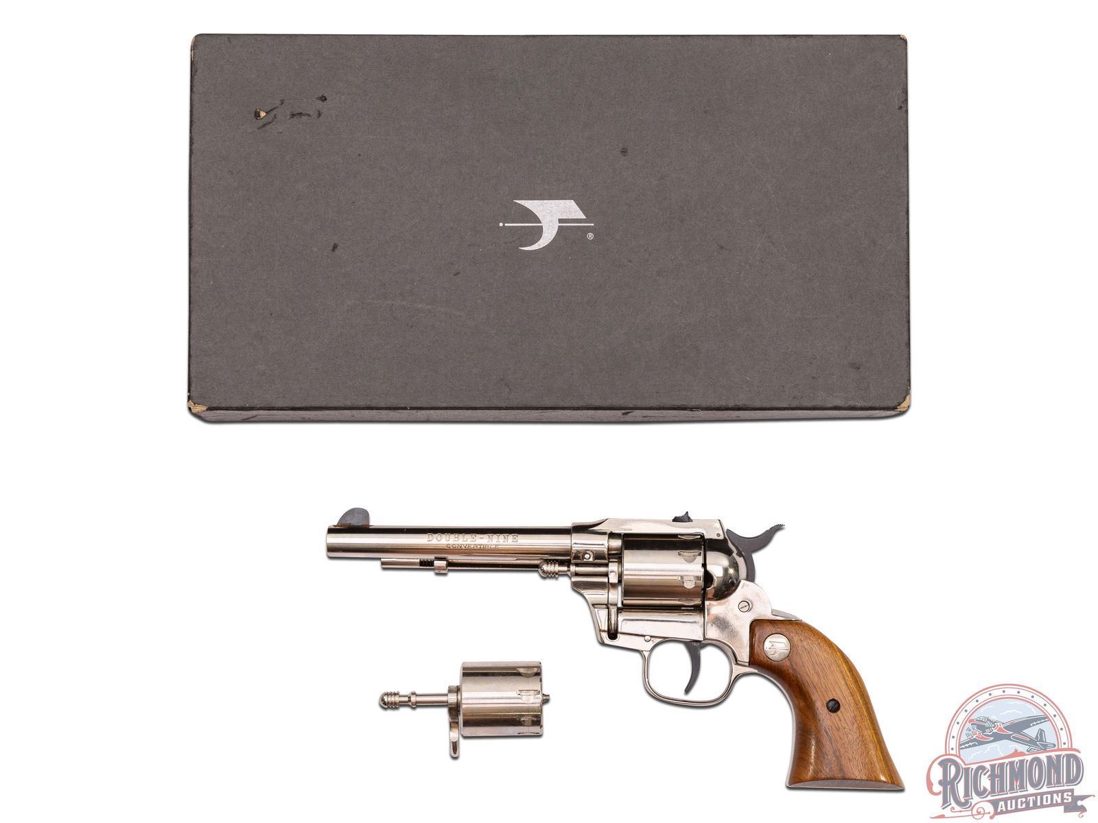 Manufactured in the late 1970's. This western magnum revolver features a 5-1/2" barrel with rear notch and front blade sight. Stamped on the left side of the barrel "DOUBLE NINE / CONVERTIBLE". Non-fluted swing-out cylinder holds up to 9 rounds in both the 22 LR and 22 Magnum cylinders, giving it its moniker. Scarce, nickel finish. Fitted with smooth walnut grips with the eagle logo medallions. Comes in the original factory box. CALIBER: 22 MAG / 22 LR. S/N: M026587. FFL STATUS: Modern.