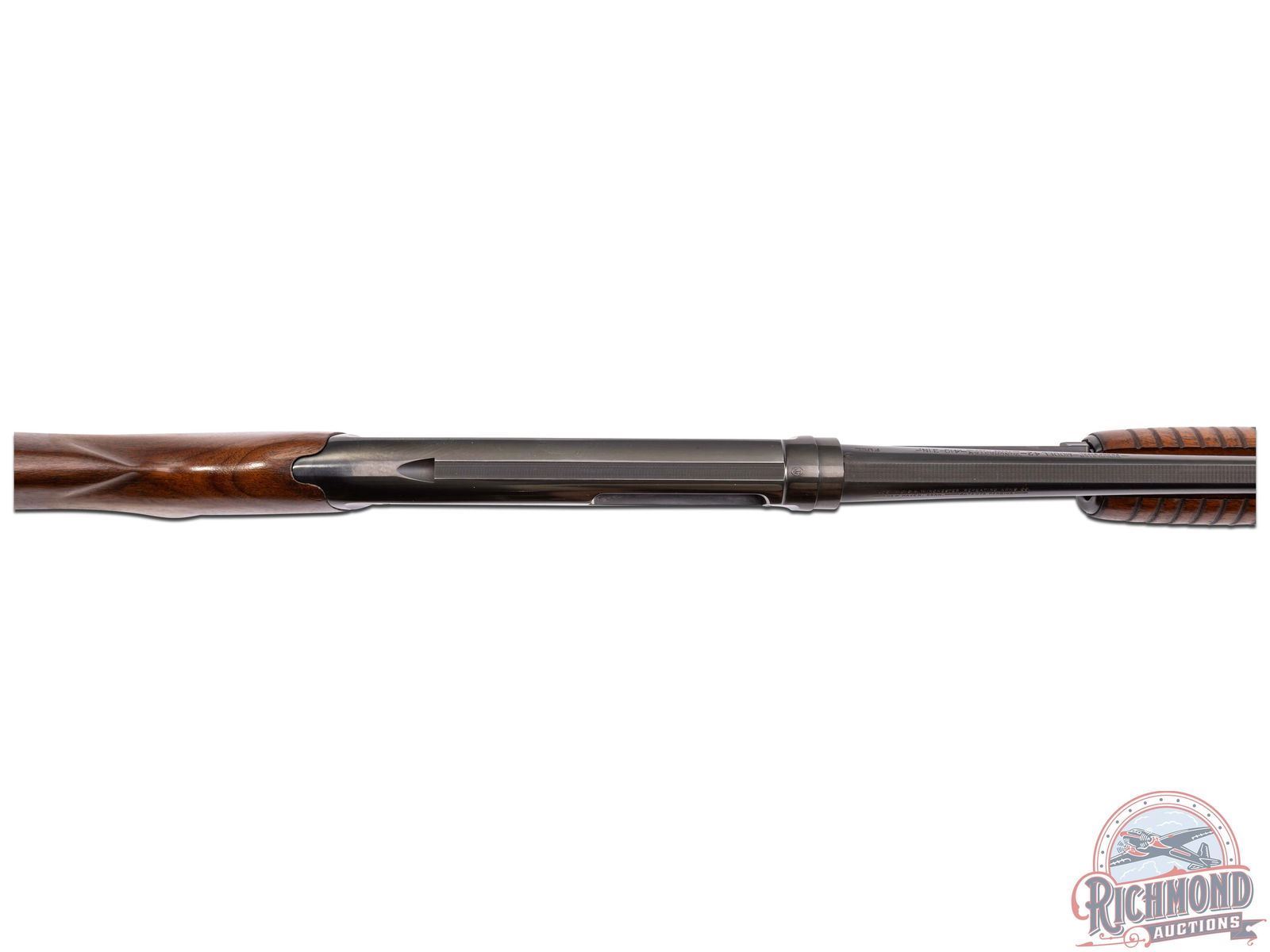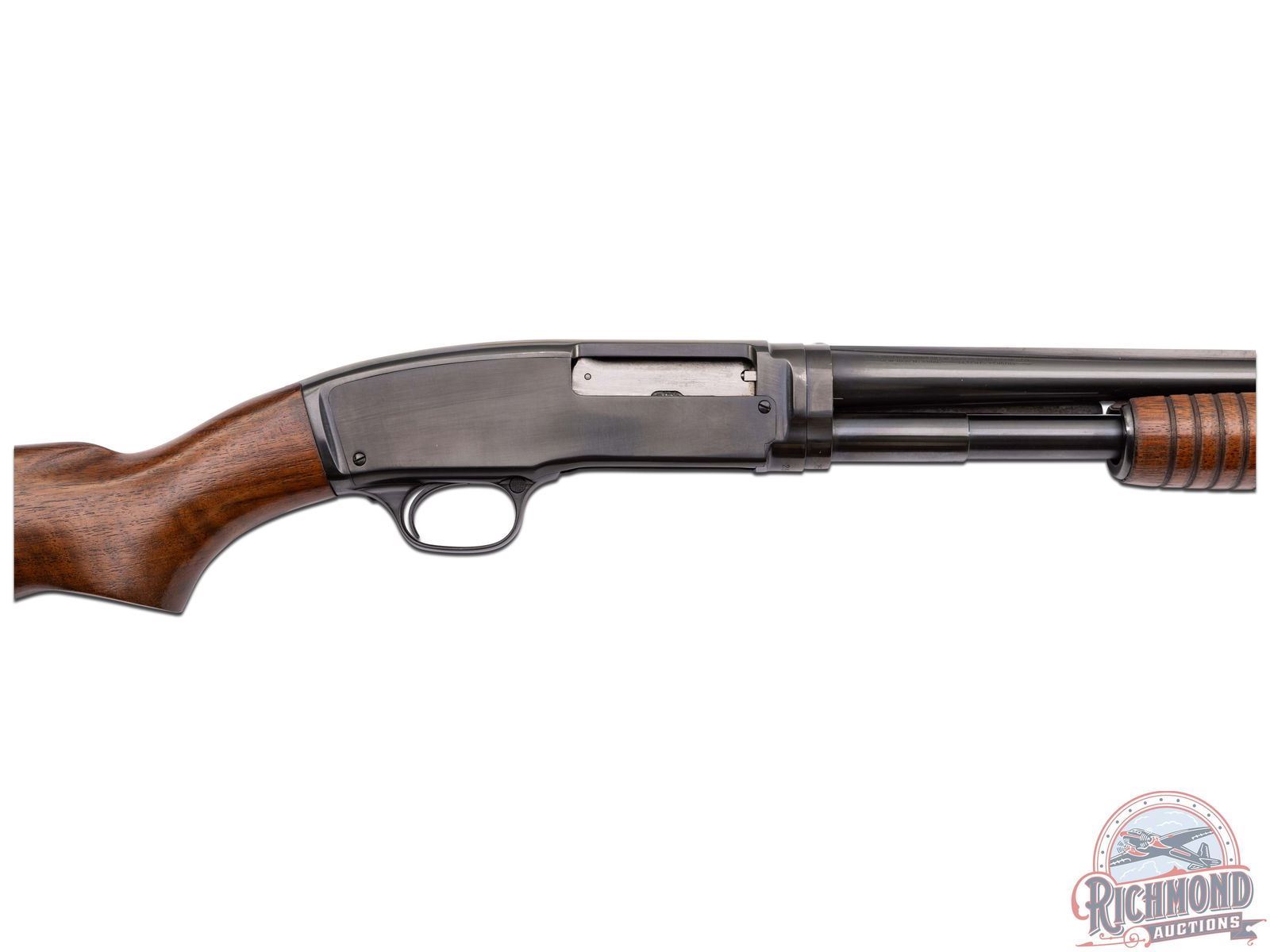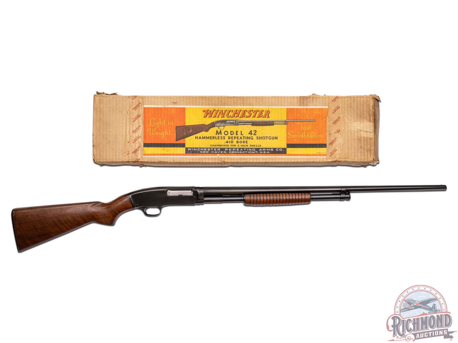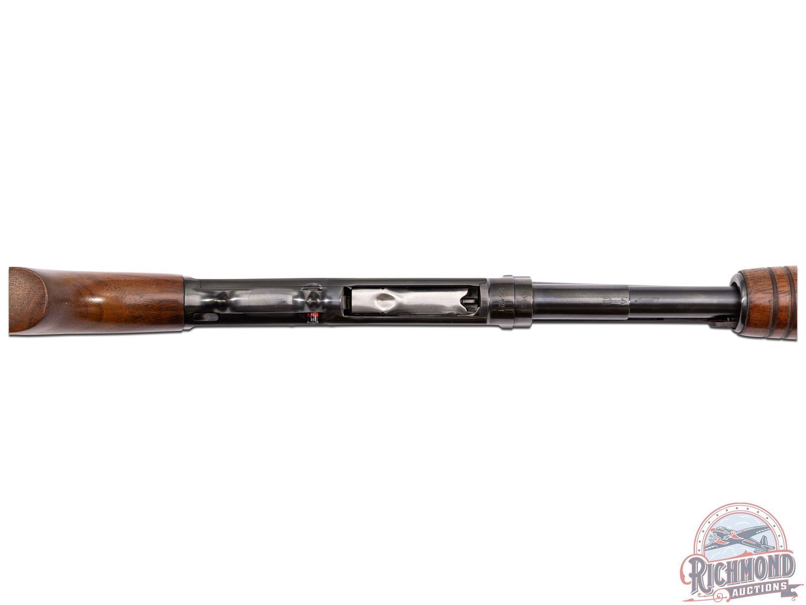 Manufactured in 1936, and rarely seen in this condition in the original box! Features a 28" blued barrel with solid rib, nickel bead front sight, chambered for 3" shells with Full choke. All standard Winchester roll stamps and proof marks. Blued receiver with crossbolt safety. Satin walnut wood stock and 18 rib forearm. Fitted with a factory Winchester butt plate. Includes the original factory box and paperwork. LOP: 13-3/4". DAC: 1-3/4". DAH: 2-1/2". CALIBER: 410. S/N: 25421. FFL STATUS: Curio & Relic.