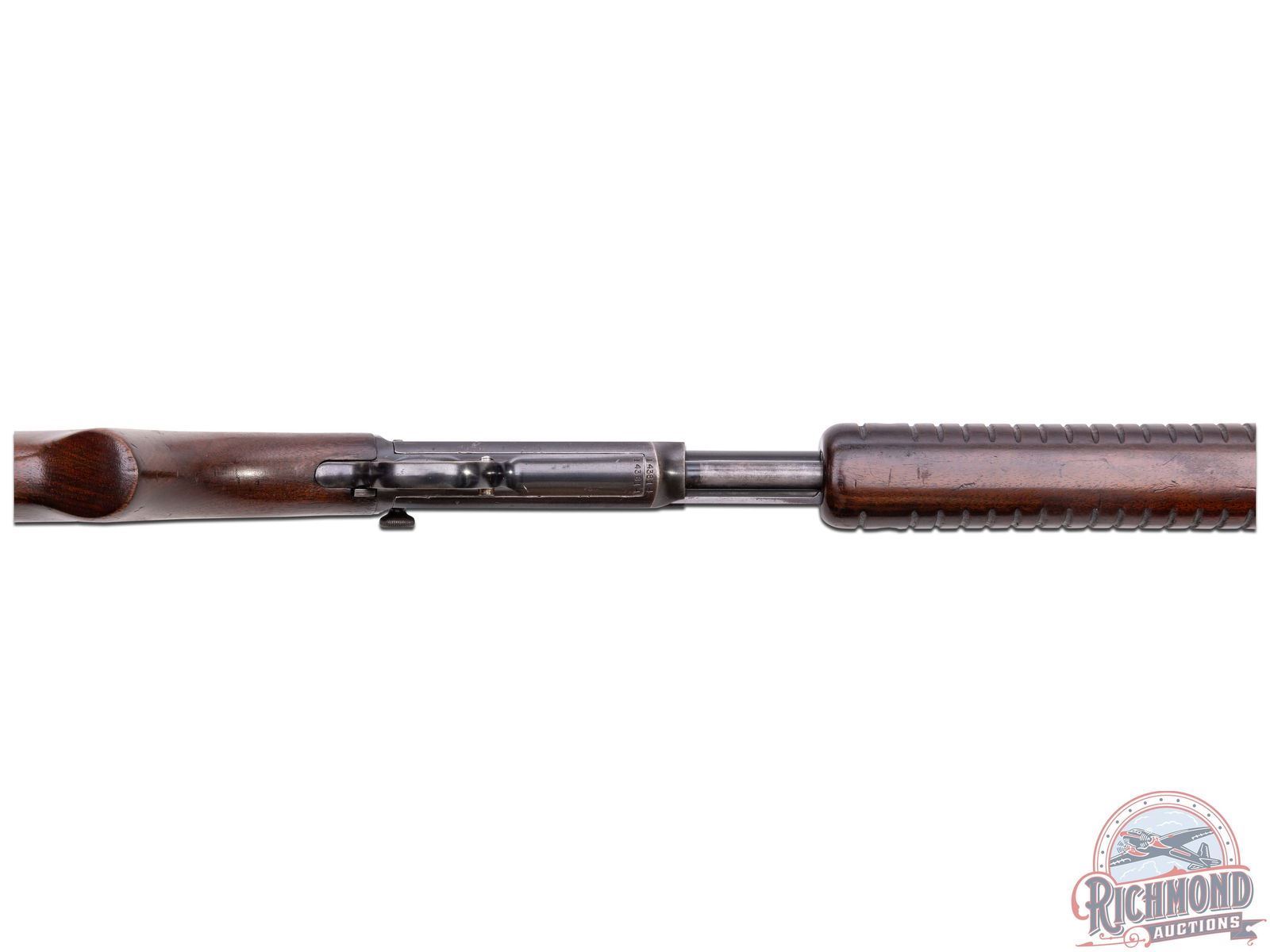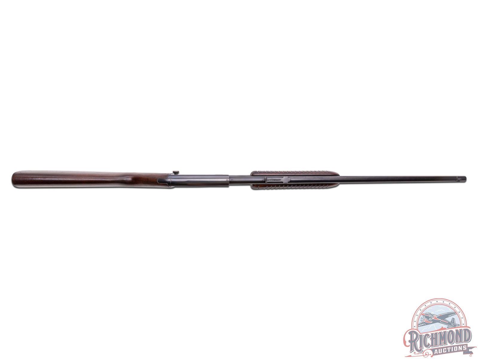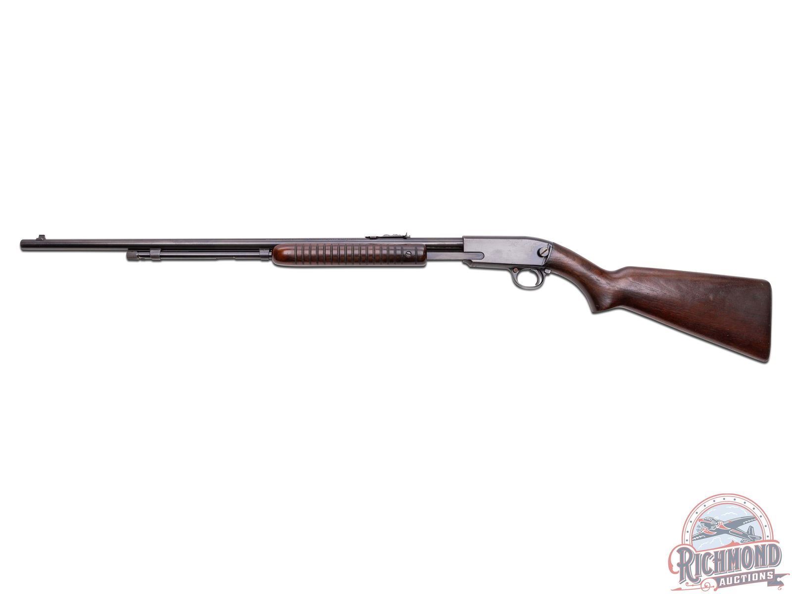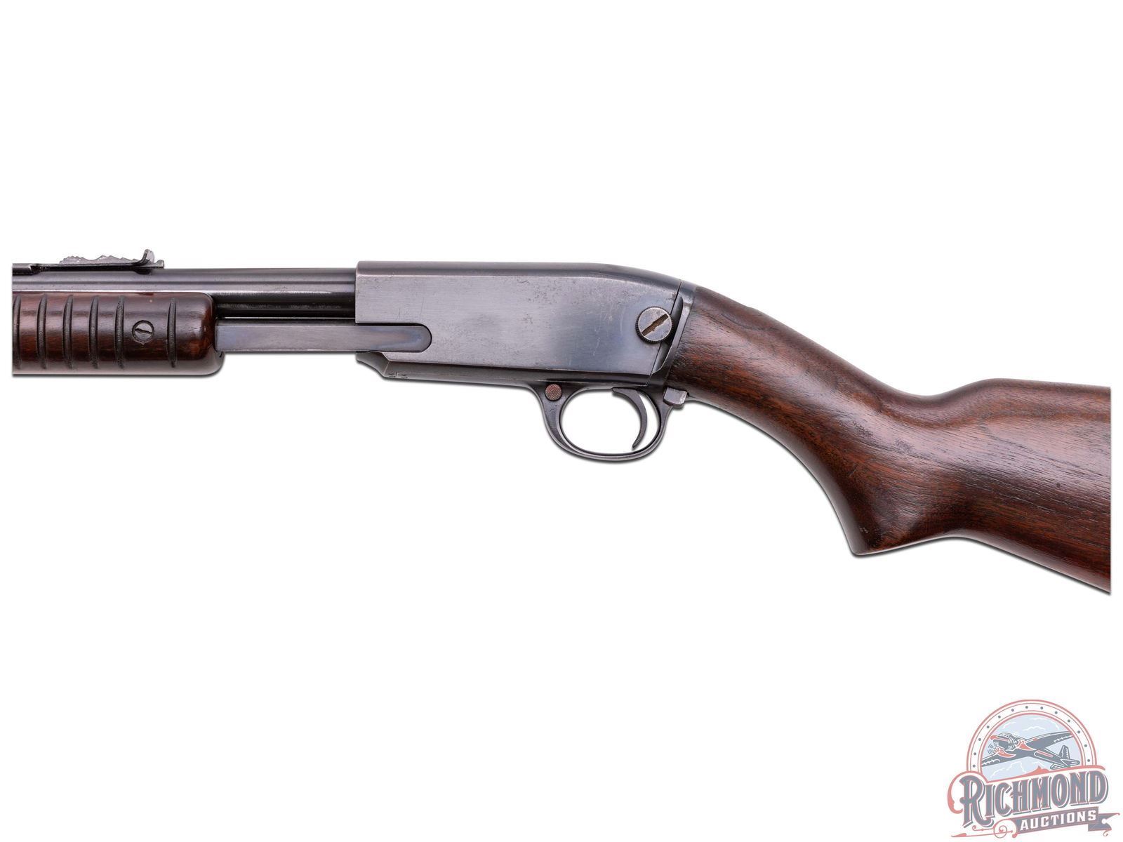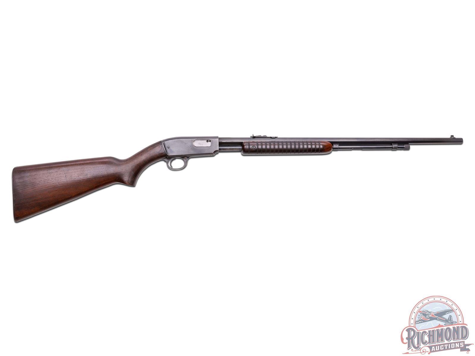 Manufactured in 1950. Features a 24" blued round barrel with factory rear notch sight with elevator and blade front sight. Factory correct stampings and Winchester proof marks. Under barrel tubular magazine and side ejecting port. Blued receiver with the iconic model 61 take-down screw. Smooth walnut wood butt stock with pistol grip and 17-line ribbed forearm. Fitted with a metal checkered butt plate. LOP: 13-1/4". CALIBER: 22 S/L/LR. S/N: 143814. FFL STATUS: Curio & Relic.