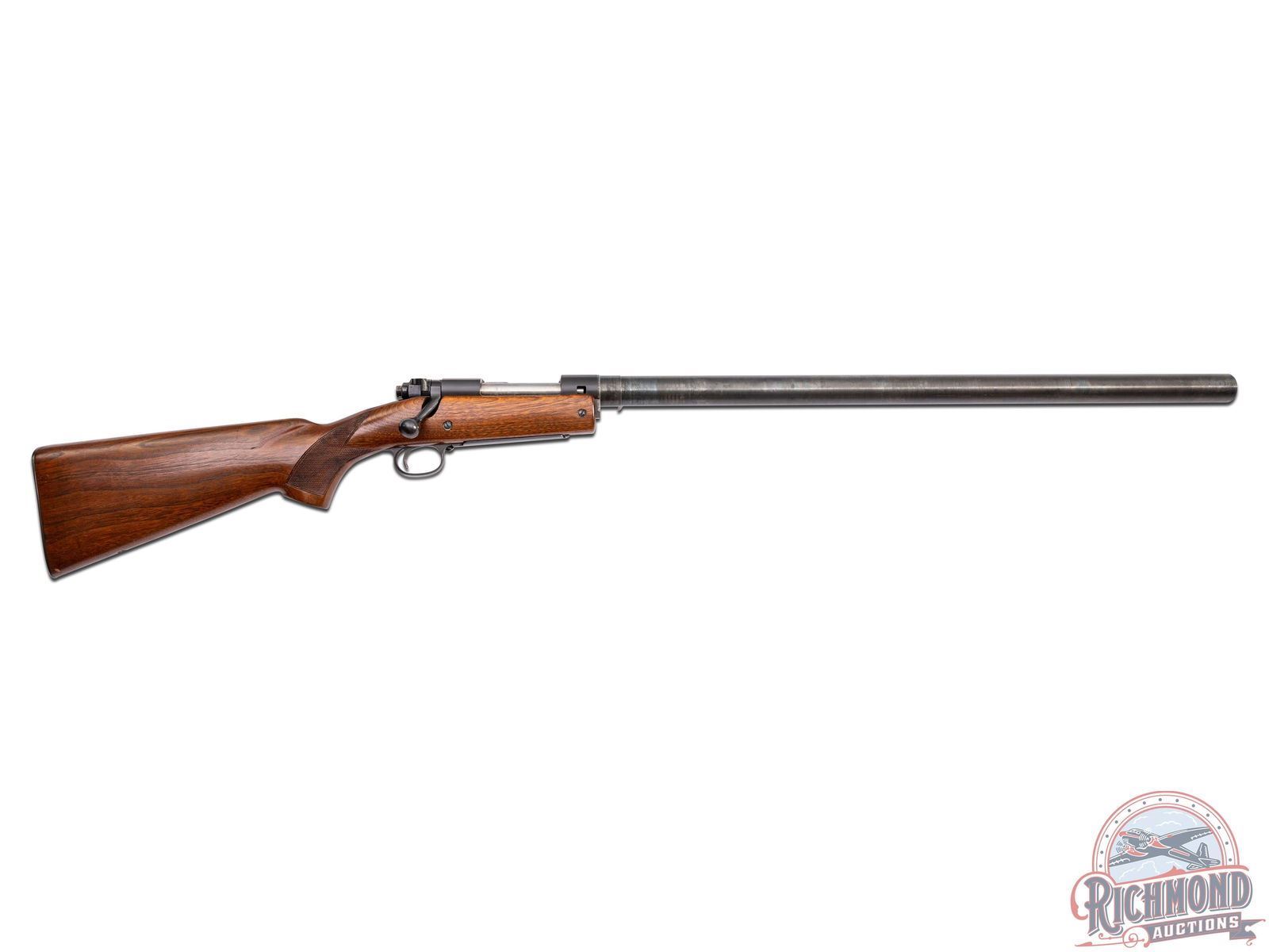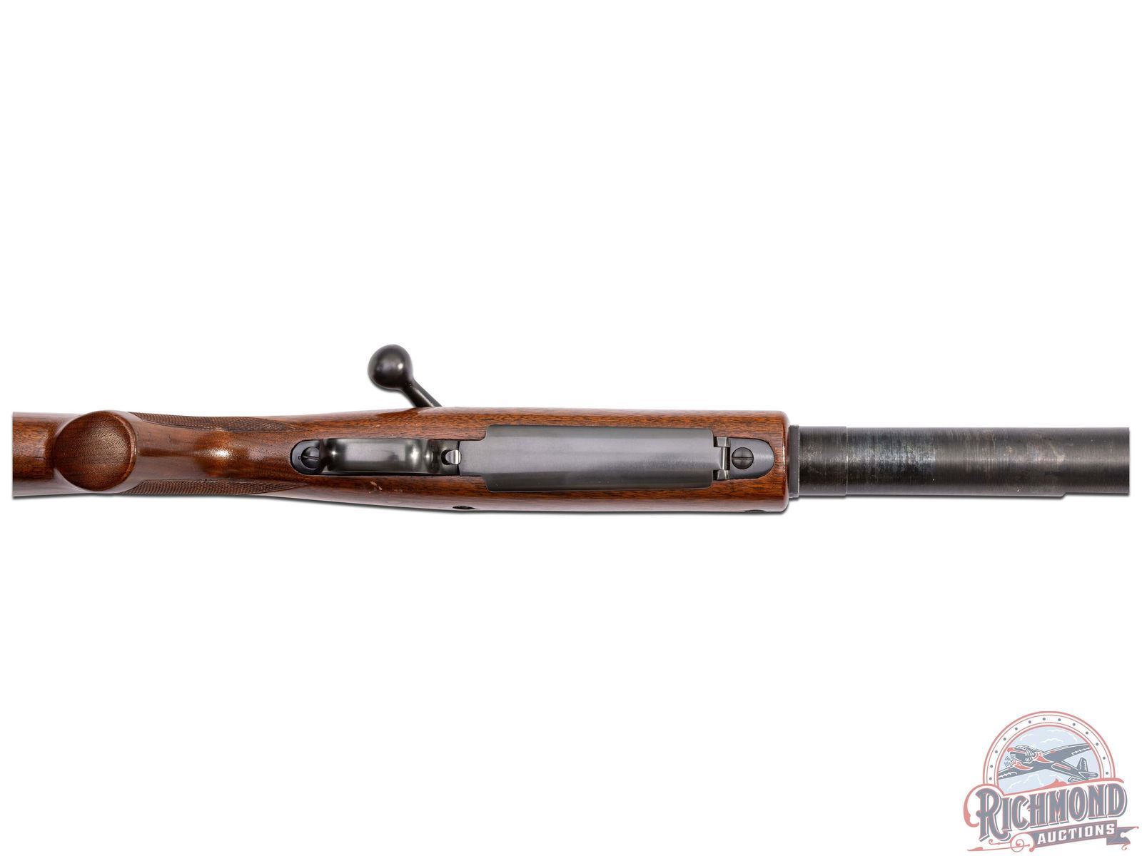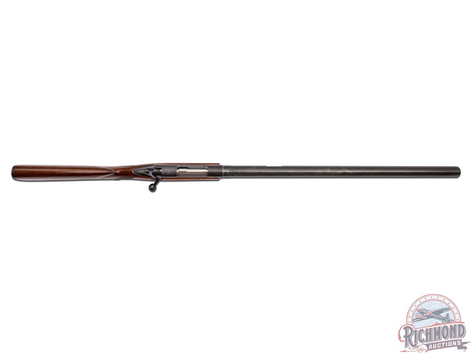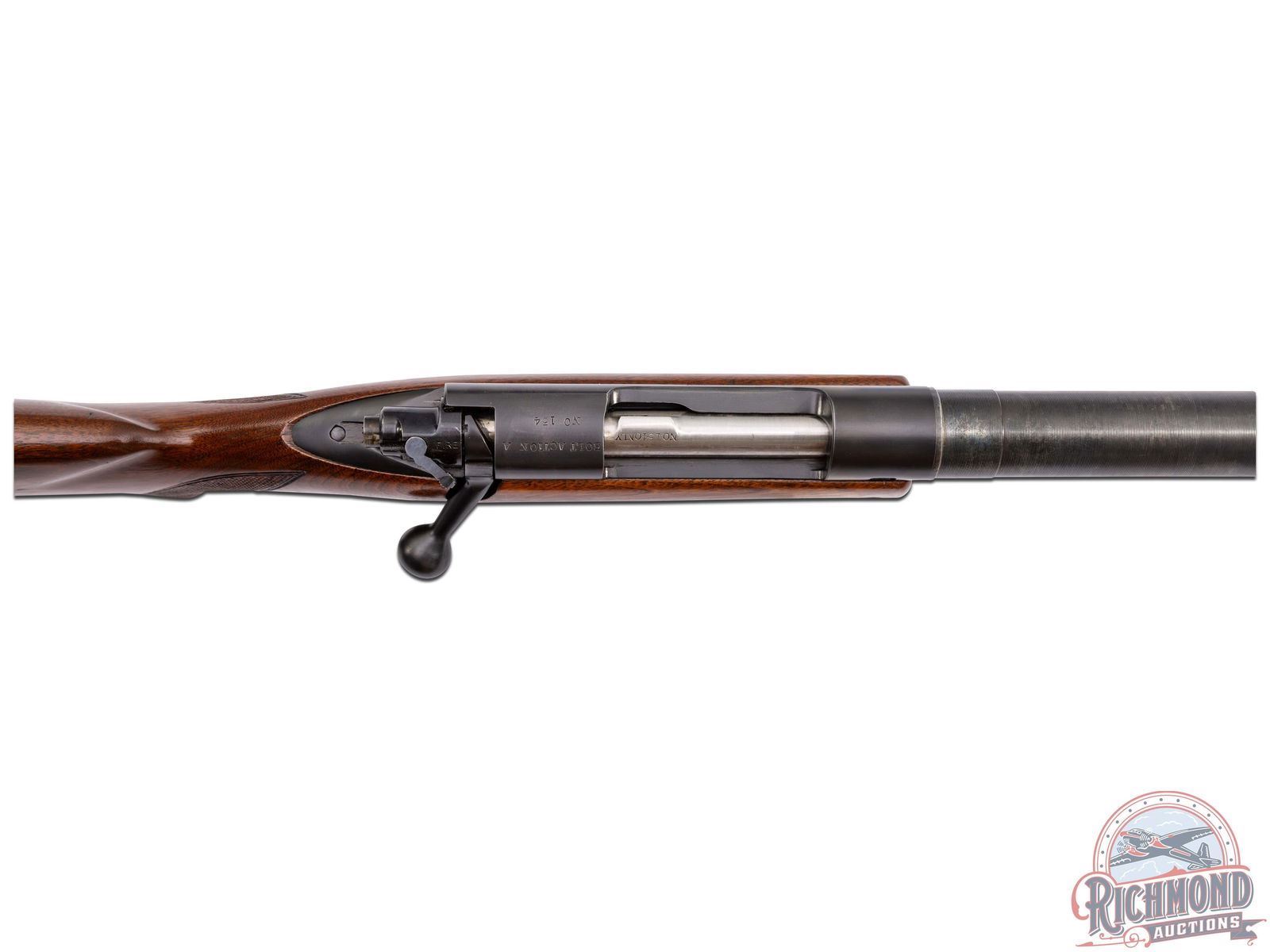 This is the rarest of the rare for a serious Pre-64 Model 70 collector. This rifle is a one of a kind documented factory test rifle for the 358 Winchester caliber marketed by Winchester in 1955 - 1956 in the Model 88 and 70 rifles. Rifle has 27-1/2" long and 1-1/4" diameter barrel with no sights and taper. Barrel is machine finished and stamped "A Action/.358/128". Barrel is fitted on standard Model 70 blued action with rear bridge marked "Bolt Action A/No. 154". Bolt of action is stripped and marked "No 154 Only". Action has standard solid matted finish bolt handle with three position safety and standard blued steel detachable floorplate. Walnut hand checkered low comb pistol grip stock with Winchester blued checkered steel butt plate. Rifle is pictured in the "Rifleman's Rifle" on page 305, photographs 9-41 and is listed as belonging to author Roger C. Rule. CALIBER: 358 WIN. S/N: 154. FFL STATUS: Curio & Relic.