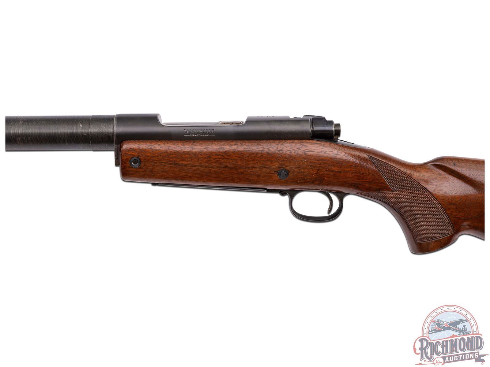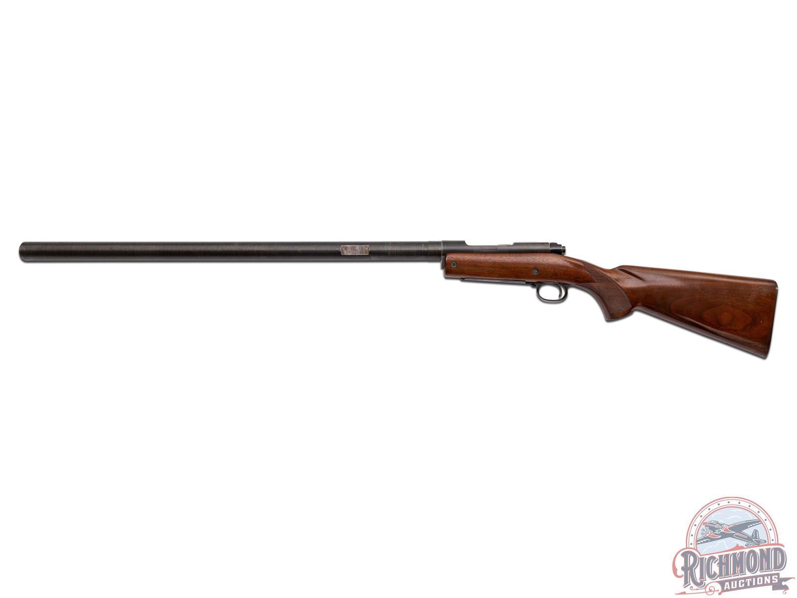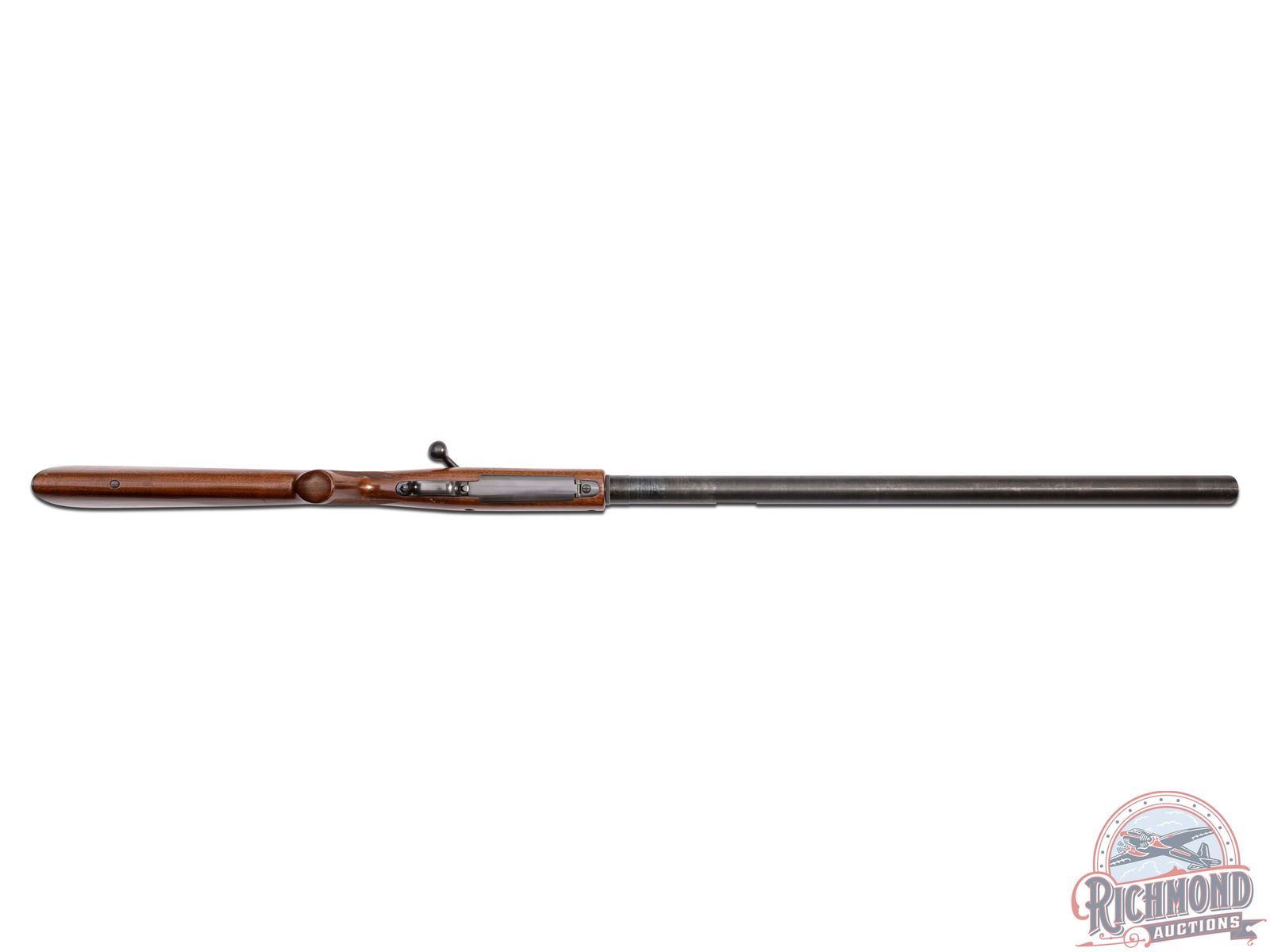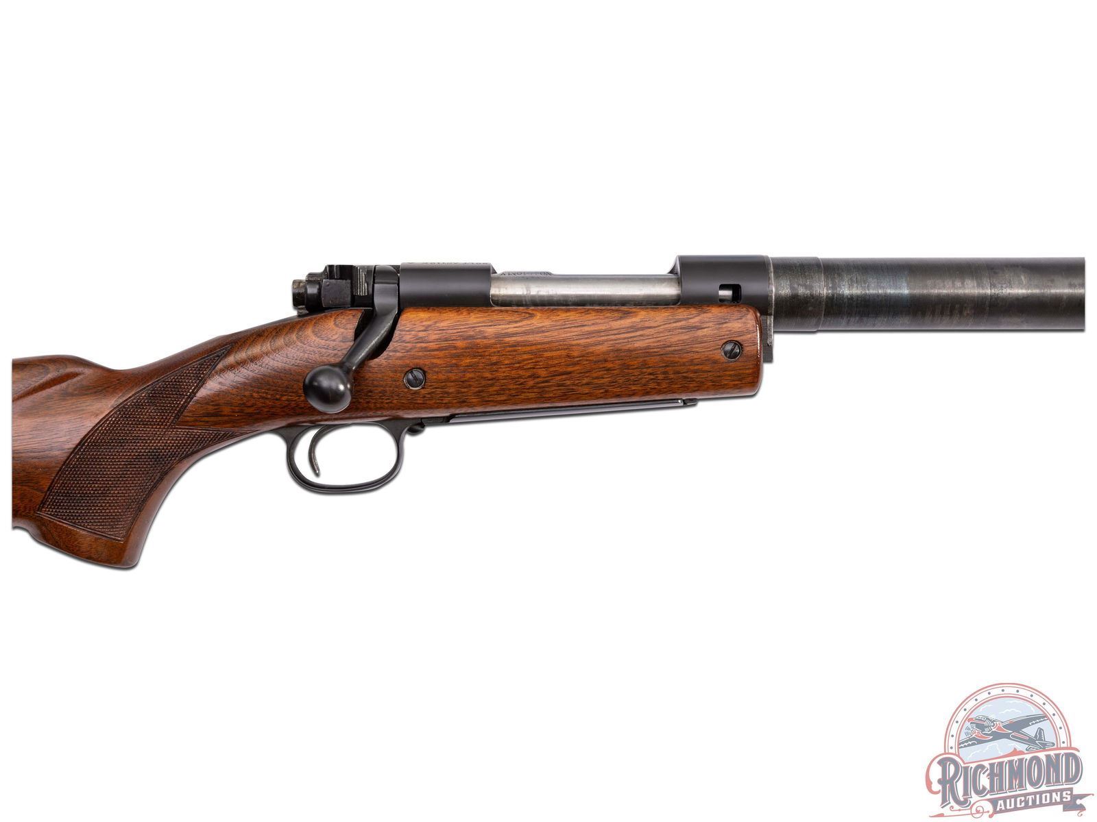 This is the rarest of the rare for a serious Pre-64 Model 70 collector. This rifle is a one of a kind documented factory test rifle for the 358 Winchester caliber marketed by Winchester in 1955 - 1956 in the Model 88 and 70 rifles. Rifle has 27-1/2" long and 1-1/4" diameter barrel with no sights and taper. Barrel is machine finished and stamped "A Action/.358/128". Barrel is fitted on standard Model 70 blued action with rear bridge marked "Bolt Action A/No. 154". Bolt of action is stripped and marked "No 154 Only". Action has standard solid matted finish bolt handle with three position safety and standard blued steel detachable floorplate. Walnut hand checkered low comb pistol grip stock with Winchester blued checkered steel butt plate. Rifle is pictured in the "Rifleman's Rifle" on page 305, photographs 9-41 and is listed as belonging to author Roger C. Rule. CALIBER: 358 WIN. S/N: 154. FFL STATUS: Curio & Relic.