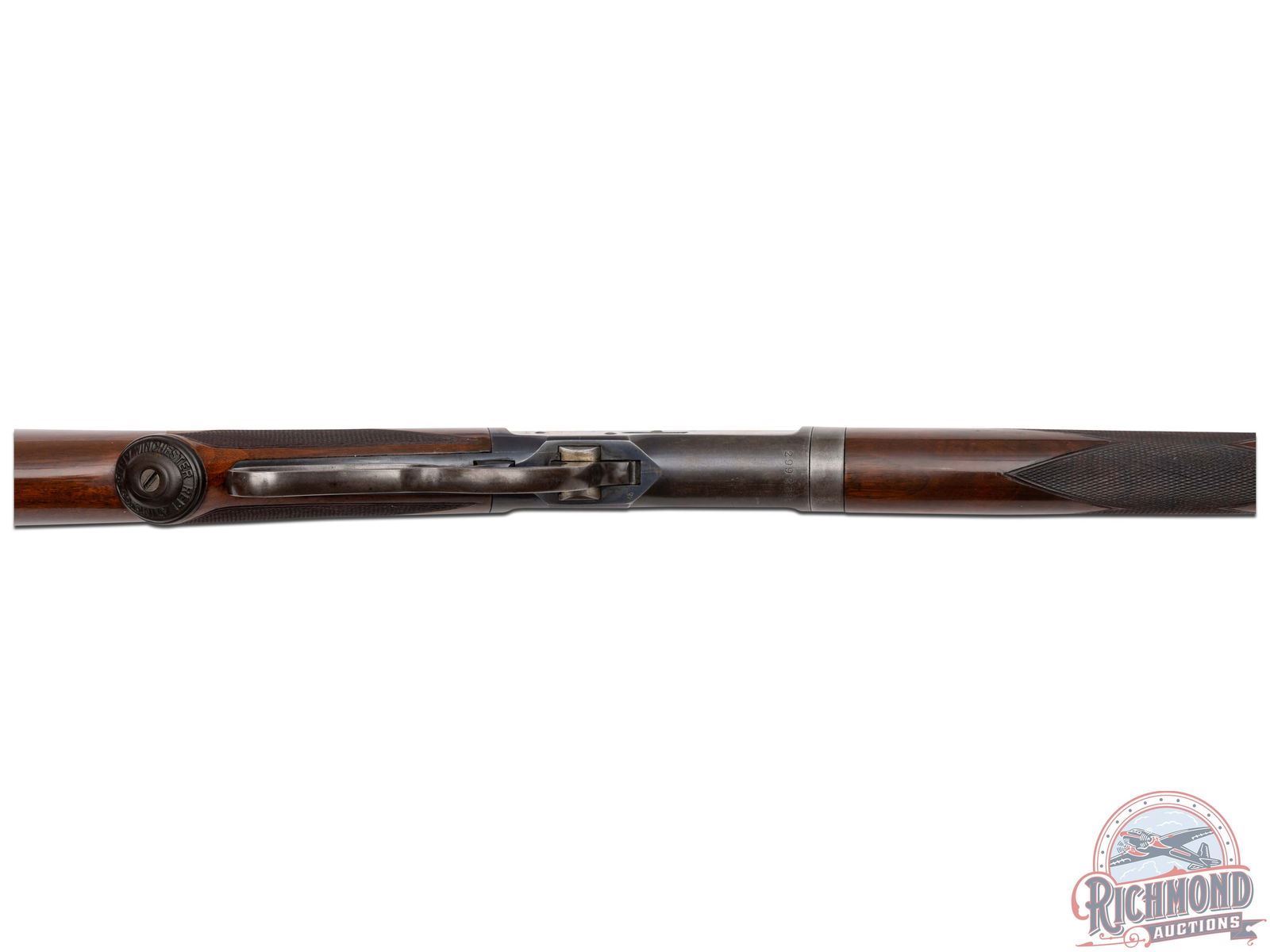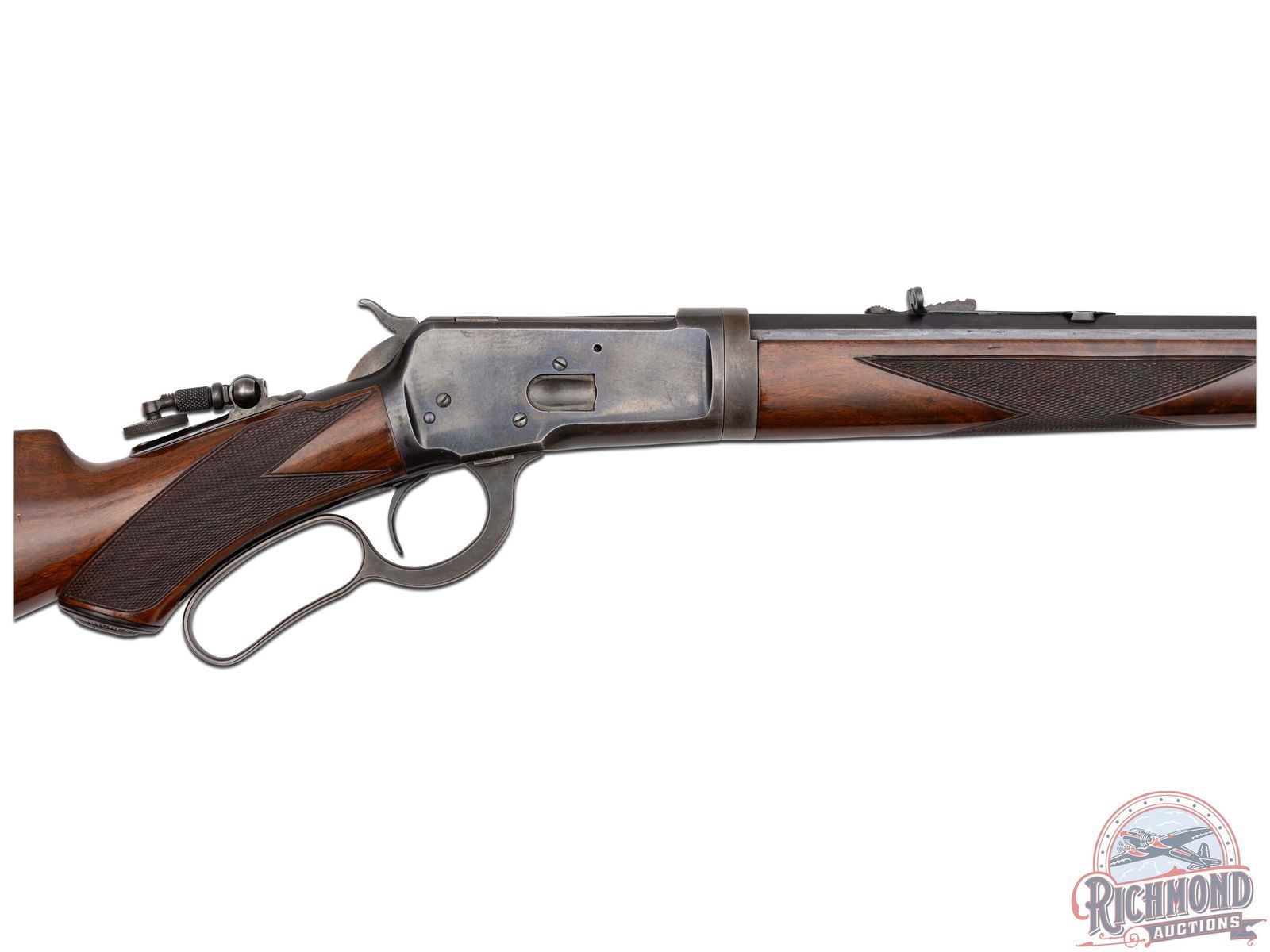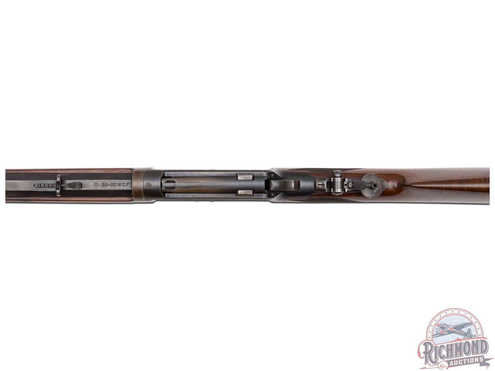 Made by Winchester Repeating Arms Company in 1908. Winchester 1892 Deluxe rifles are very desirable and hard to find in this condition with this many special order options. Rifle is fitted with special ordered blued Winchester Steel half octagon barrel in 25-20 Repeater caliber with Winchester two line address, Lyman combination Beech front sight, 22G rear sight and Lyman rear tang peep with disc cups. Blued takedown receiver with plain trigger and blued 1/2 magazine. Select Deluxe walnut checkered pistol grip stock with shotgun butt. Fitted with Winchester hard rubber Widow's Peak butt plate and Winchester grip cap. Matching checkered walnut forearm with blued forearm cap. Seven special order features, all confirmed with companion Cody Research Letter. CALIBER: 25-20 W.C.F. S/N: 299258. FFL STATUS: Curio & Relic.