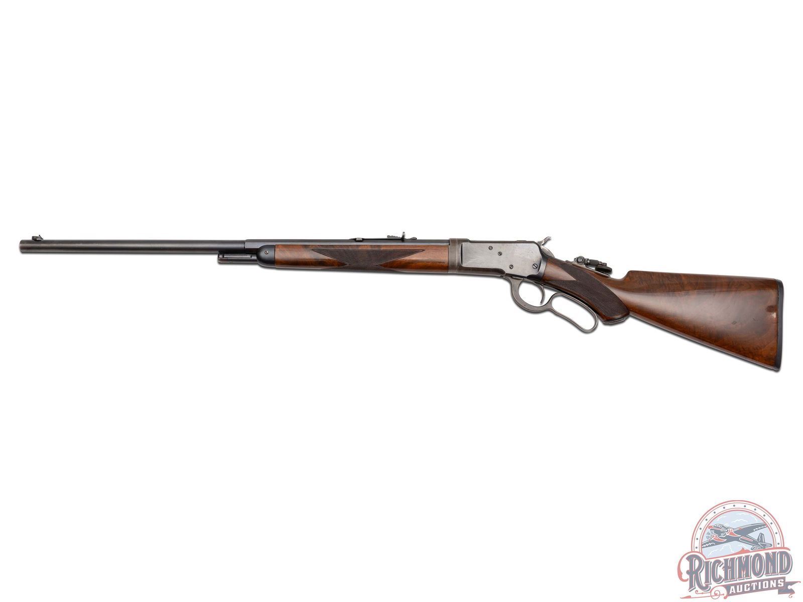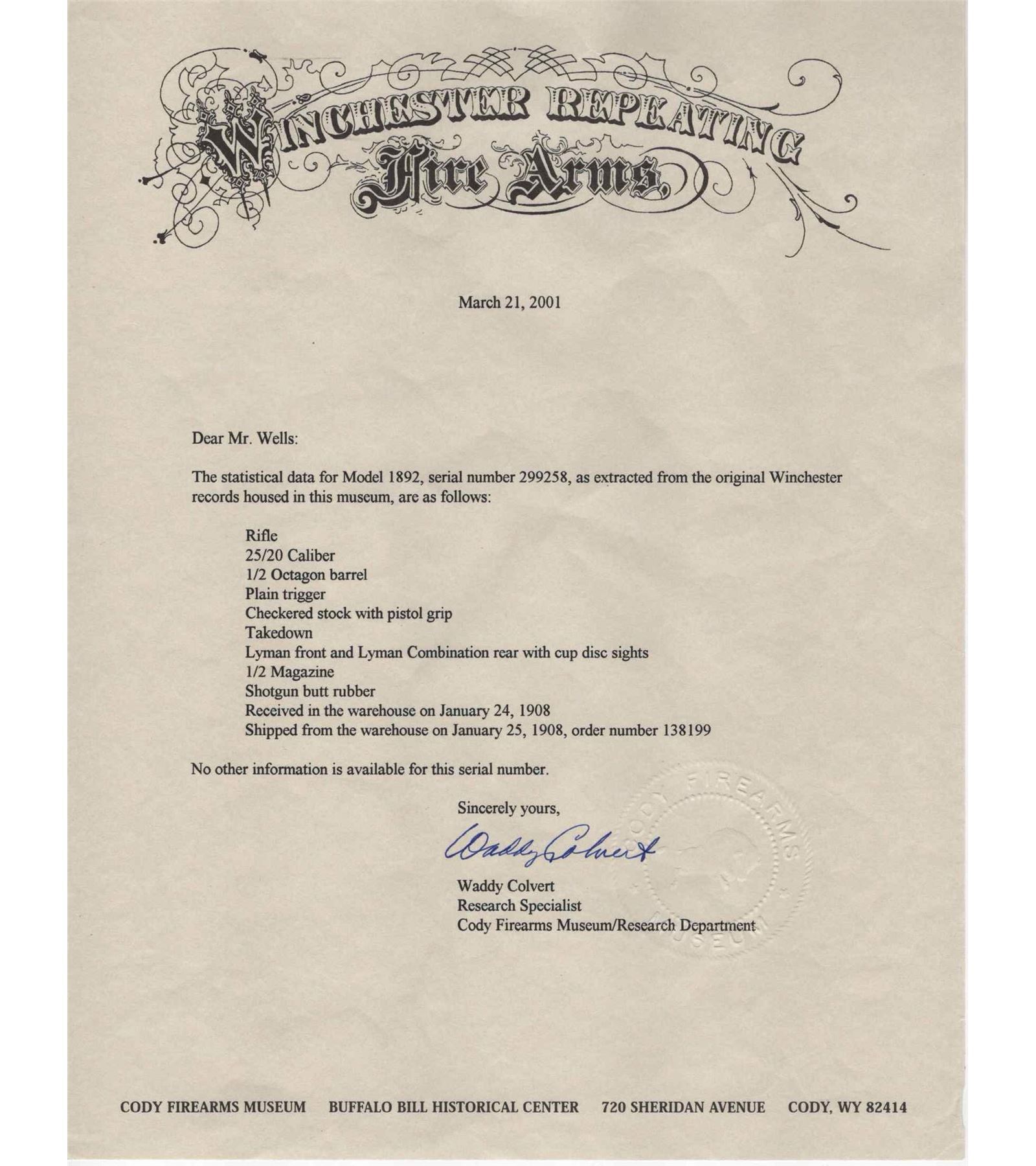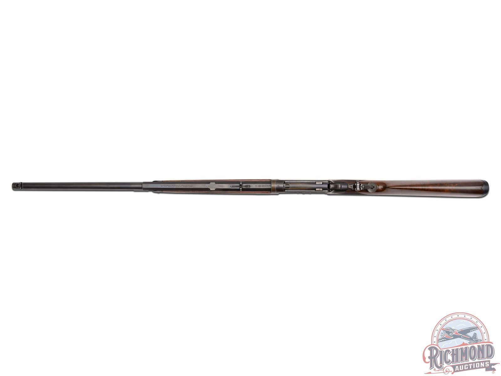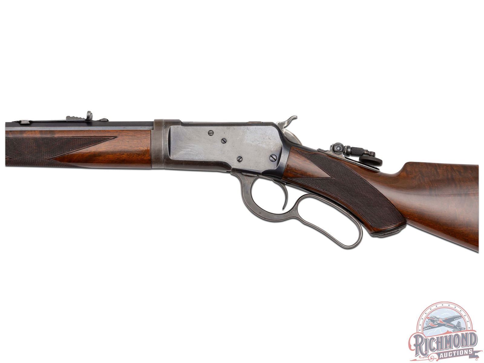 Made by Winchester Repeating Arms Company in 1908. Winchester 1892 Deluxe rifles are very desirable and hard to find in this condition with this many special order options. Rifle is fitted with special ordered blued Winchester Steel half octagon barrel in 25-20 Repeater caliber with Winchester two line address, Lyman combination Beech front sight, 22G rear sight and Lyman rear tang peep with disc cups. Blued takedown receiver with plain trigger and blued 1/2 magazine. Select Deluxe walnut checkered pistol grip stock with shotgun butt. Fitted with Winchester hard rubber Widow's Peak butt plate and Winchester grip cap. Matching checkered walnut forearm with blued forearm cap. Seven special order features, all confirmed with companion Cody Research Letter. CALIBER: 25-20 W.C.F. S/N: 299258. FFL STATUS: Curio & Relic.