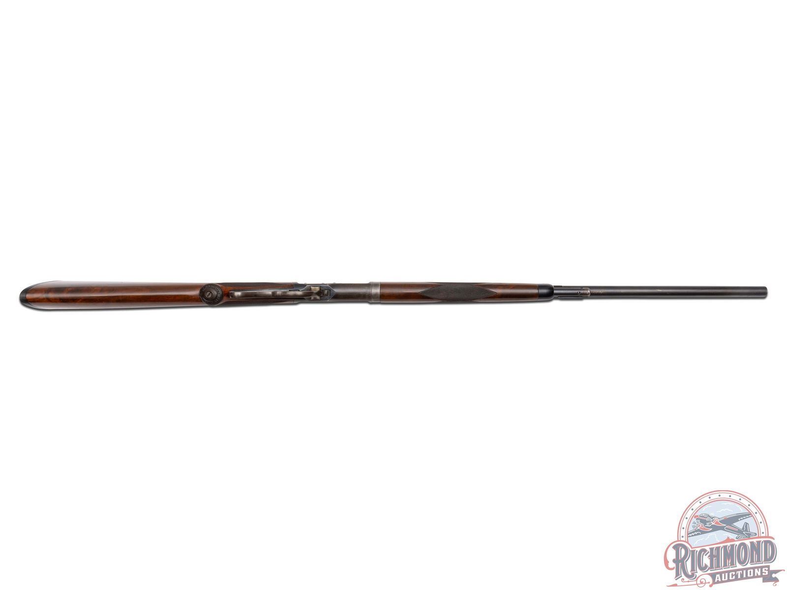 Overall 98% original barrel blue with slight case wear at muzzle and some marks from disassembly near takedown lever. Action has 95% original blue with carry area wear. 98% original Piano Finish stock varnish with sharp original checkering. Butt plate is a replacement. Rifle has no visible restoration and is in super hard-to-find condition. Excellent bore and mechanics. A true collection quality gun.