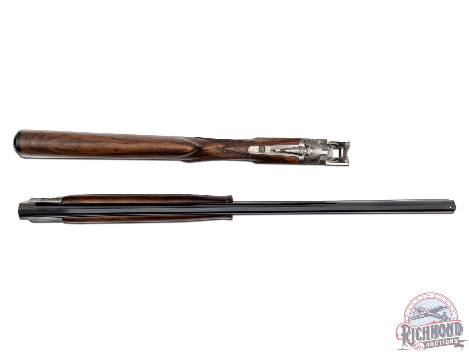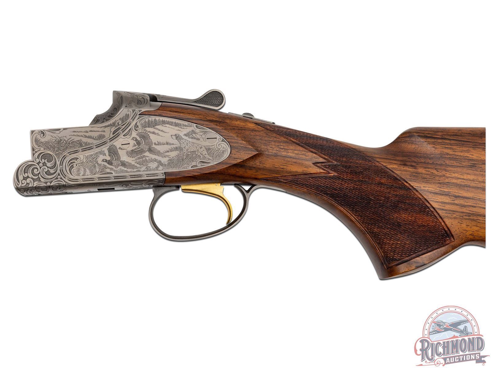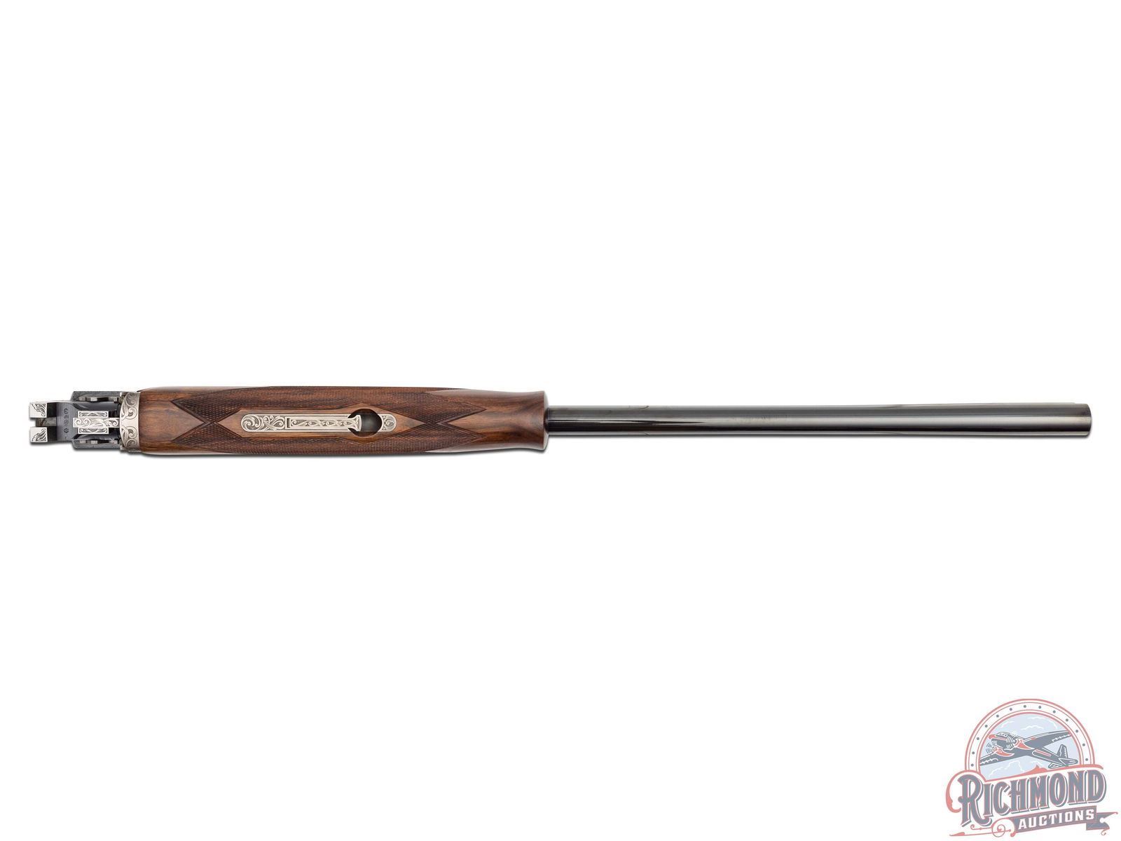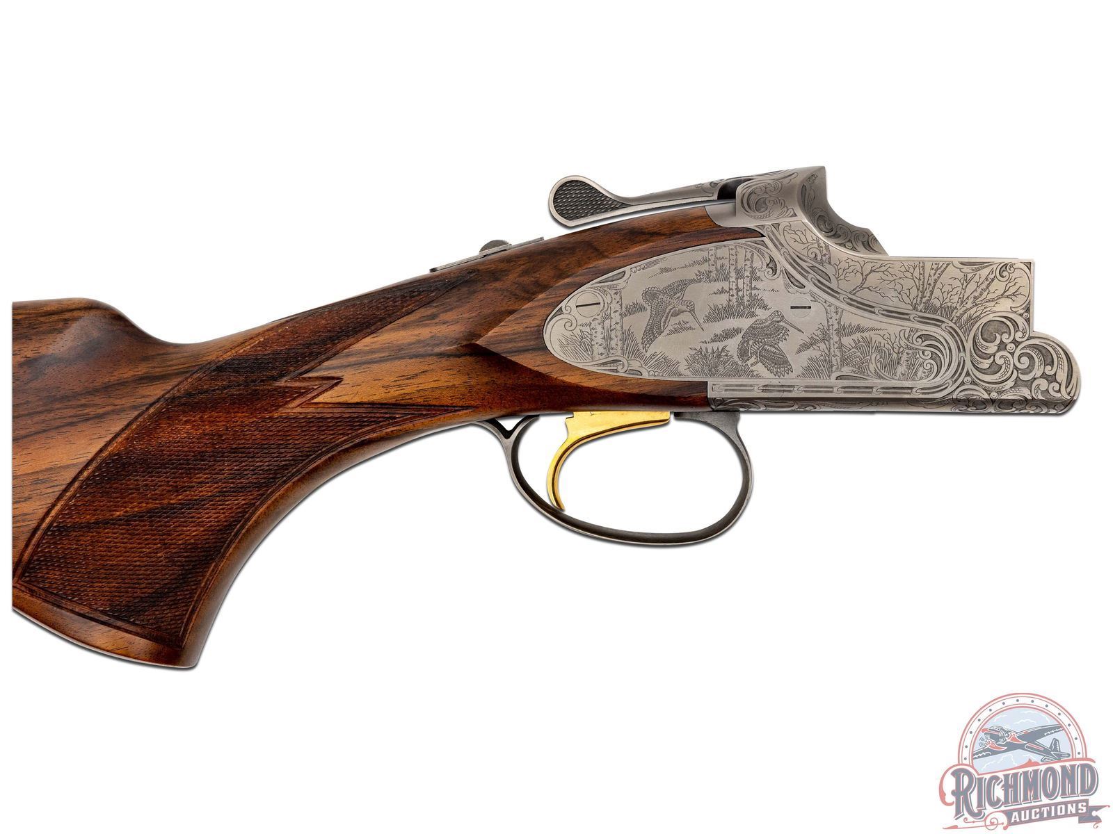 Manufactured in 2001. O/U with standard markings on the barrel. Matching serials on the frame, barrel and forearm. 26" barrels with full vent rib and white bead front sight. Coin finished frame with factory game scene engraving, with 95% coverage. Woodcocks in flight on the right side of the frame with a pointer dog and pheasants on the left. "Privilege" in script on the underside. Nicely oiled walnut stock and forearm with fine checkering on the wrist and forearm. Factory black rubber butt pad. Gold washed single trigger. Tang safety and selector, with ejectors on the barrel. 3" chambers. Invector choke tubes with full, improved cylinder, cylinder, skeet and modified tubes included. Includes serial matching box, manual, lock and choke tube wrench. LOP: 14-1/4". DAC: 1-1/4". DAH: 2-1/2". CALIBER: 20 GA. S/N: 17532MZ131. FFL STATUS: Modern.