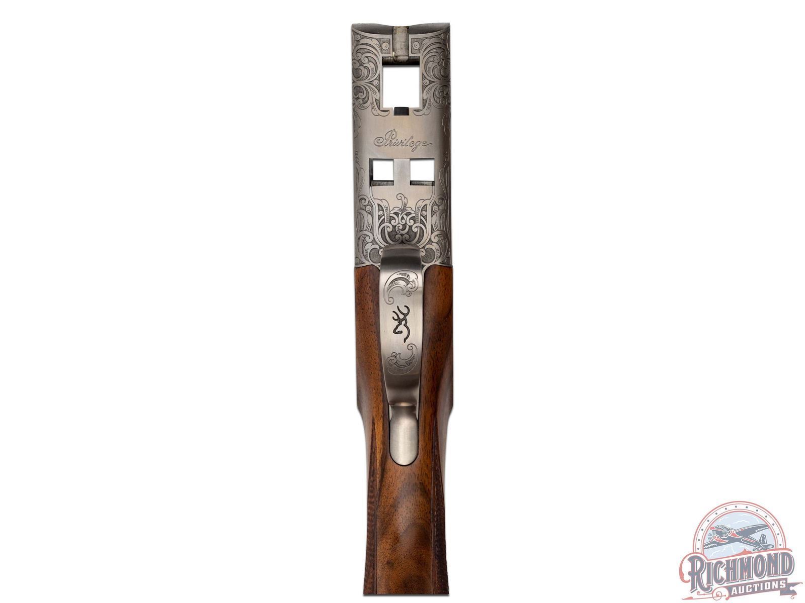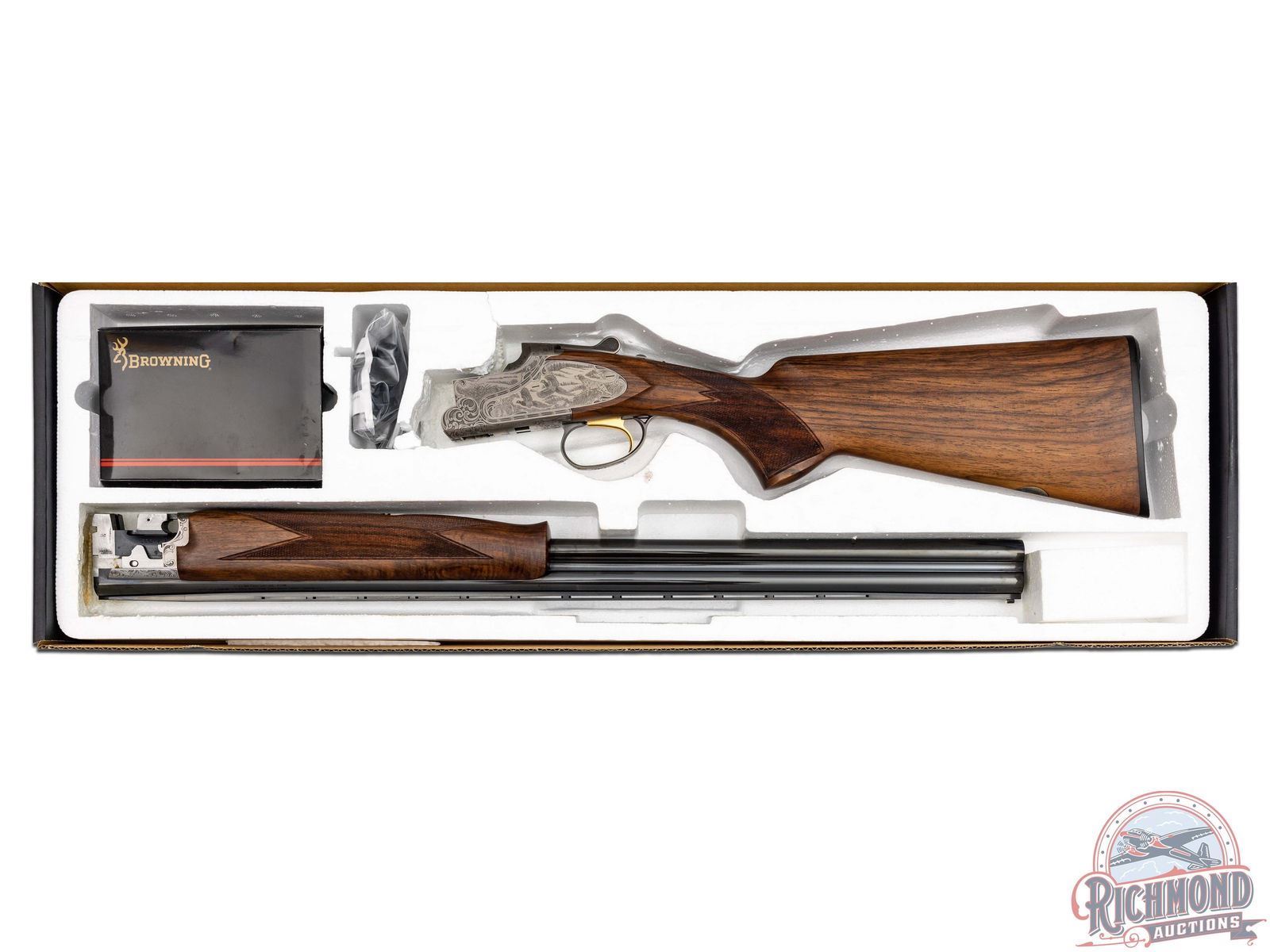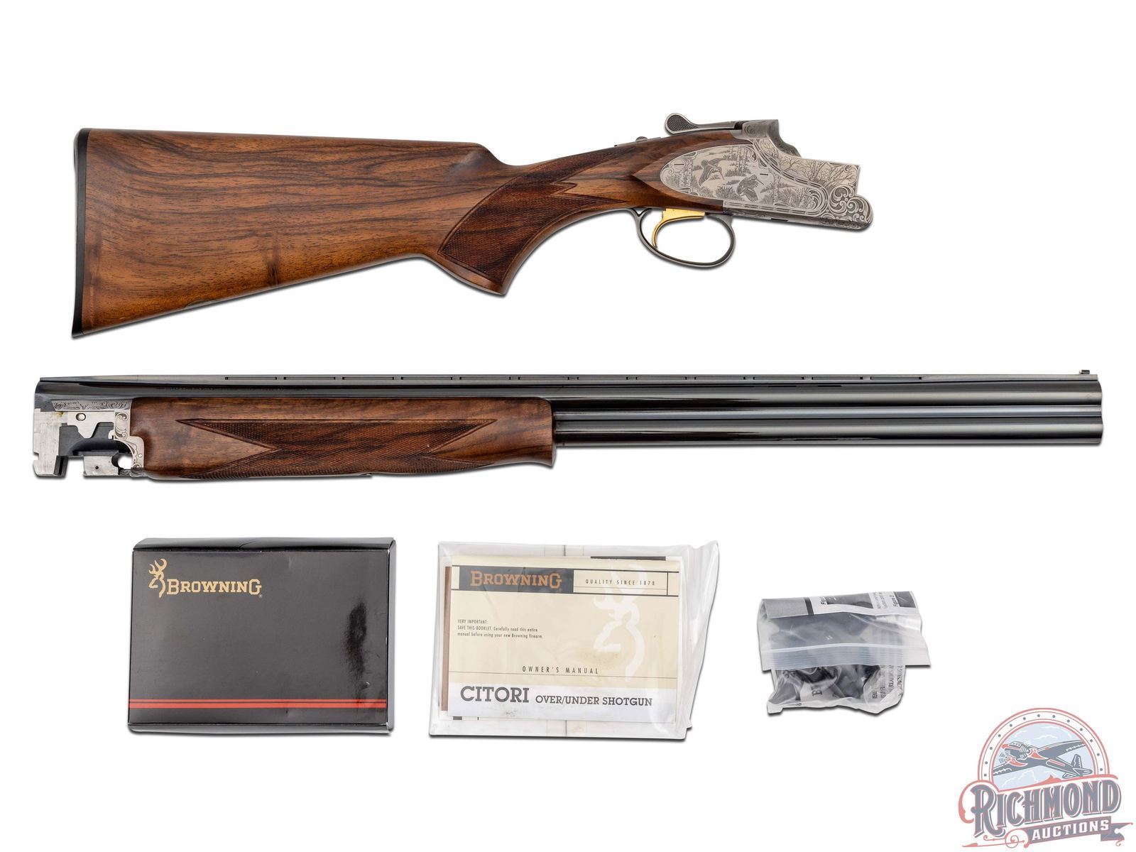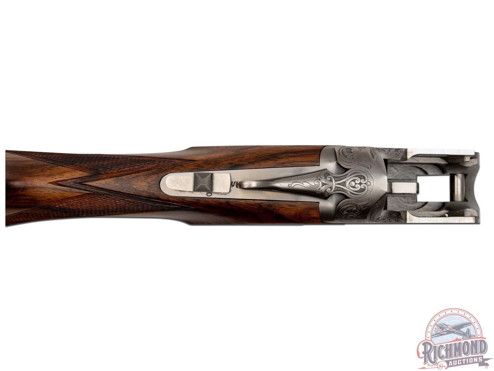 Manufactured in 2001. O/U with standard markings on the barrel. Matching serials on the frame, barrel and forearm. 26" barrels with full vent rib and white bead front sight. Coin finished frame with factory game scene engraving, with 95% coverage. Woodcocks in flight on the right side of the frame with a pointer dog and pheasants on the left. "Privilege" in script on the underside. Nicely oiled walnut stock and forearm with fine checkering on the wrist and forearm. Factory black rubber butt pad. Gold washed single trigger. Tang safety and selector, with ejectors on the barrel. 3" chambers. Invector choke tubes with full, improved cylinder, cylinder, skeet and modified tubes included. Includes serial matching box, manual, lock and choke tube wrench. LOP: 14-1/4". DAC: 1-1/4". DAH: 2-1/2". CALIBER: 20 GA. S/N: 17532MZ131. FFL STATUS: Modern.