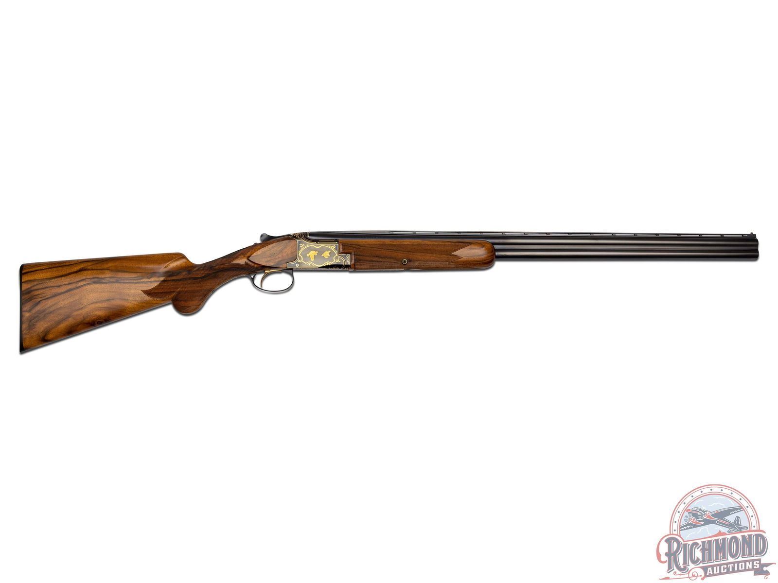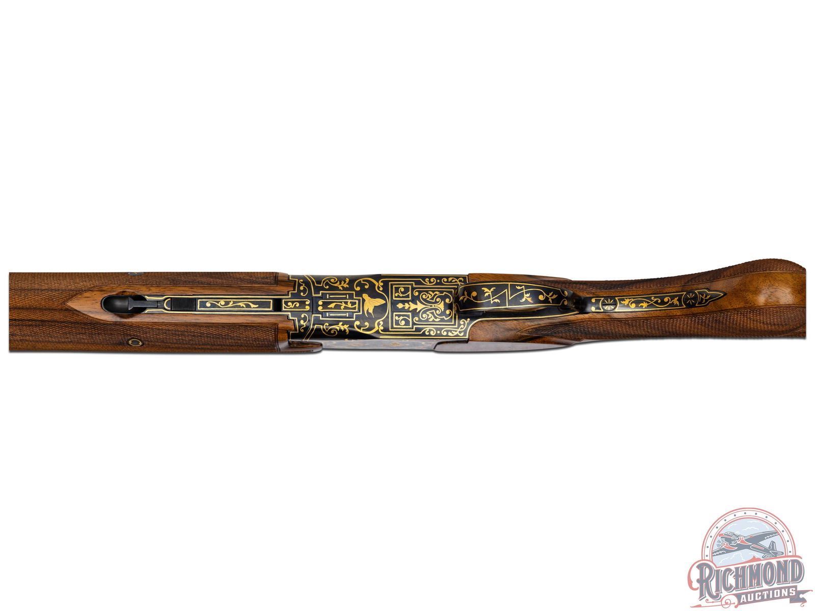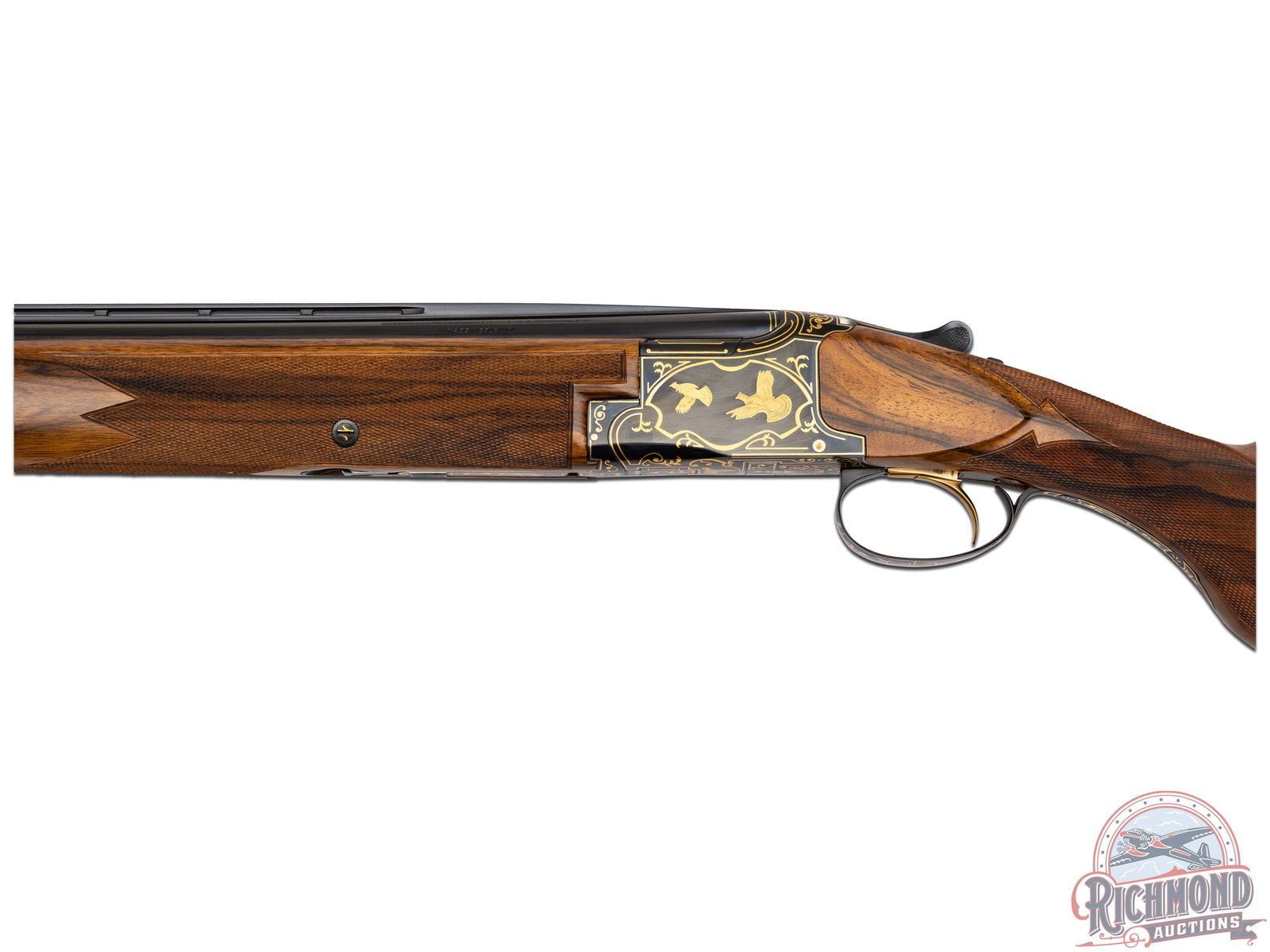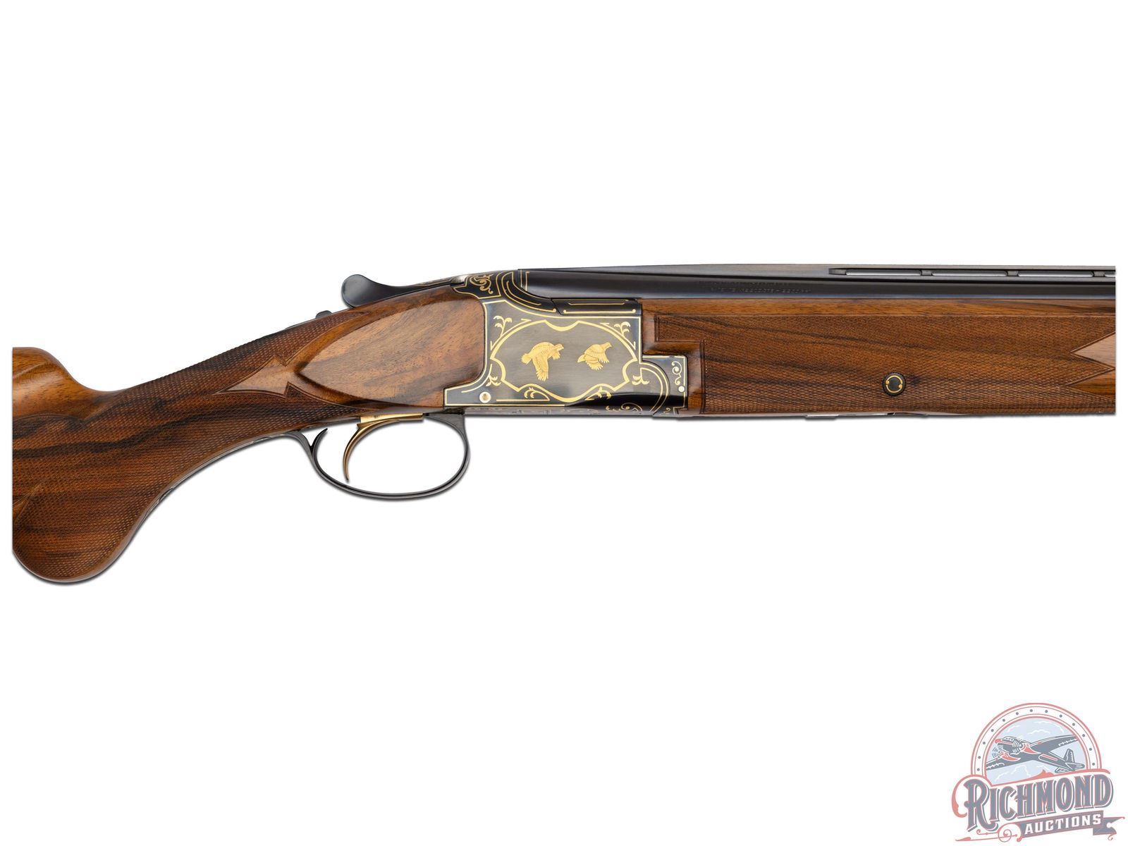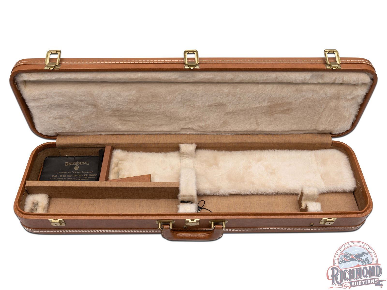 Manufactured in 1964 for Browning by FN in Belgium. Blued 28" O/U steel barrels with ventilated rib, single bead with fixed modified and improved cylinder and 3" chamber and ejectors. Blued action and barrel done by Paul Fuch, formally of Browning's Repair & Restoration Shop in St. Louis, Missouri. The action and barrels are engraved and inlayed in 24 kt gold in Browning Exhibition Forum by Jimmy Nixon. gold-plated single trigger with top tang safety selector. Gun is fitted with standard Browning Exhibition Form checkered round knob pistol grip and Browning hard rubber butt plate. English walnut stock fitted by Jack Haugh. Matching checkered sporting type forearm. Comes in original Browning luggage case with paperwork and history. This is an exceptional shotgun that would be an excellent addition to any collection. Weight: 6lbs. 6oz. LOP: 14-1/4". DAC: 1-3/8". DAH: 2-1/4". CALIBER: 20 GA. S/N: 34007V4. FFL STATUS: Curio & Relic.
